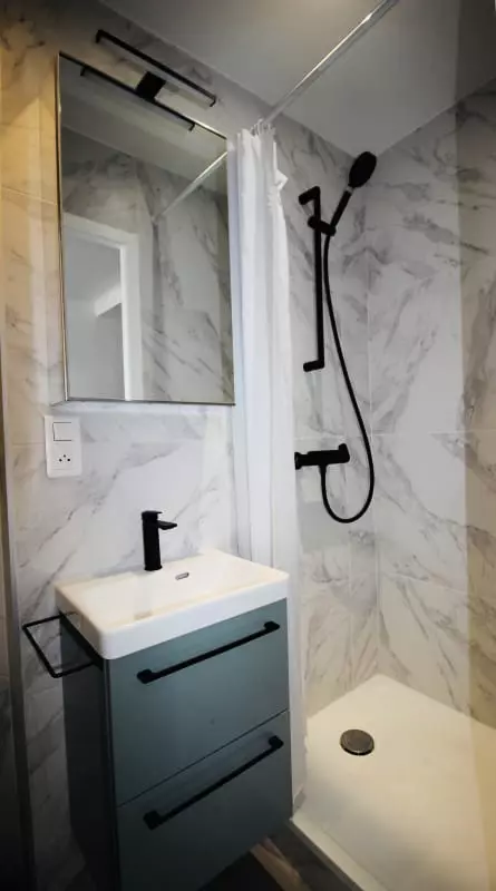 Parfaitement aménagé, le studio dispose d’un espace de vie lumineux, d’un lit double confortable, d’une cuisine entièrement équipée (plaques de cuisson, micro-ondes, vaisselle, cafetière…) et d’une salle d’eau moderne avec douche à l’italienne. La décoration sobre et élégante crée une atmosphère accueillante, propice à la détente.