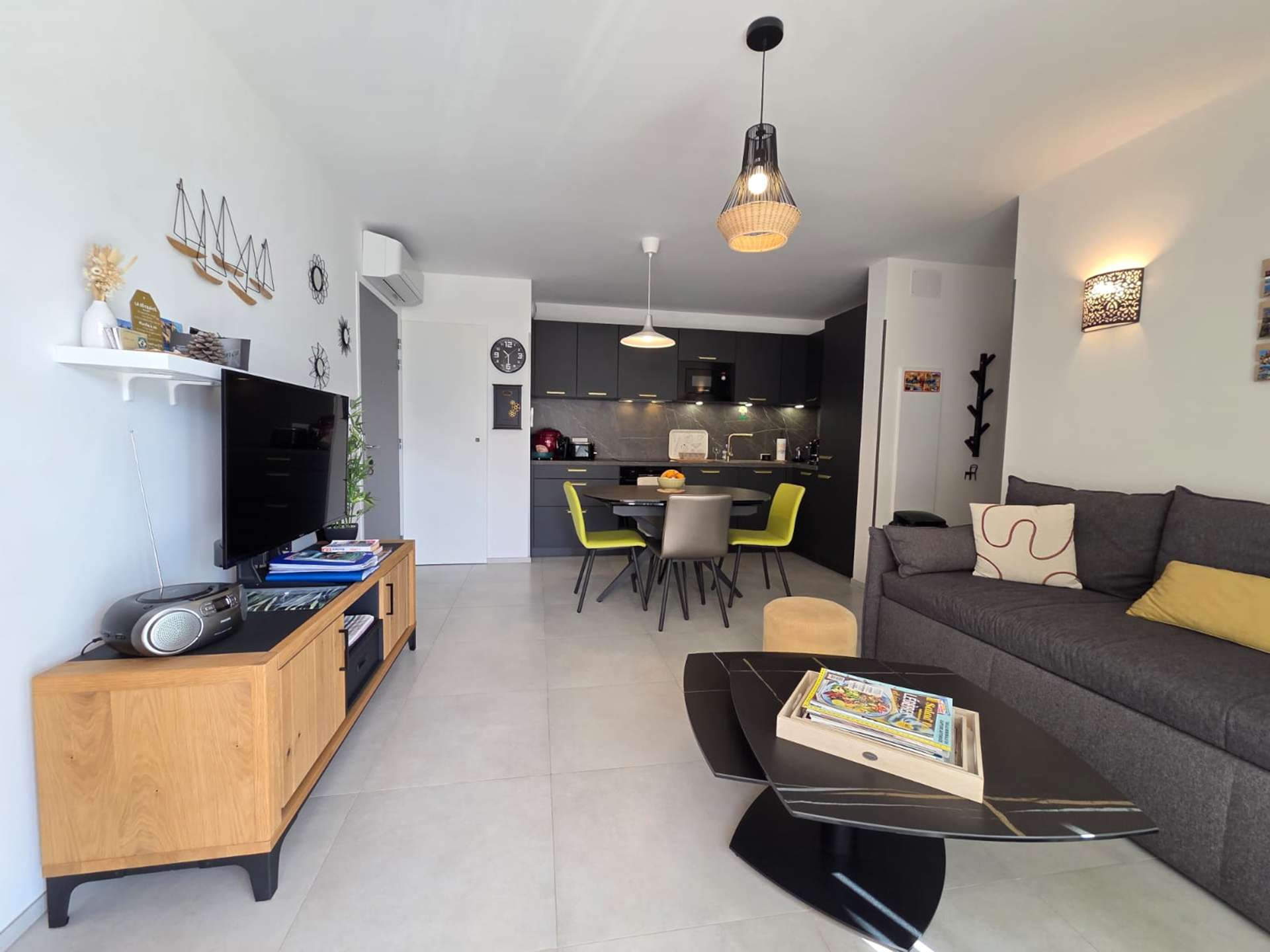 L' appartement, au niveau supérieur est composé d'une cuisine entièrement équipée, d'un salon, de deux chambres, l'une avec avec un lit double king size, l'autre avec 2 lits simples, deux salles d'eau dont une avec wc et un WC indépendant.