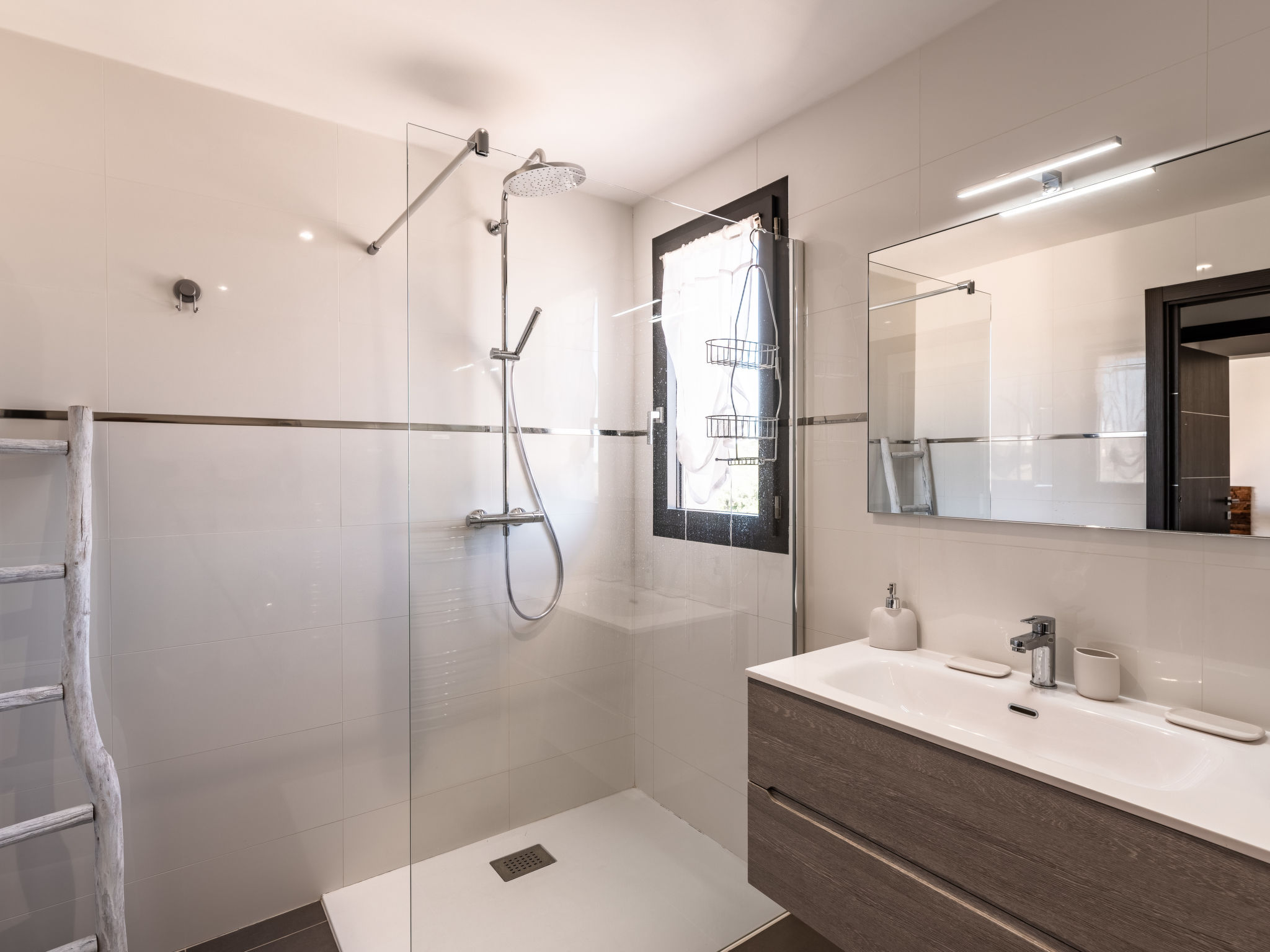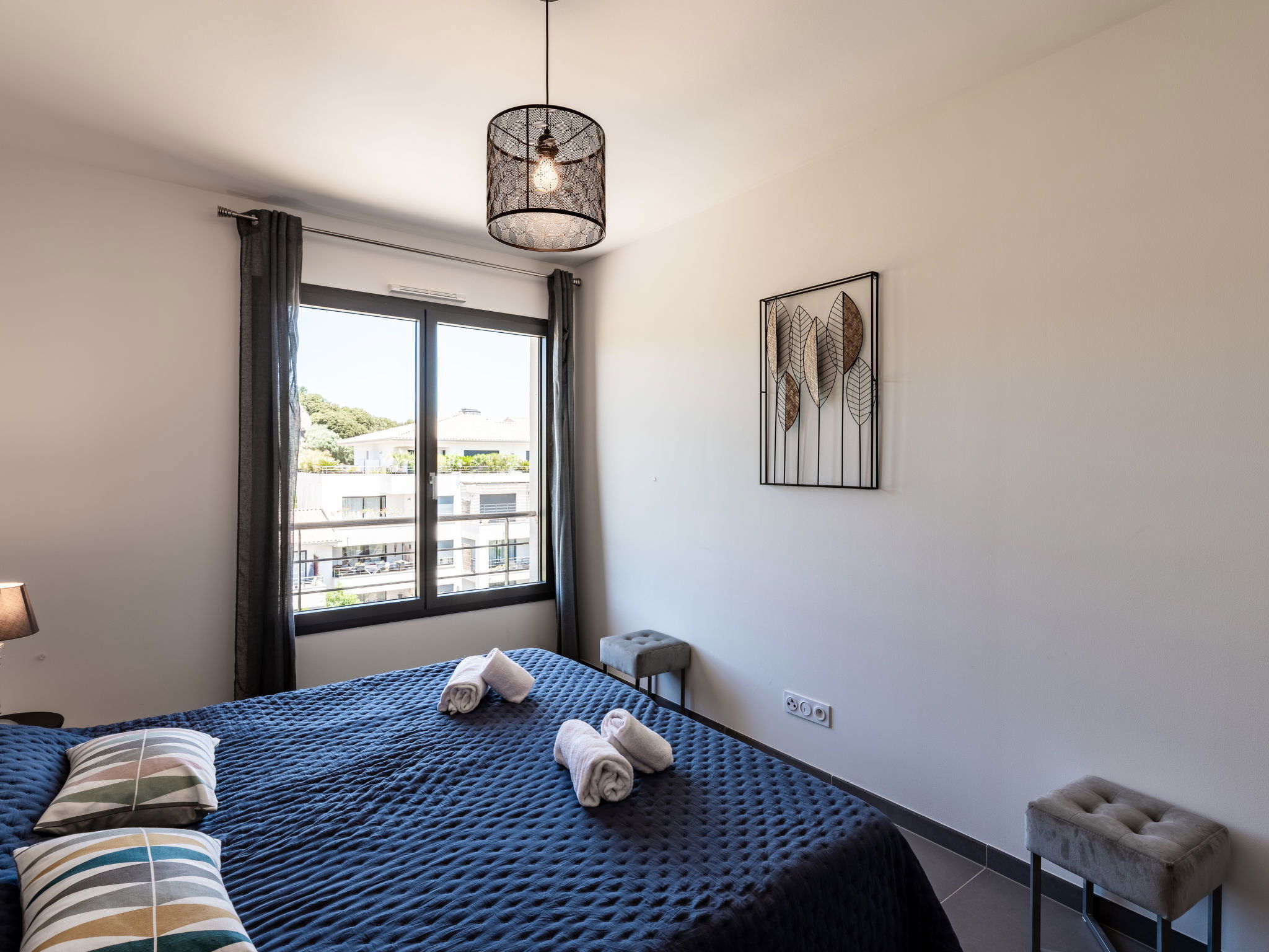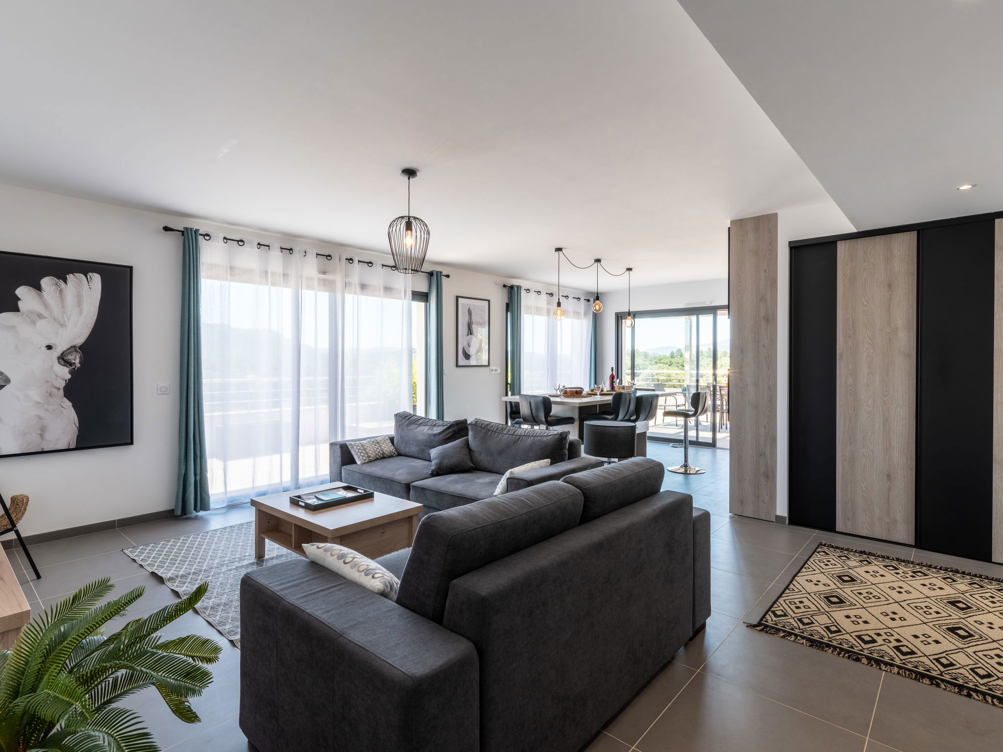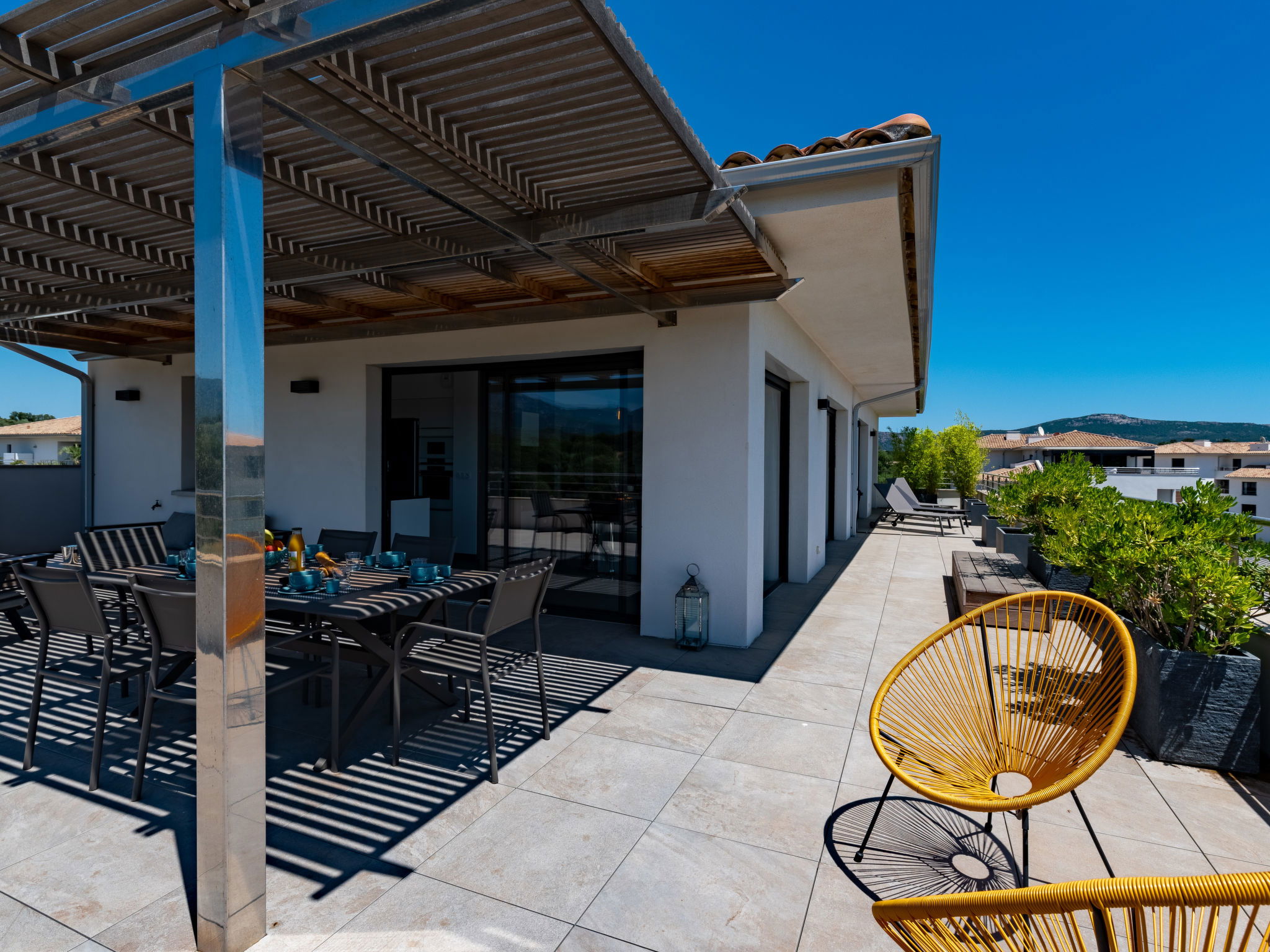 Appartement de 5 pièces 137 m2 au 3ème étage. Aménagement très agréable et moderne: séjour/salle à manger avec TV (écran plat). Sortie sur la terrasse. 1 chambre avec 1 grand-lit (160 cm, longueur 200 cm), douche. Sortie sur la terrasse. 1 chambre avec 1 grand-lit (160 cm, longueur 200 cm), douche/WC. Sortie sur la terrasse. 1 chambre avec 2 lits (90 cm, longueur 190 cm). 1 chambre avec 2 lits (90 cm, longueur 200 cm). Cuisine ouverte (four, lave-vaisselle, 3 plaques à induction, grille-pain, bouilloire électrique, micro-ondes, congélateur, cafetière électrique, Capsules pour machine à café (Tassimo)). Sortie sur la terrasse. Douche, WC séparé. Chauffage électrique, air-conditionné. Grande terrasse 120 m2. Chaises longues (2). Belle vue sur les montagnes. A disposition: lave-linge, sèche-linge, fer à repasser. Internet (Connexion WIFI, gratuit). Place de parking No 731 près de la maison. Veuillez noter: logement non-fumeur. Détecteur de fumée. Plancha. 2A2470013588E