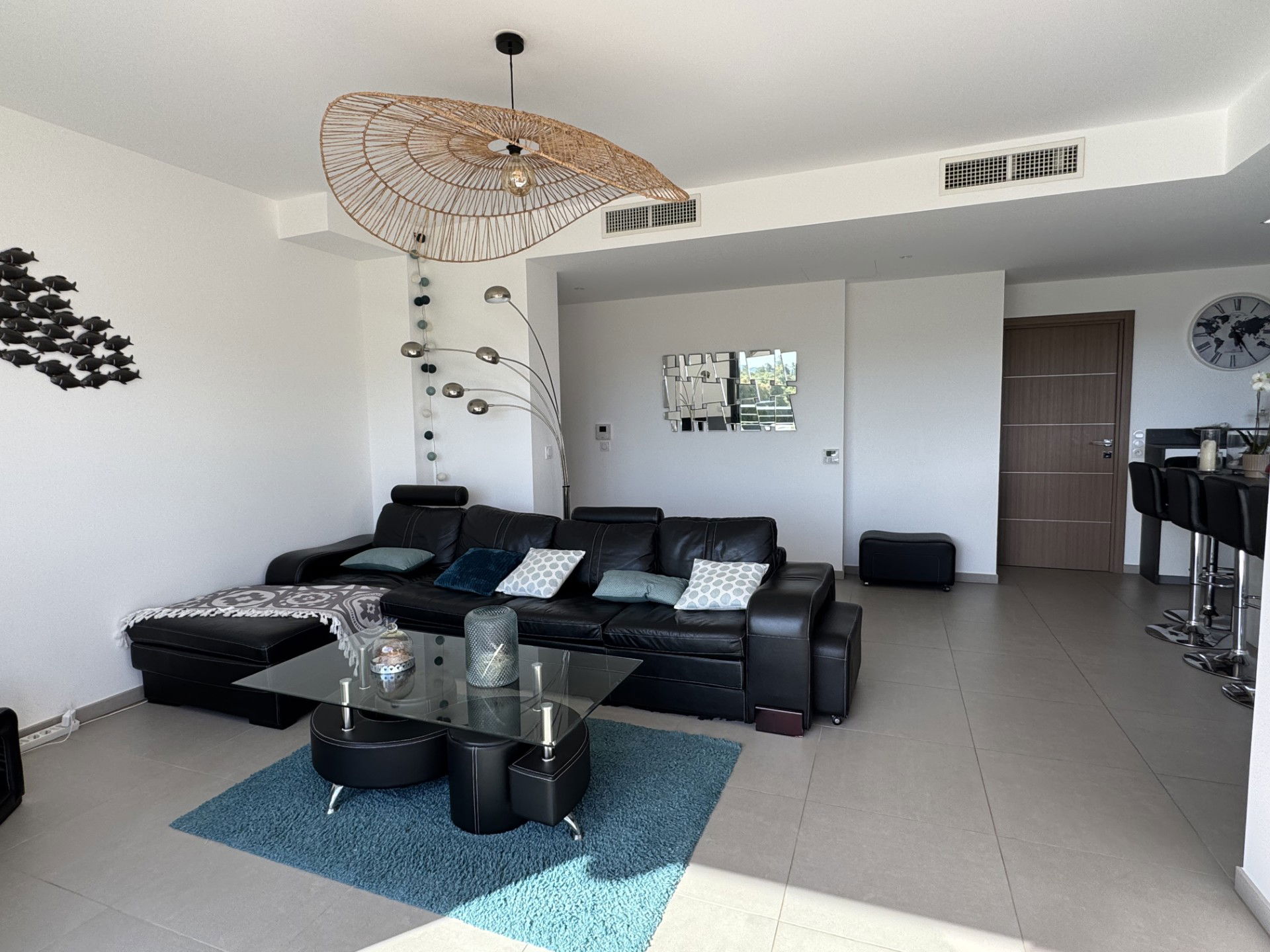 Salon très lumineux avec triple ouverture sur la terrasse. Canapé en cuir noir pouvant se transformer en couchage d’appoint, télévision, table basse.