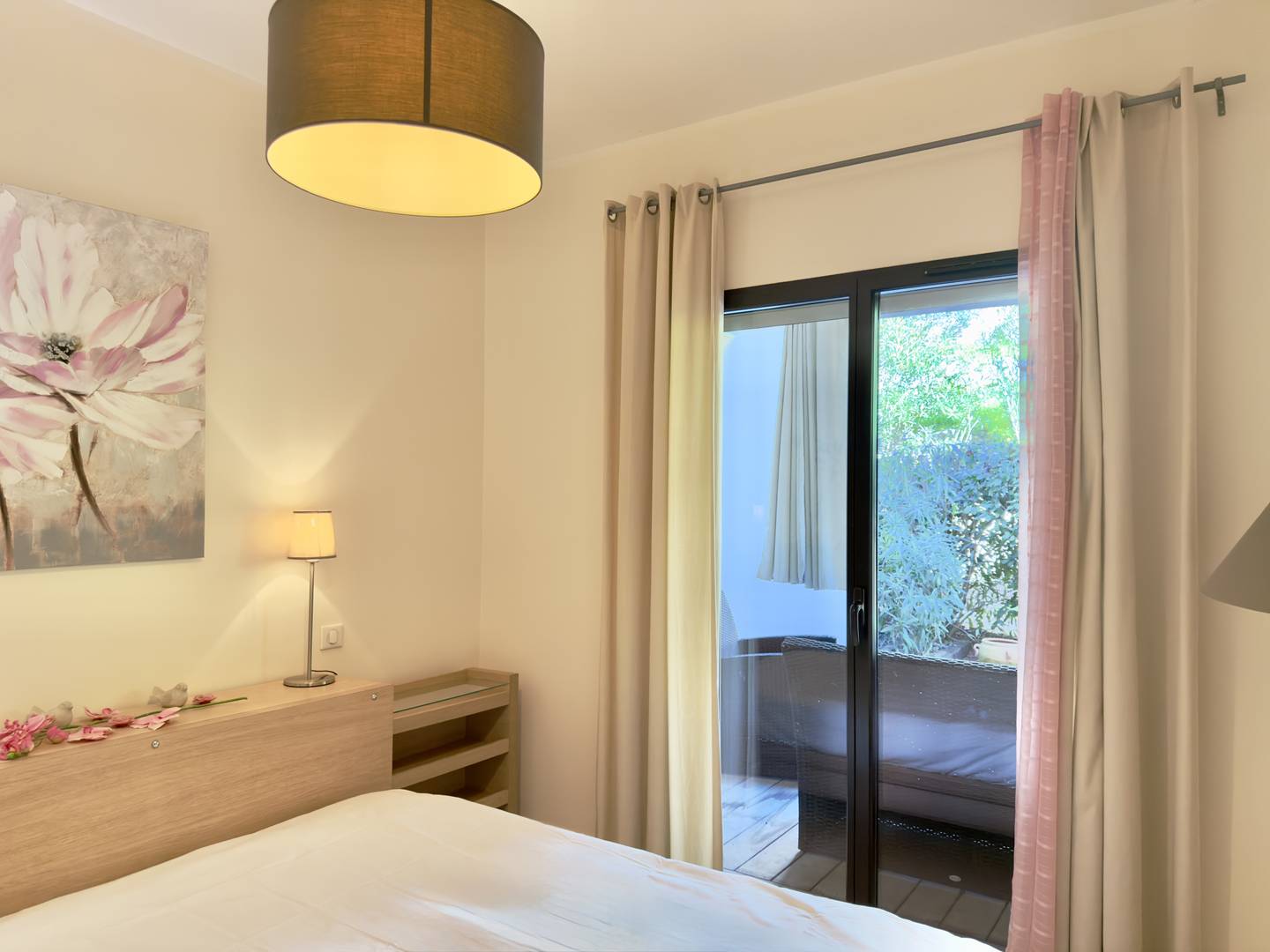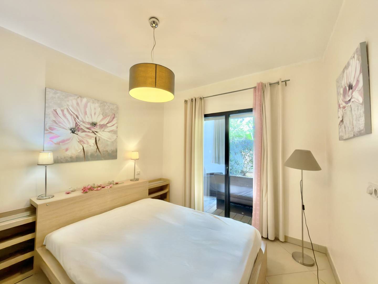 Un coin nuit avec lit double, une salle d'eau avec douche italienne et WC.