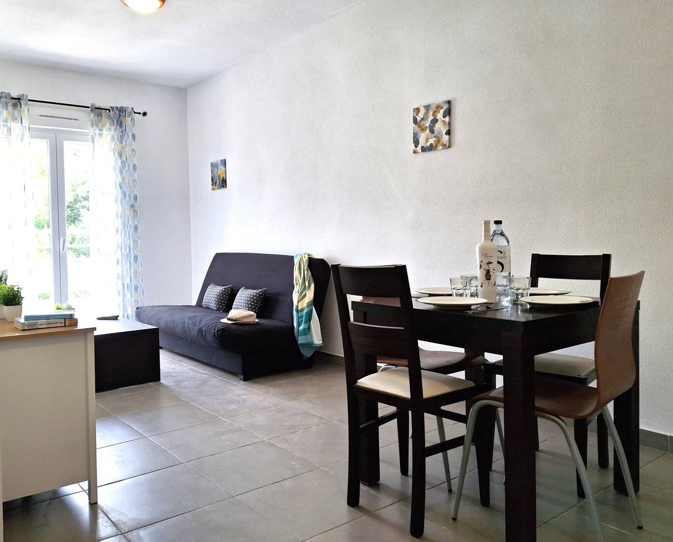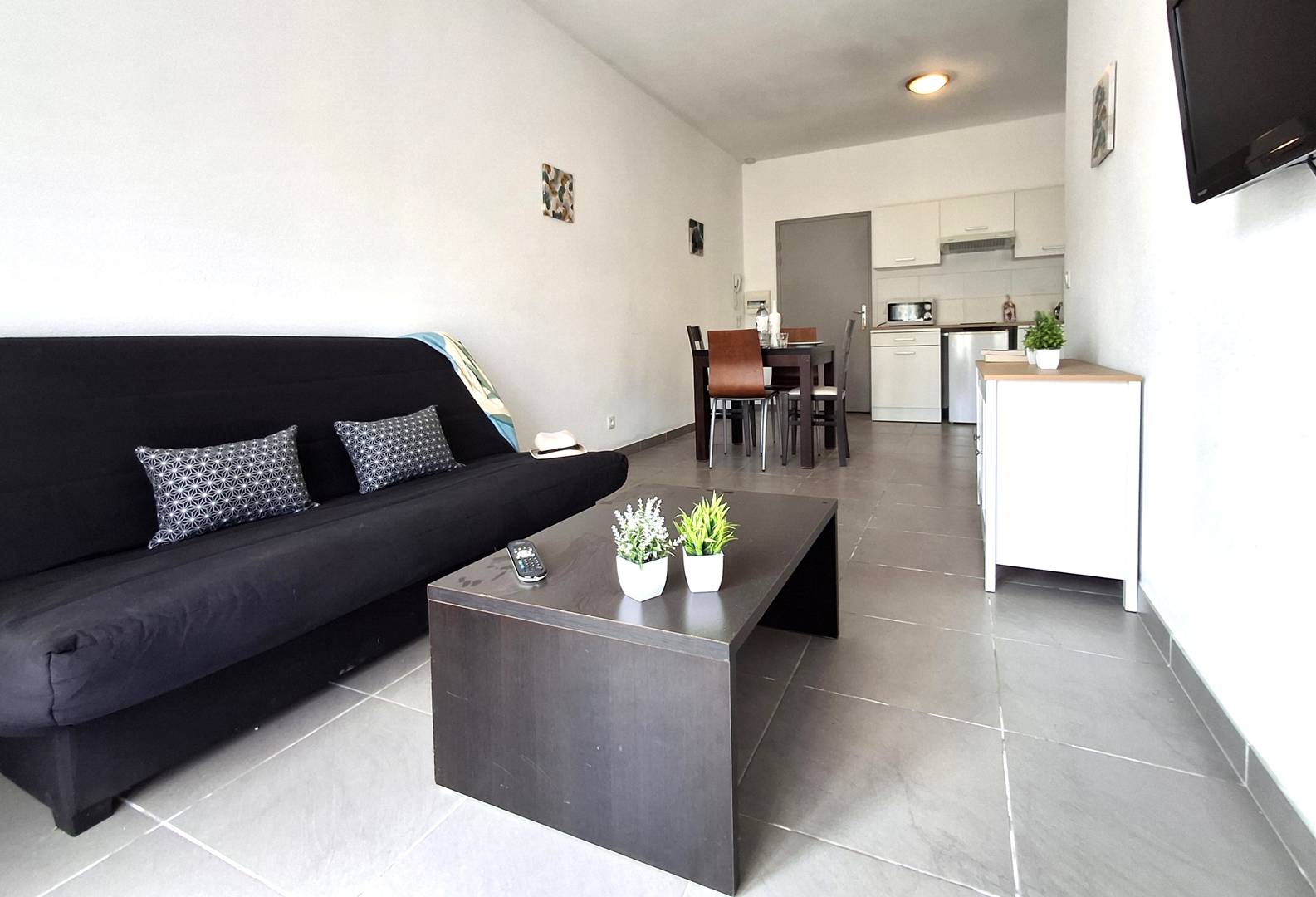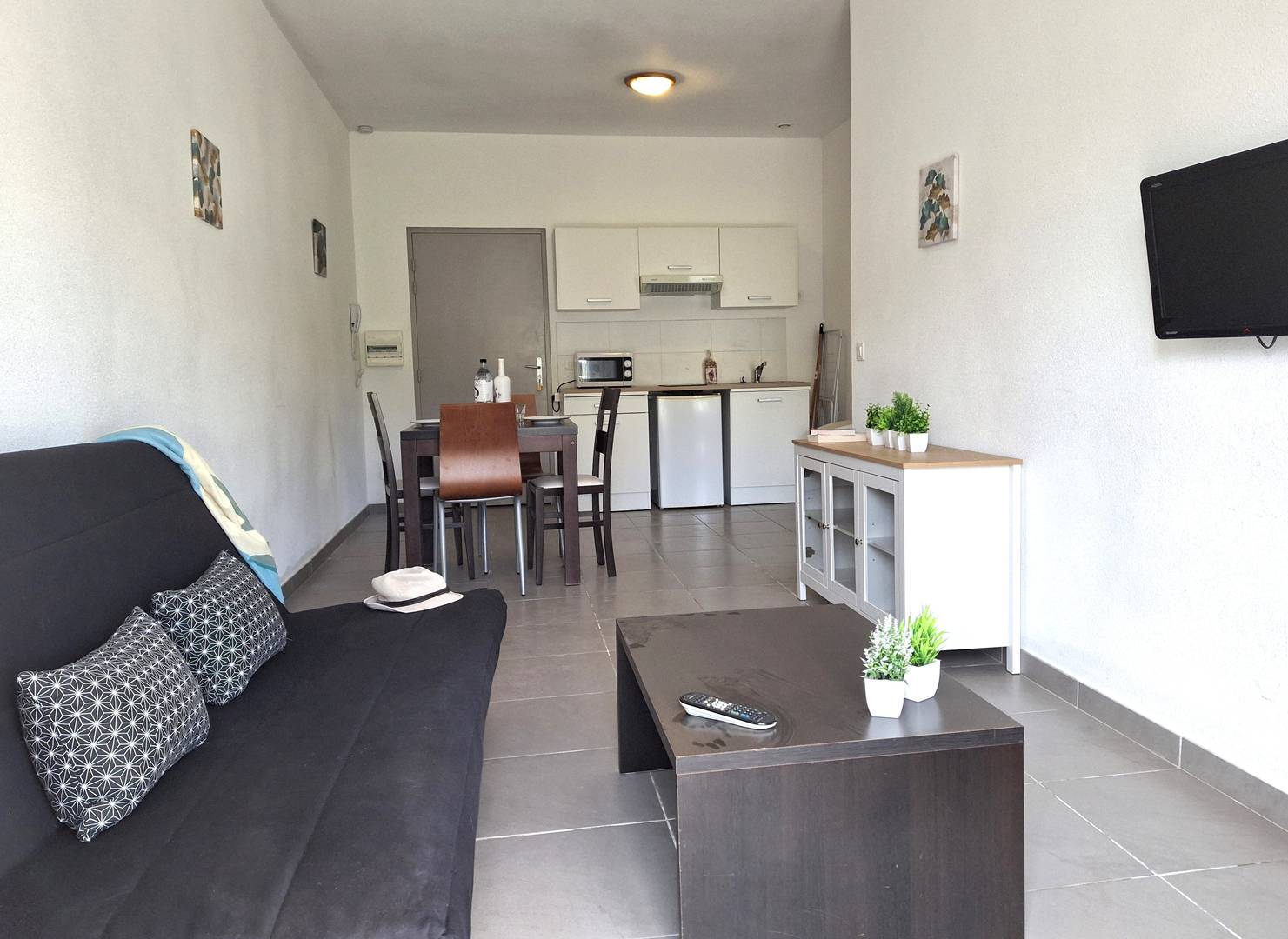 ?? Salon climatisé : canapé clic-clac, TV, cuisine ouverte équipée (plaques de cuisson, hotte, frigo, micro-ondes) et coin repas