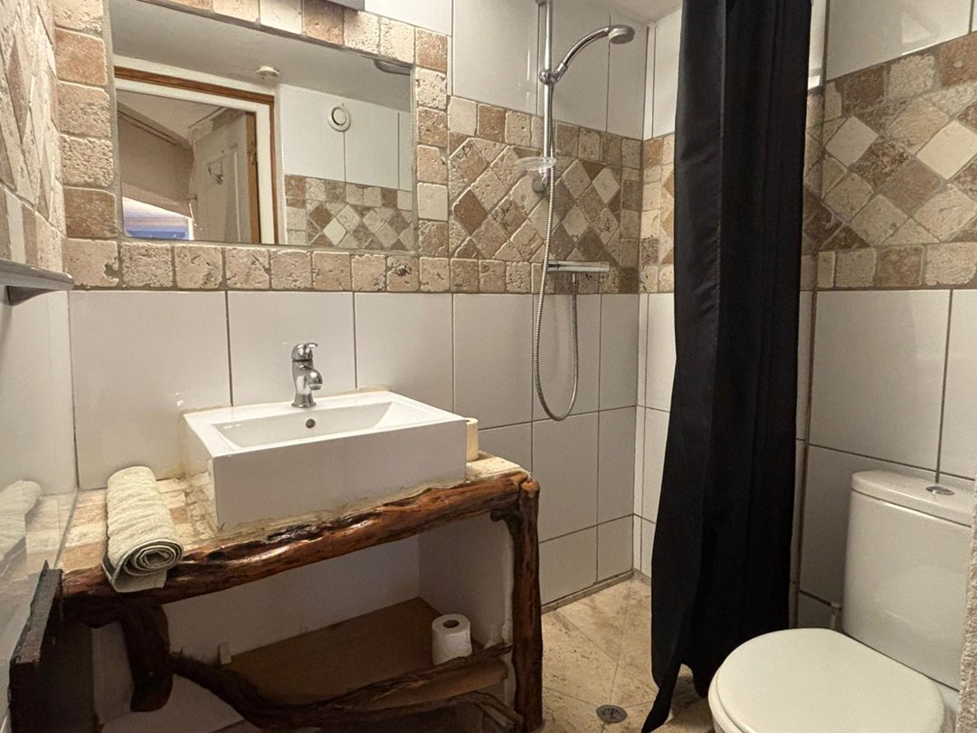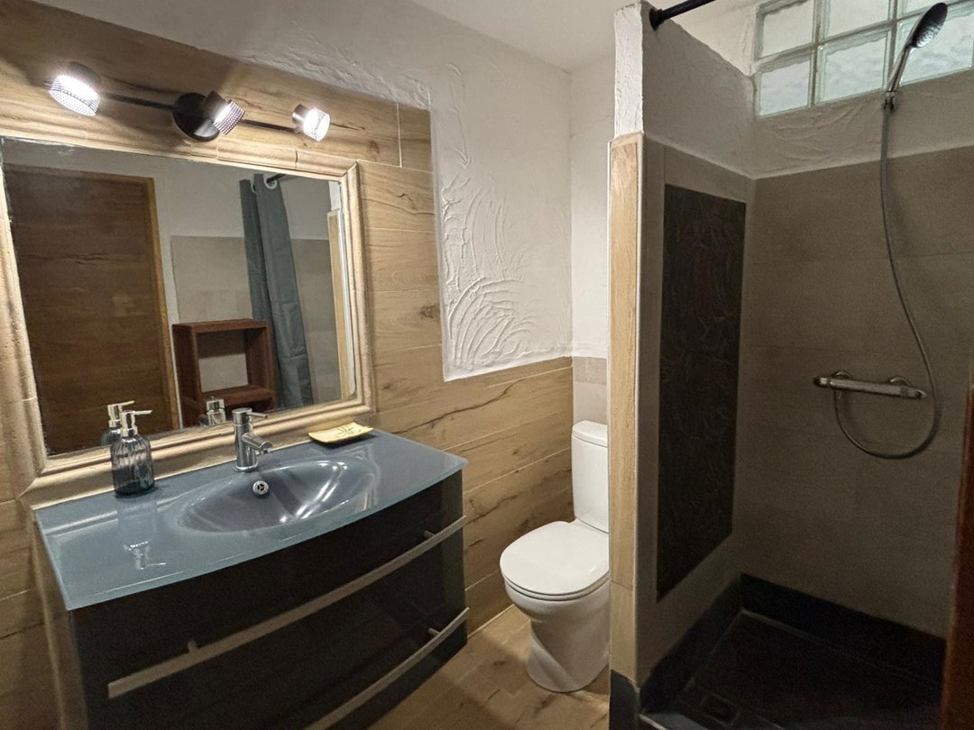 Séjour/cuisine - climatisation : frigo-congélateur, lave-vaisselle, lave-linge, four, cuisinière (gaz), hotte aspirante, micro-ondes, cafetière, T.V (française), canapé fixe