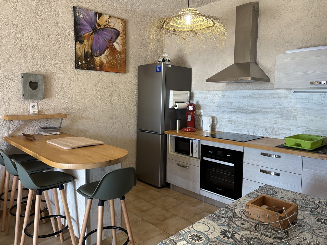 -Séjour / Cuisine : Table bar, combiné réfrigérateur congélateur, plaque de cuisson électrique, four électrique, micro-ondes, grille-pain, rangements, canapé convertible en 160 sur 200 et télévision