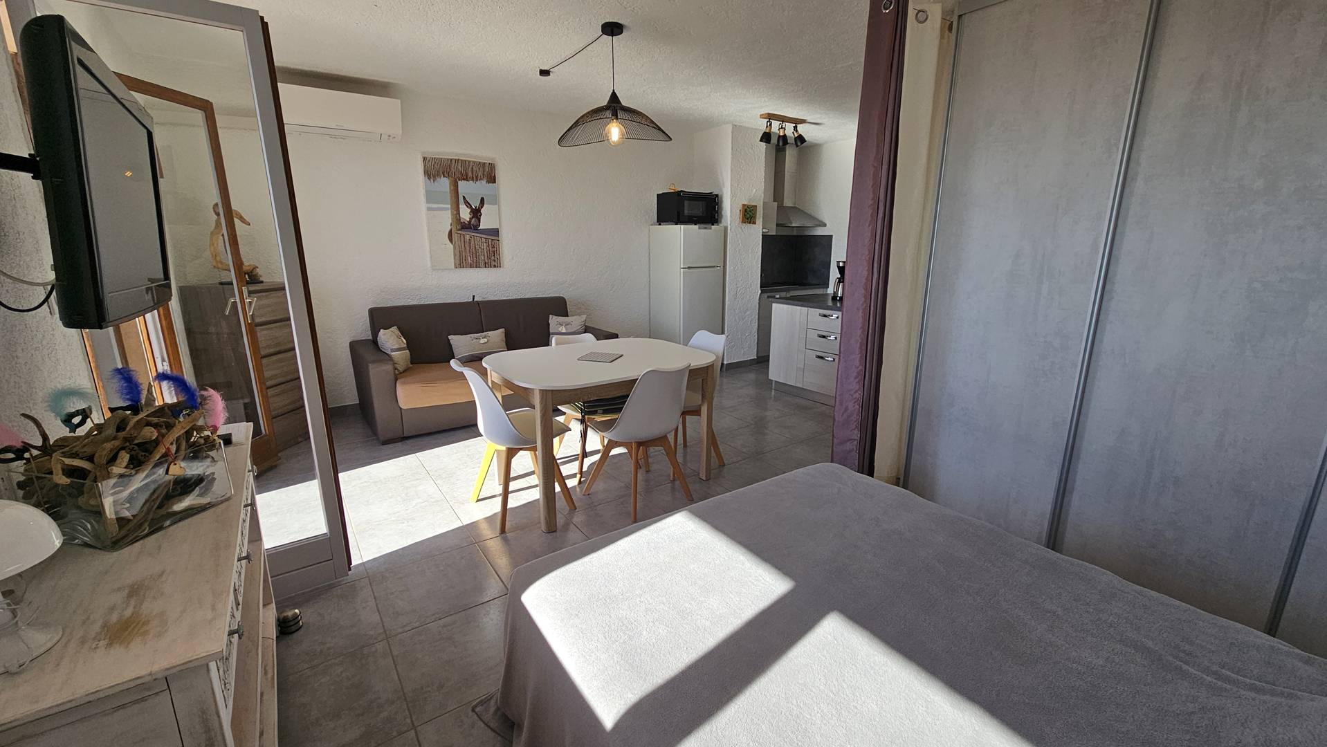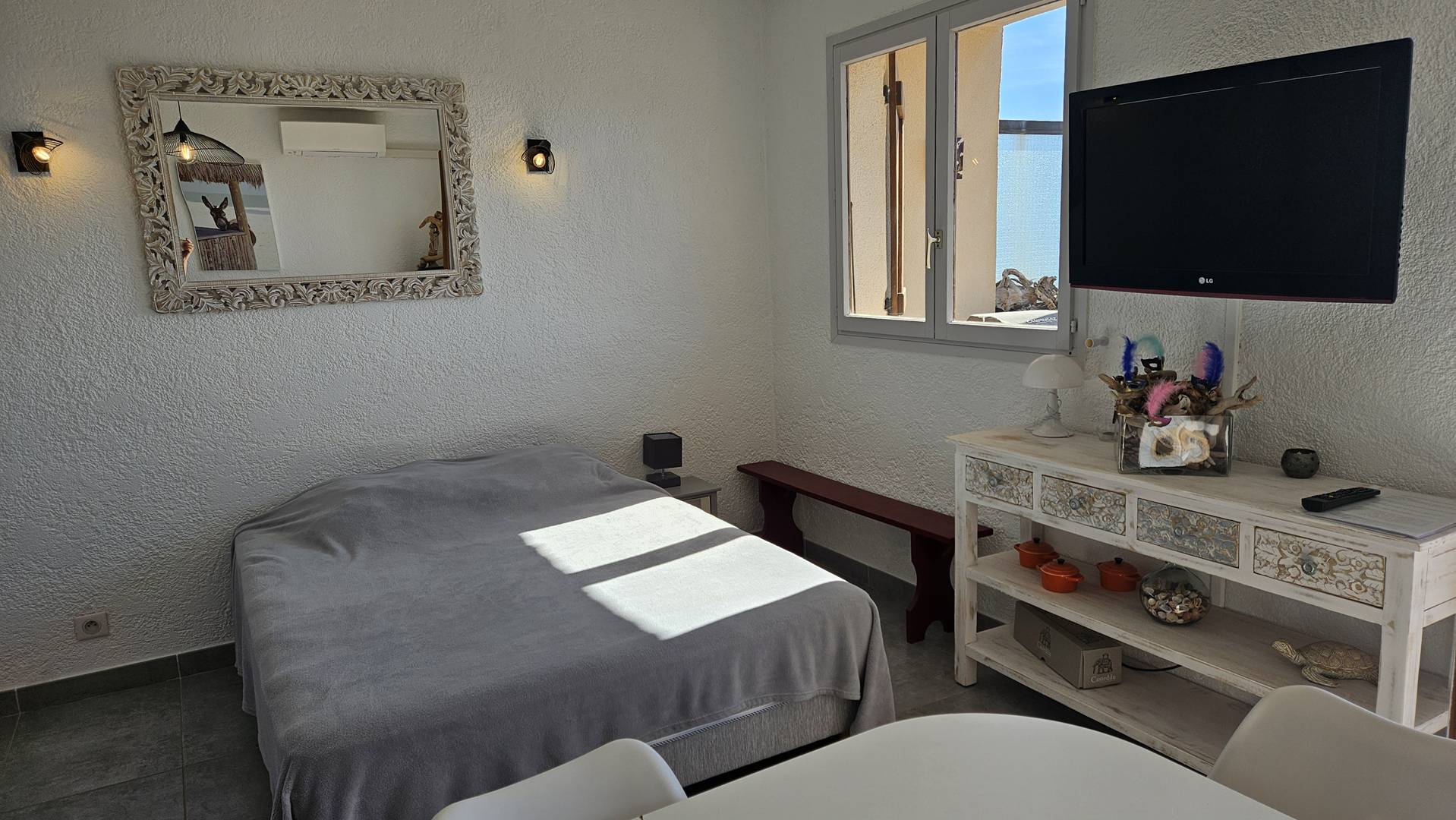 Séjour / Cuisine : CLIM - combiné réfrigérateur congélateur, plaques de cuisson induction, lave-linge, four électrique, micro-ondes, grille-pain, machine à café, canapé convertible, lit 140/190 (2 places), Télévision.