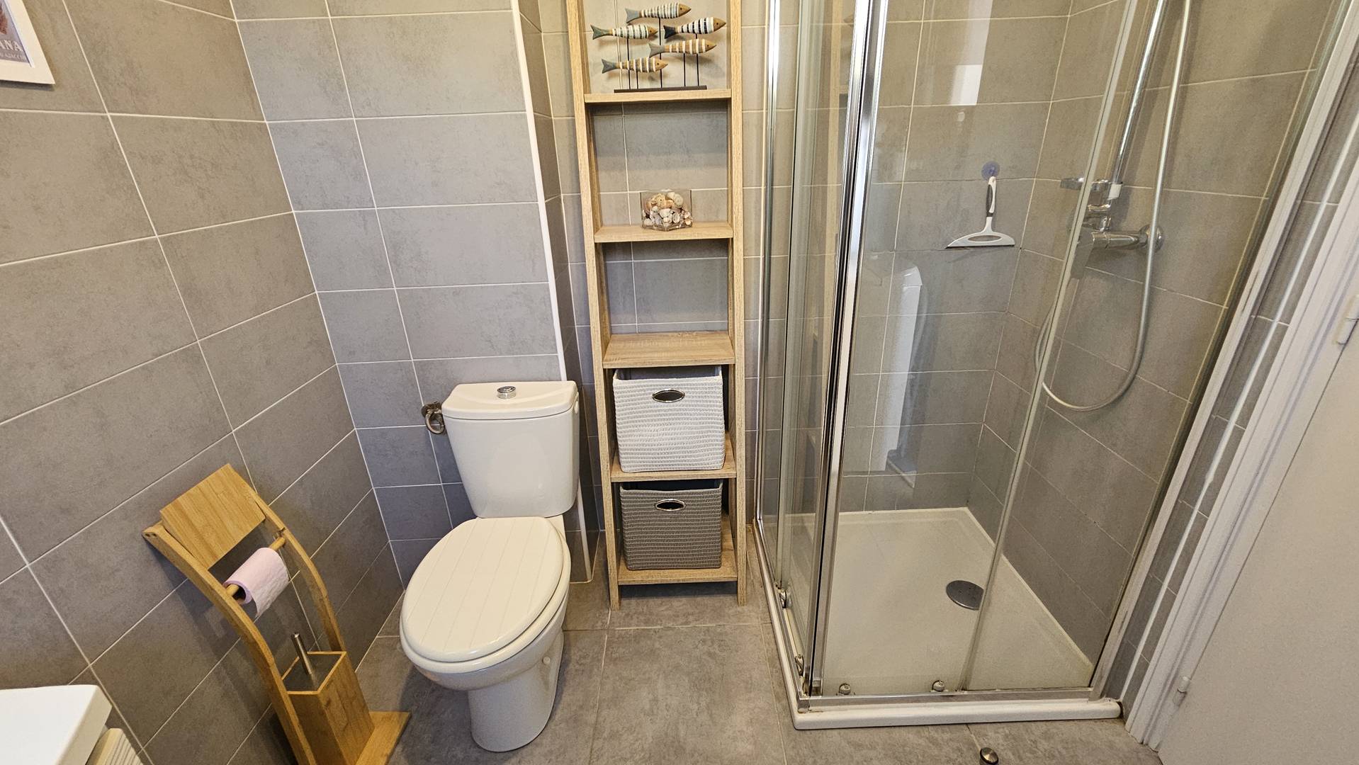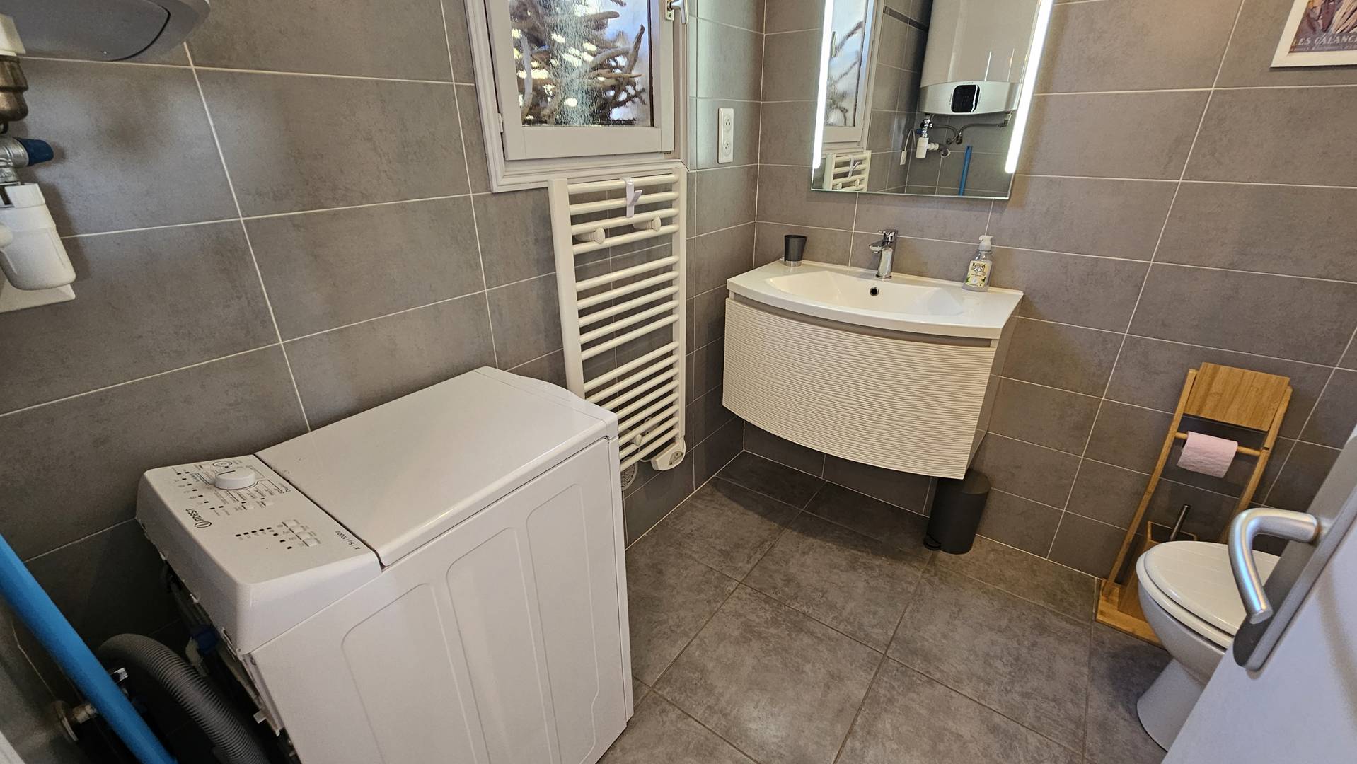 Salle d'eau : Douche, lavabo, WC, sèche serviettes, lave-linge, sèche-cheveux.