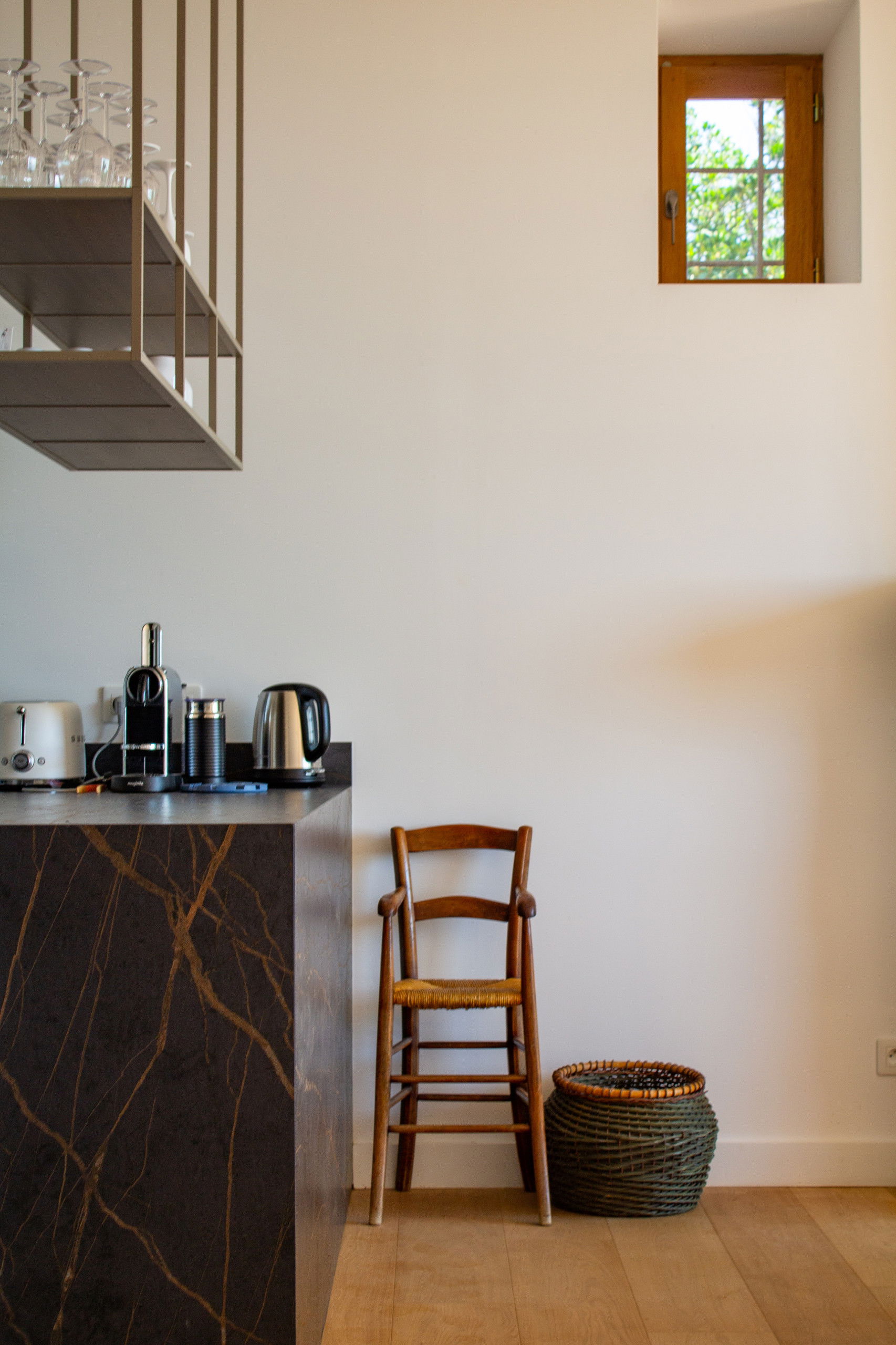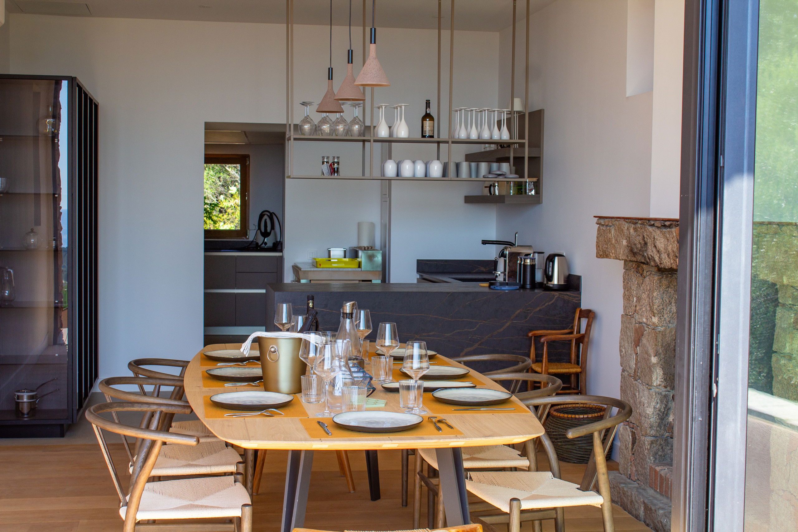 - Une cuisine indépendante avec une salle à manger attenante, offrant une vue magnifique sur la mer grâce à des baies vitrées sol-plafond. La cuisine est entièrement équipée ; réfrigérateur ; micro-ondes ; four ; congélateur ; lave-vaisselle ; vaisselle et couverts ; ustensiles de cuisine ; cafetière ; grille-pain, etc…