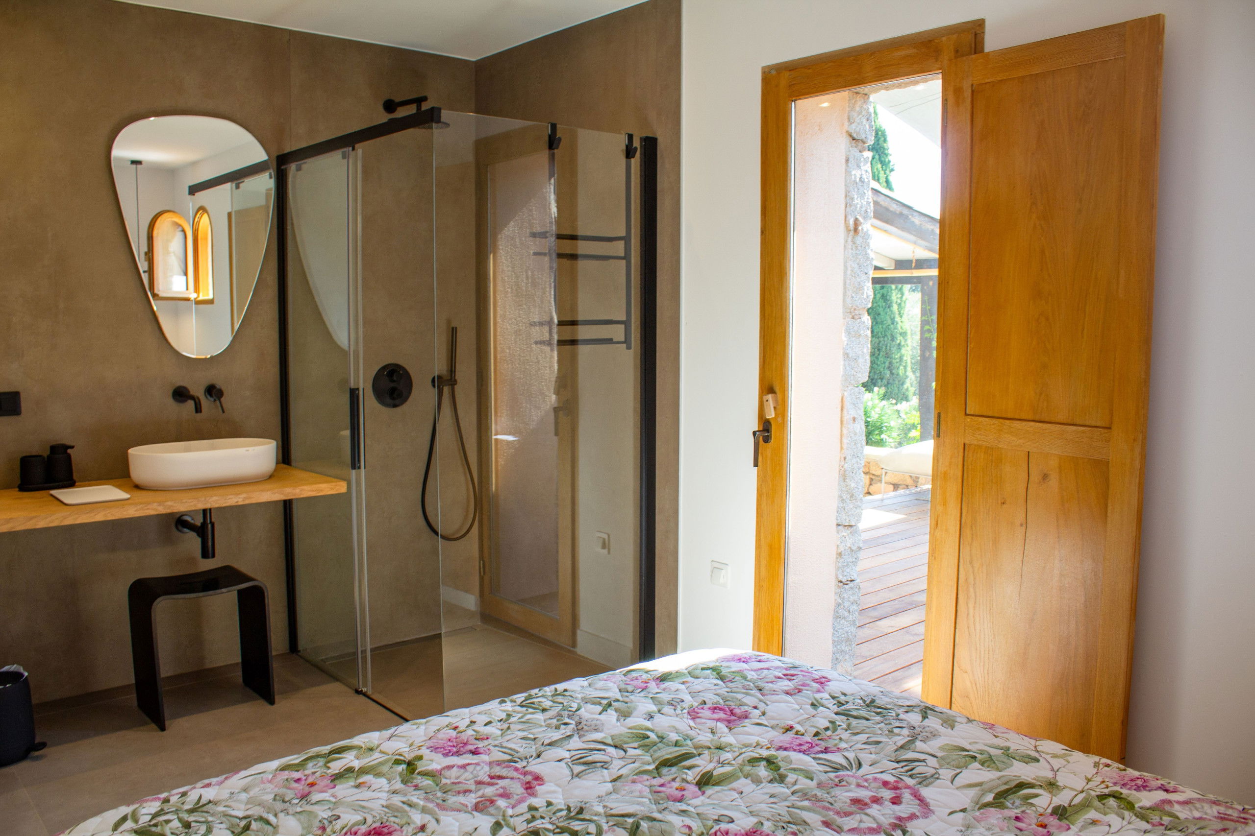 - Chambre 1 : Un lit 160*200 avec douche, vasque, bureau et rangement – Accès terrasse et vue mer.