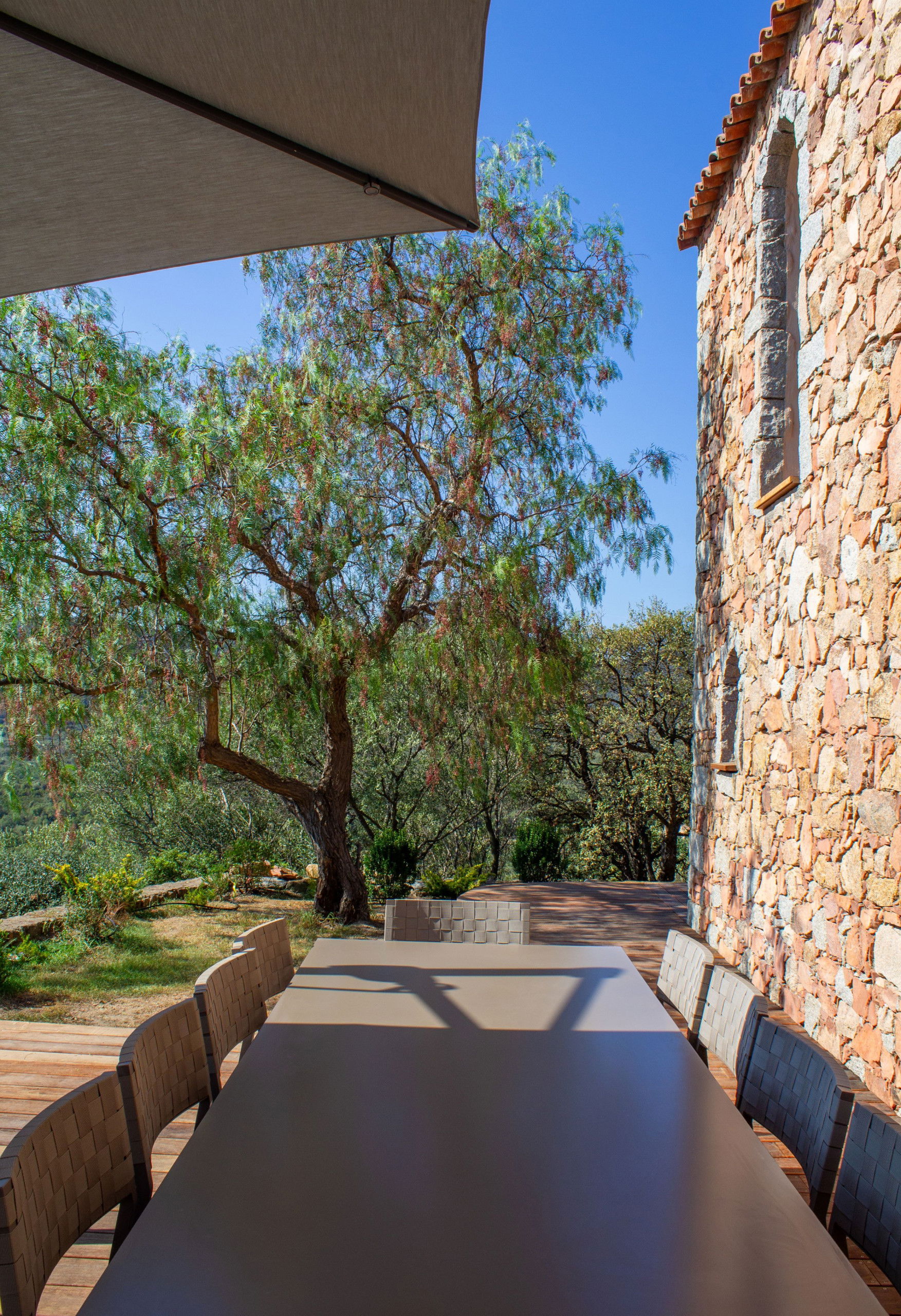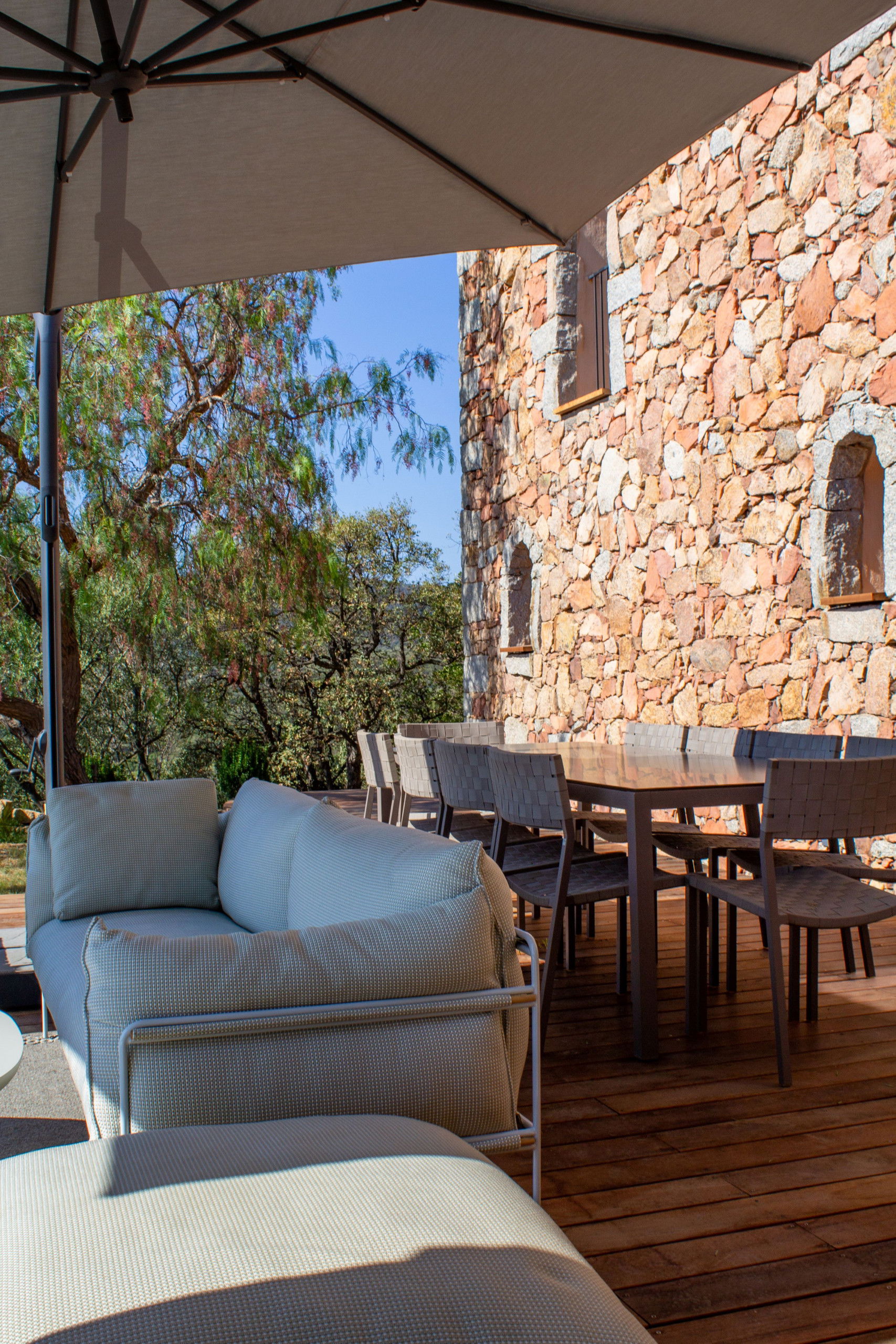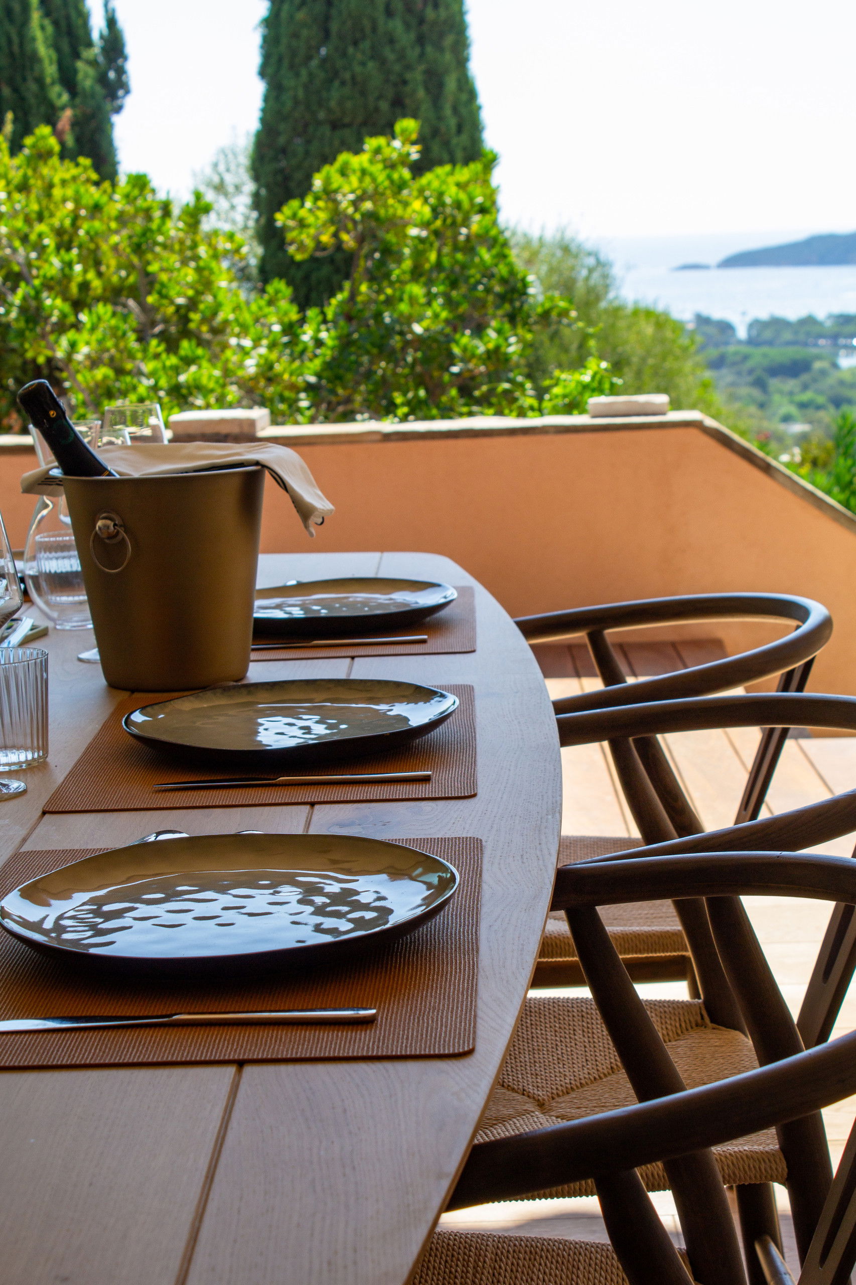 - Un coin salon et un coin repas sont aménagés au niveau de la terrasse de la villa.