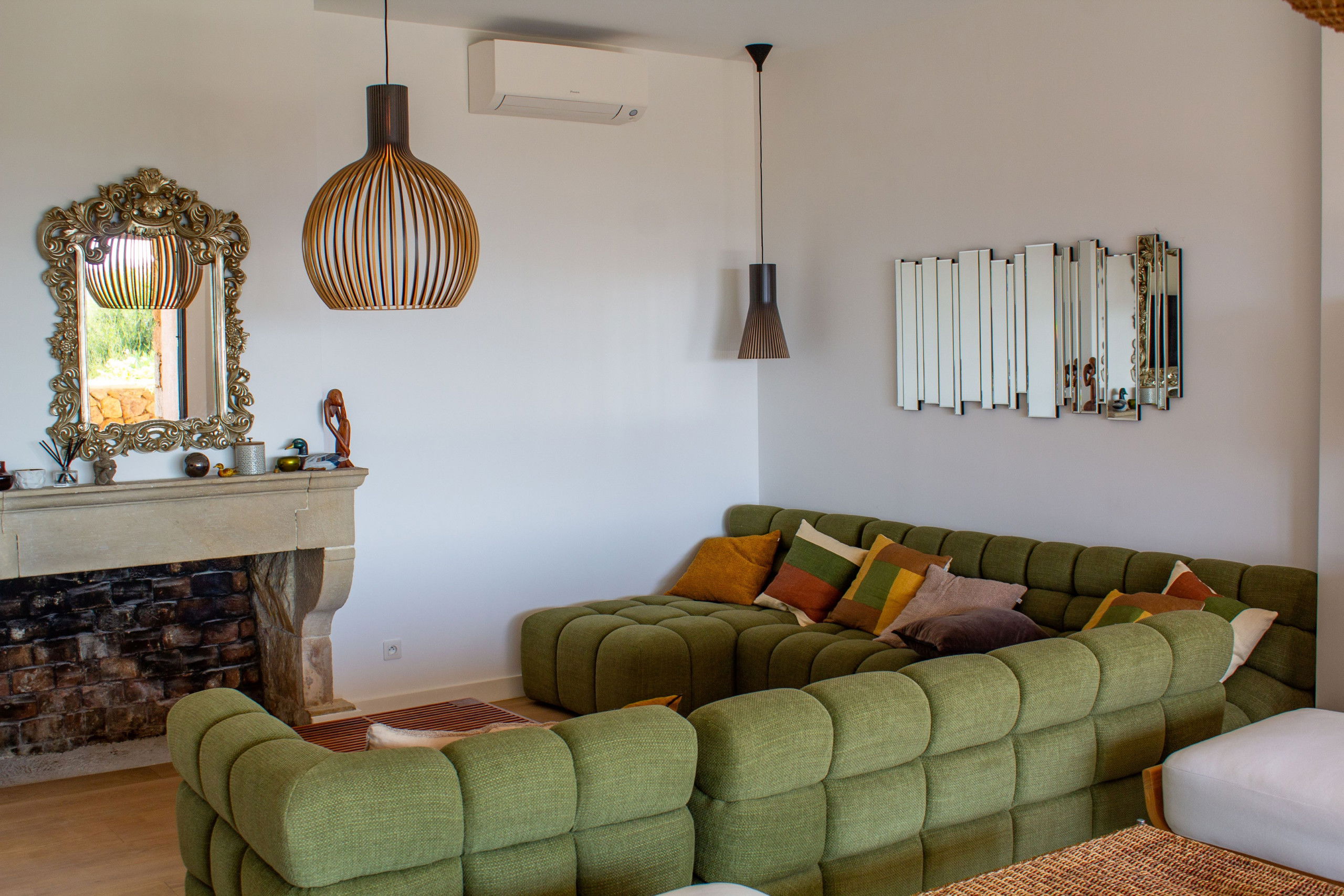 - Un salon avec cheminée et télévision et une grande baie vitrée menant à la terrasse