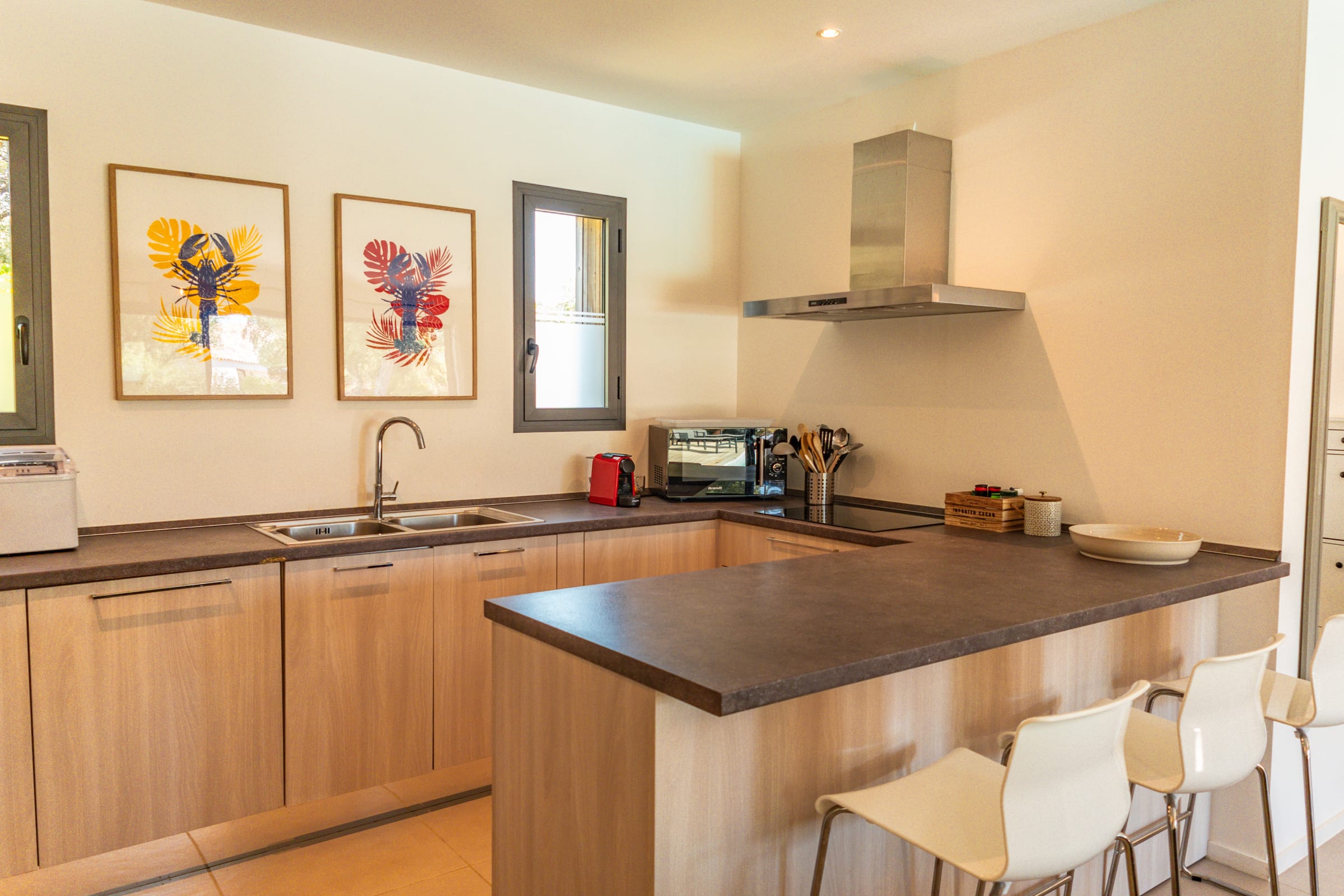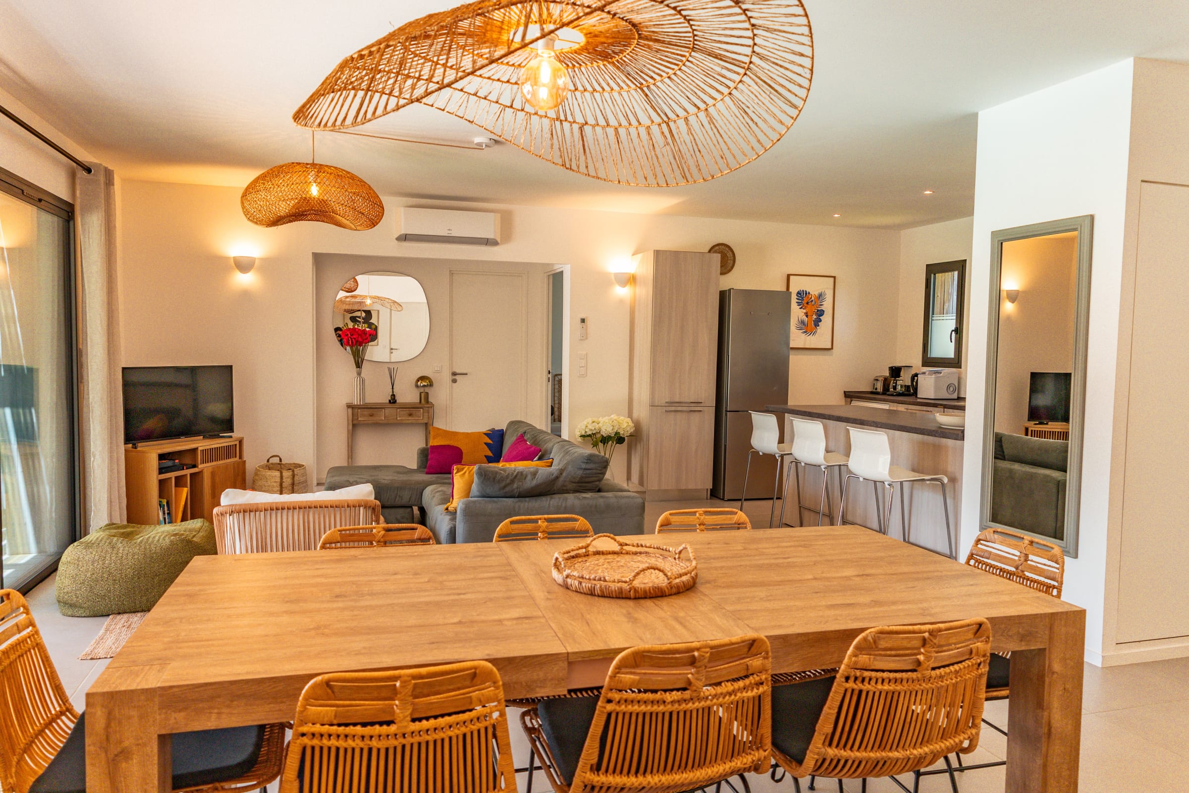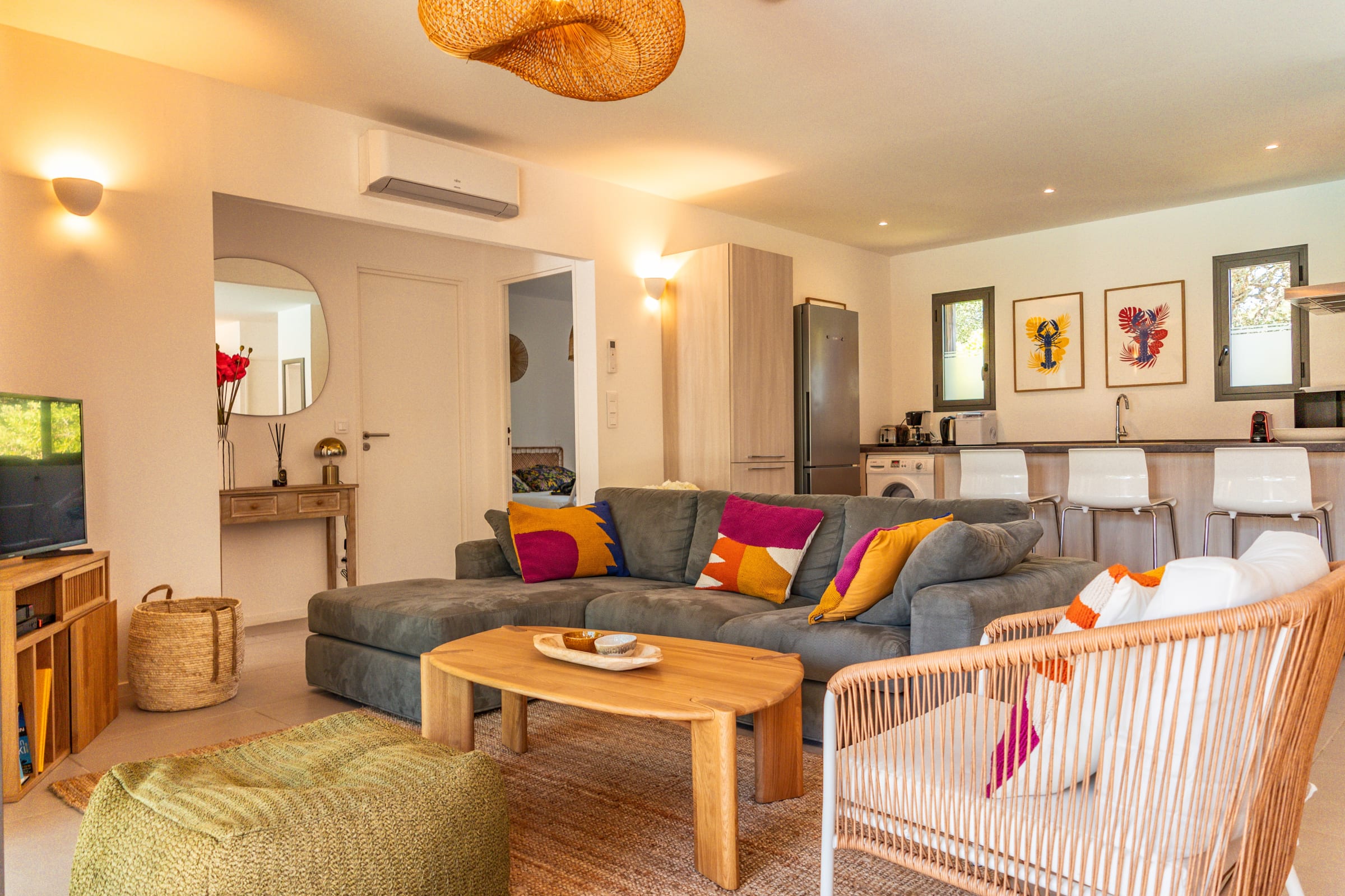 • Salon : Confortable et lumineux, avec une cuisine ouverte entièrement équipée (lave-vaisselle, micro-ondes, machine à café Nespresso, machine à café filtre, machine à laver, four, machine à glaçons, grille-pain, bouilloire). Vue imprenable sur la piscine. Une télévision est également disponible.