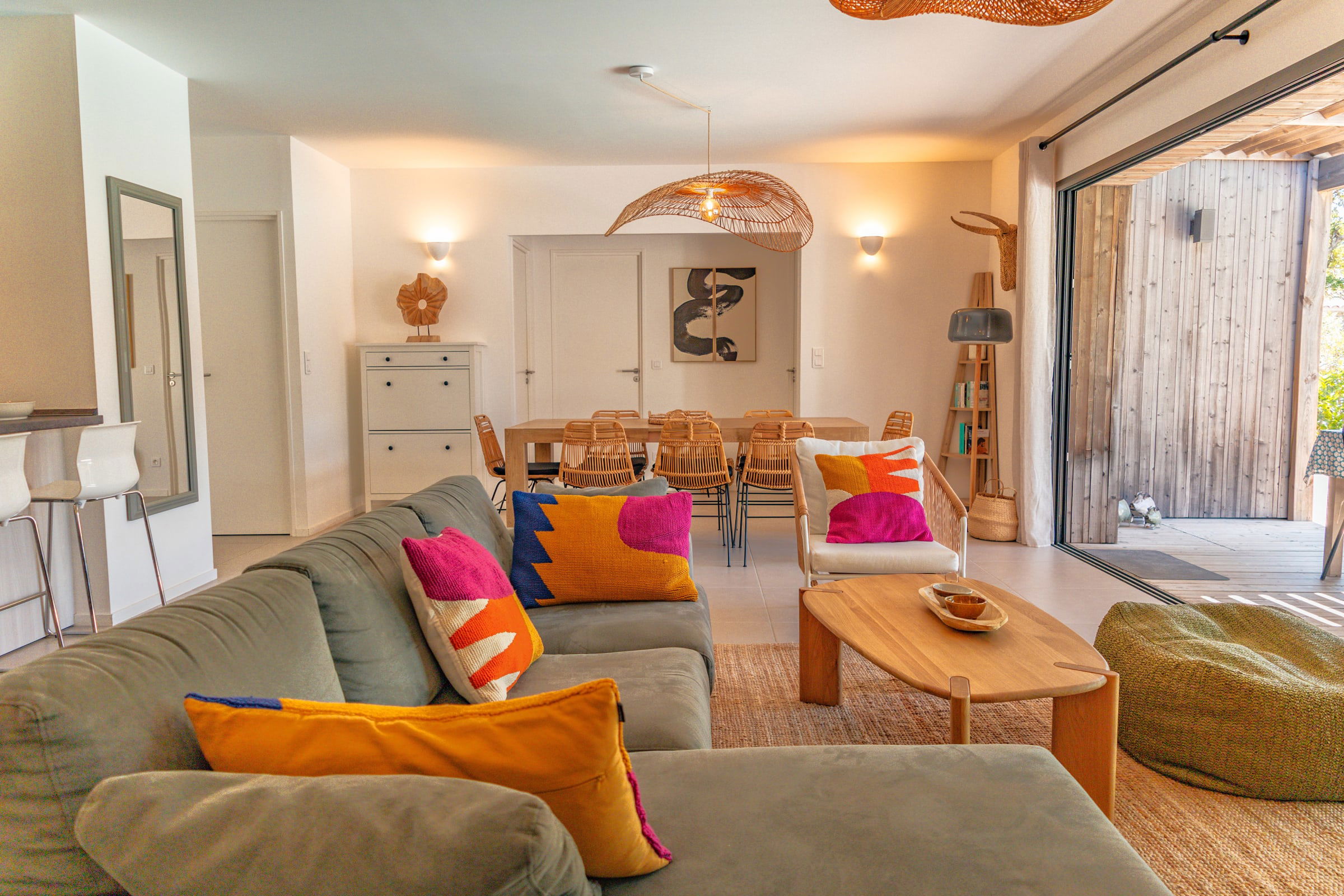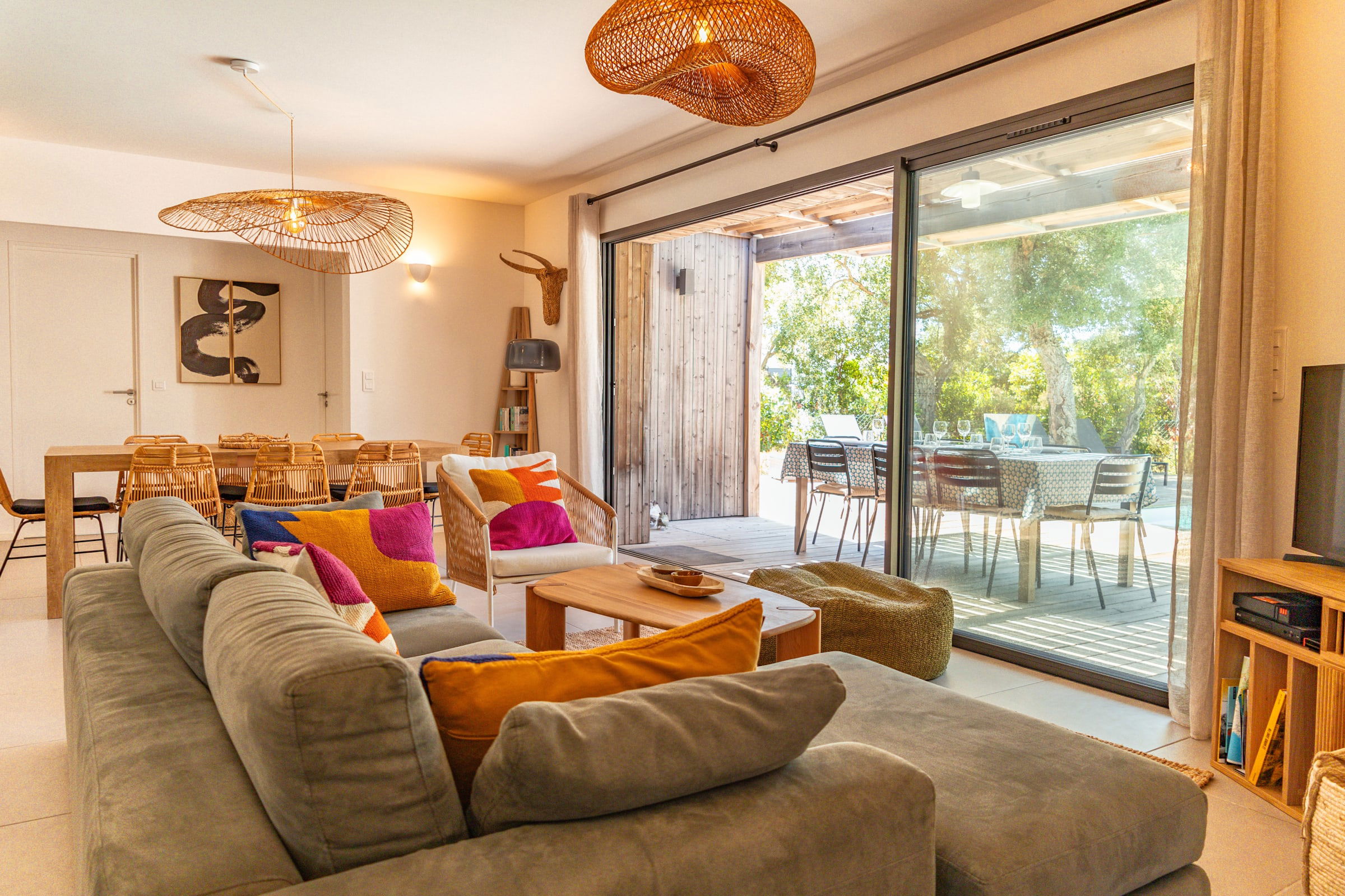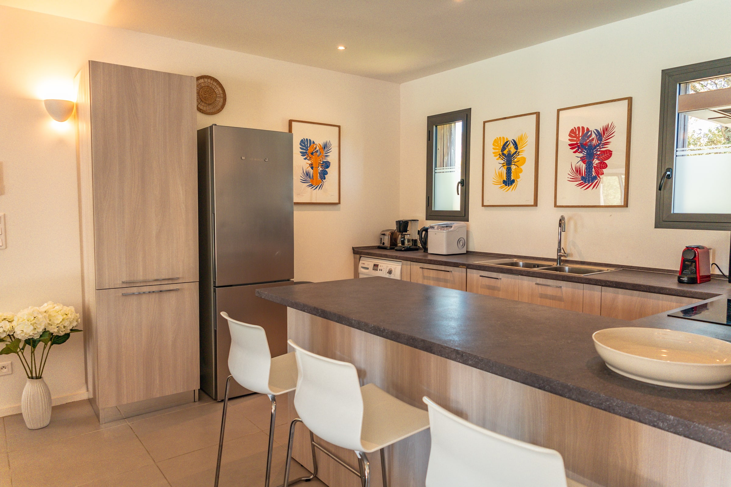 • Salon : Confortable et lumineux, avec une cuisine ouverte entièrement équipée (lave-vaisselle, micro-ondes, machine à café Nespresso, machine à café filtre, machine à laver, four, machine à glaçons, grille-pain, bouilloire). Vue imprenable sur la piscine. Une télévision est également disponible.