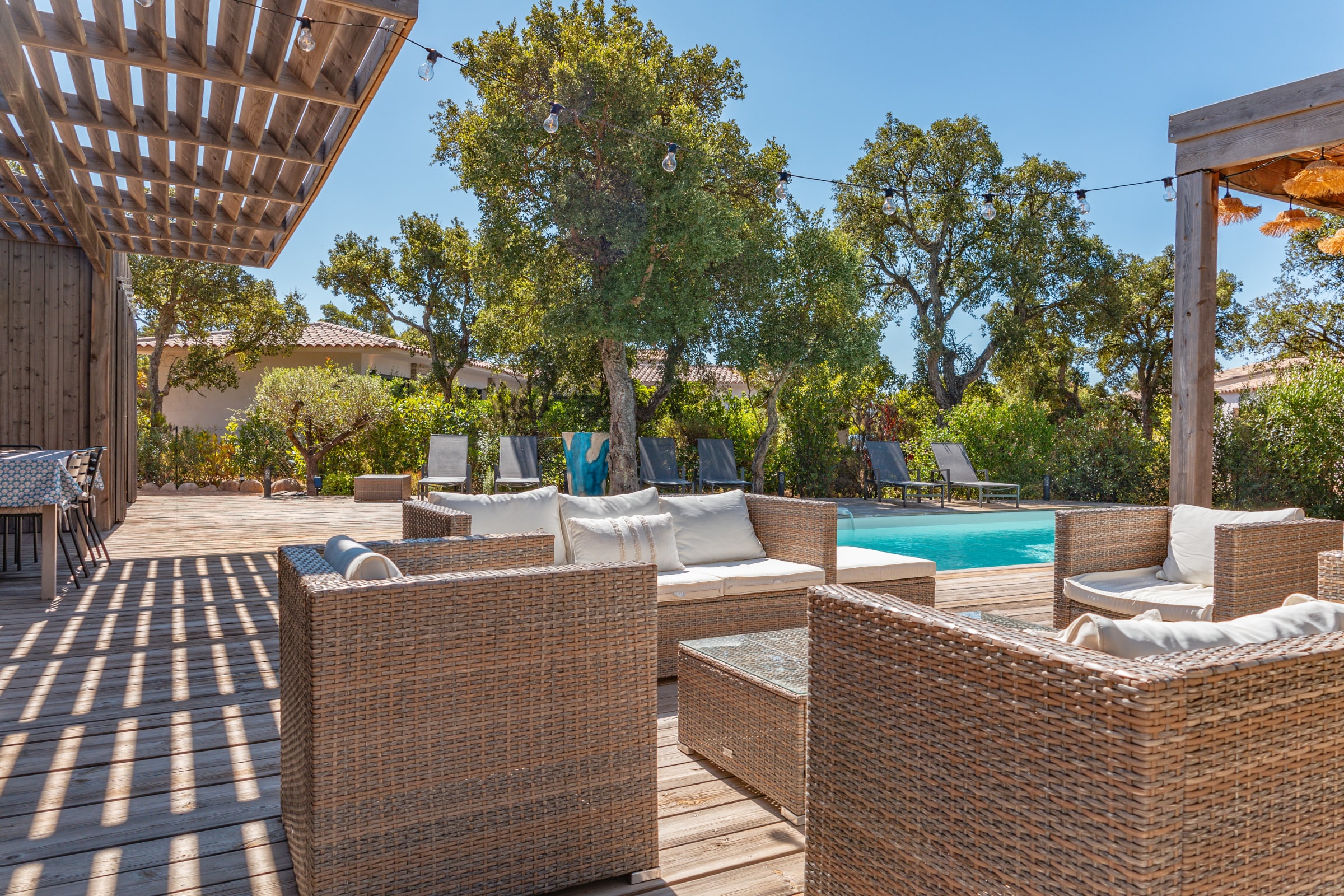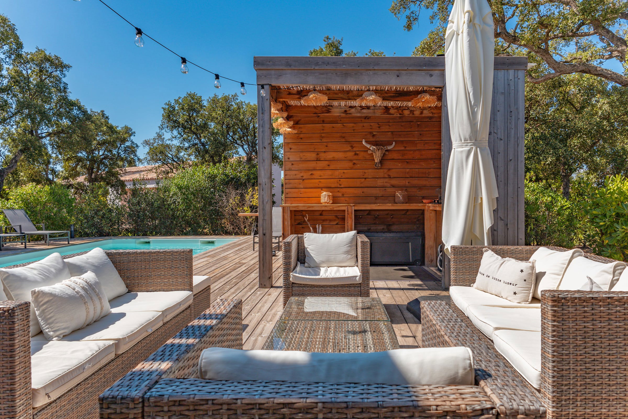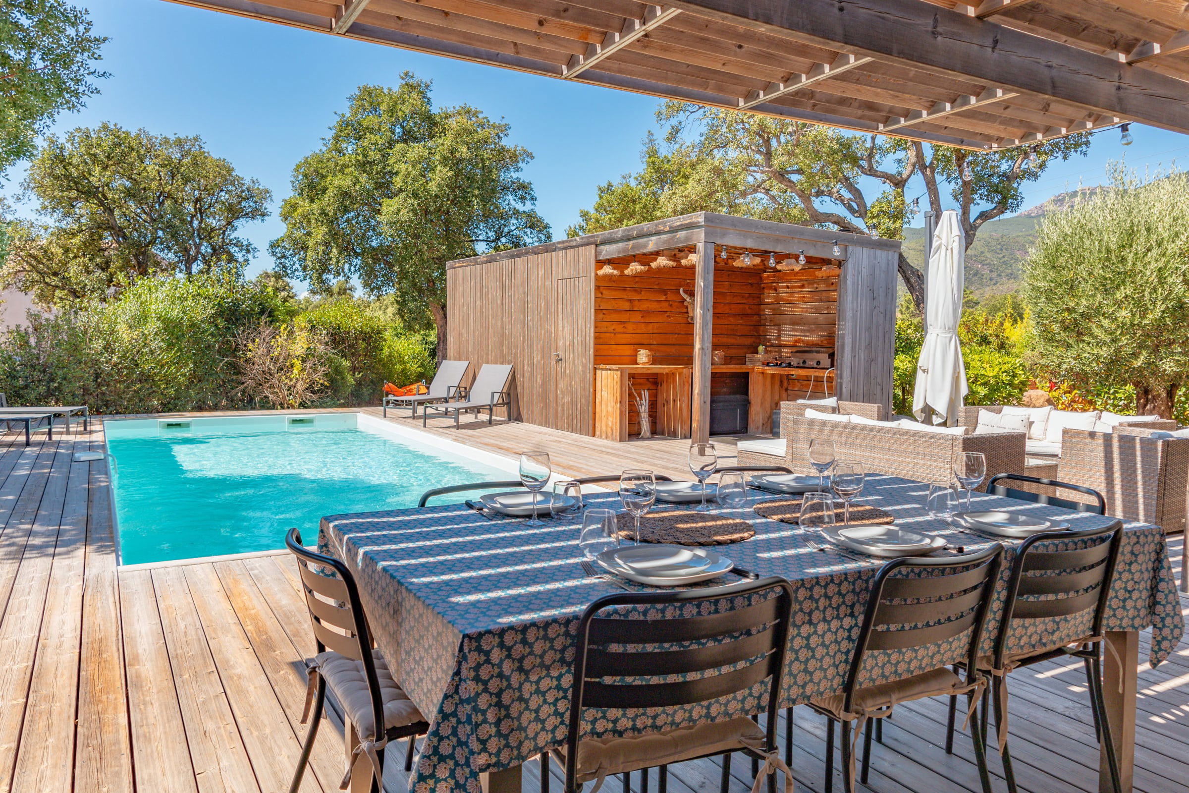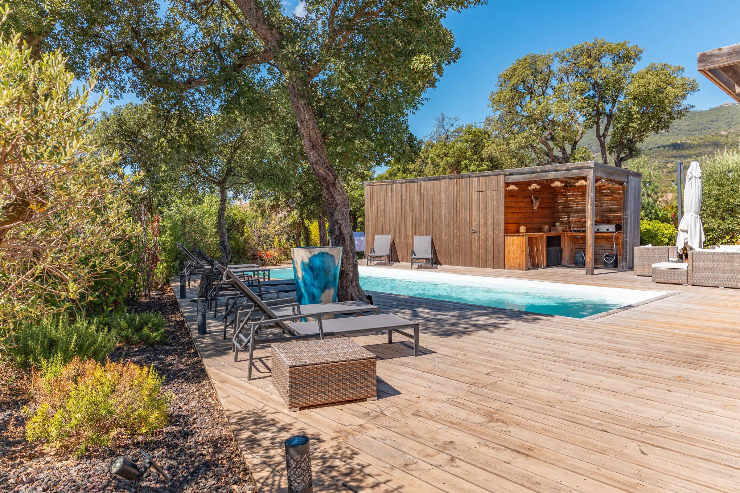 • Terrasse : Pool-house avec plancha, salon de jardin pour 10 personnes, mobilier extérieur comprenant 8 bains de soleil et 2 parasols.