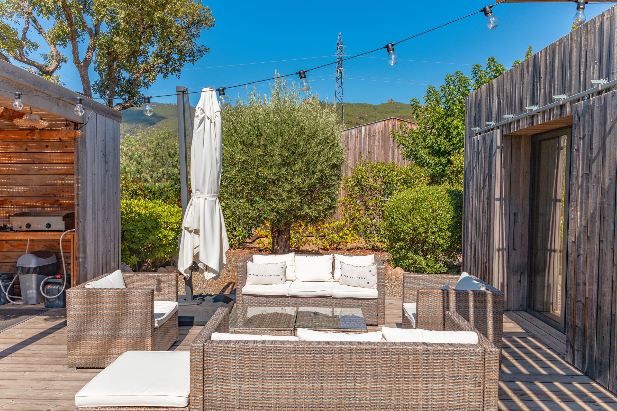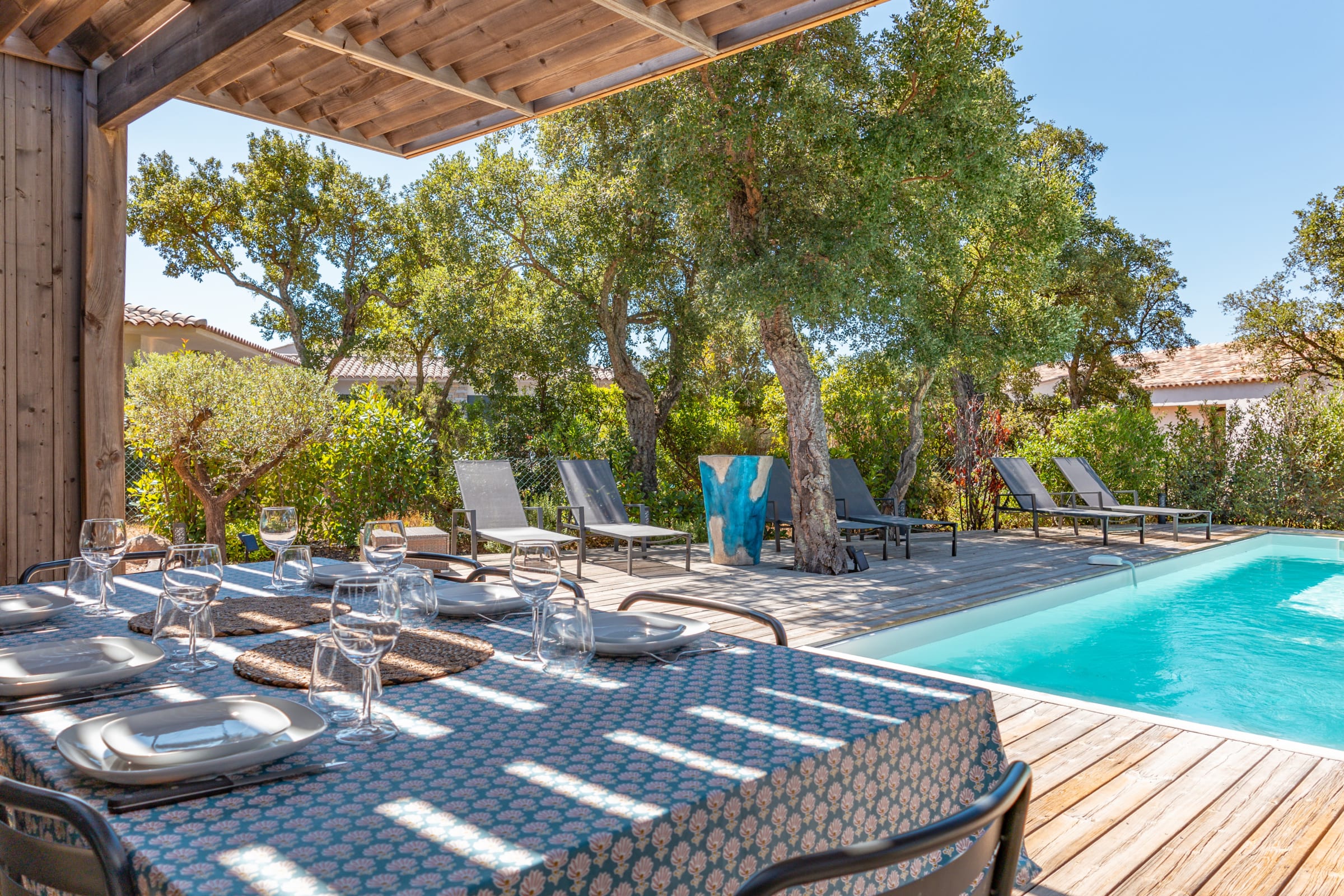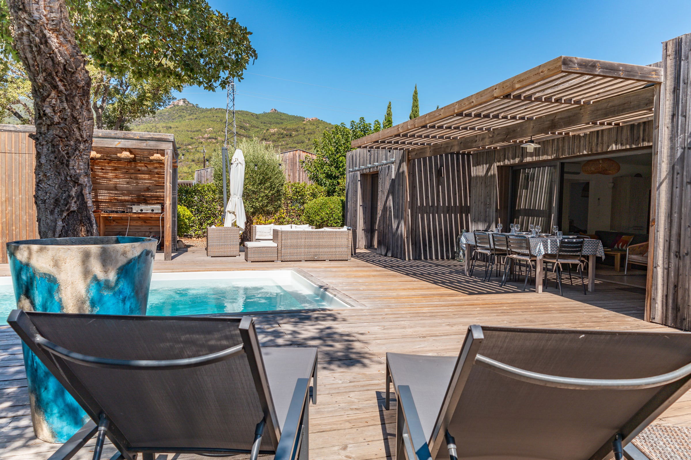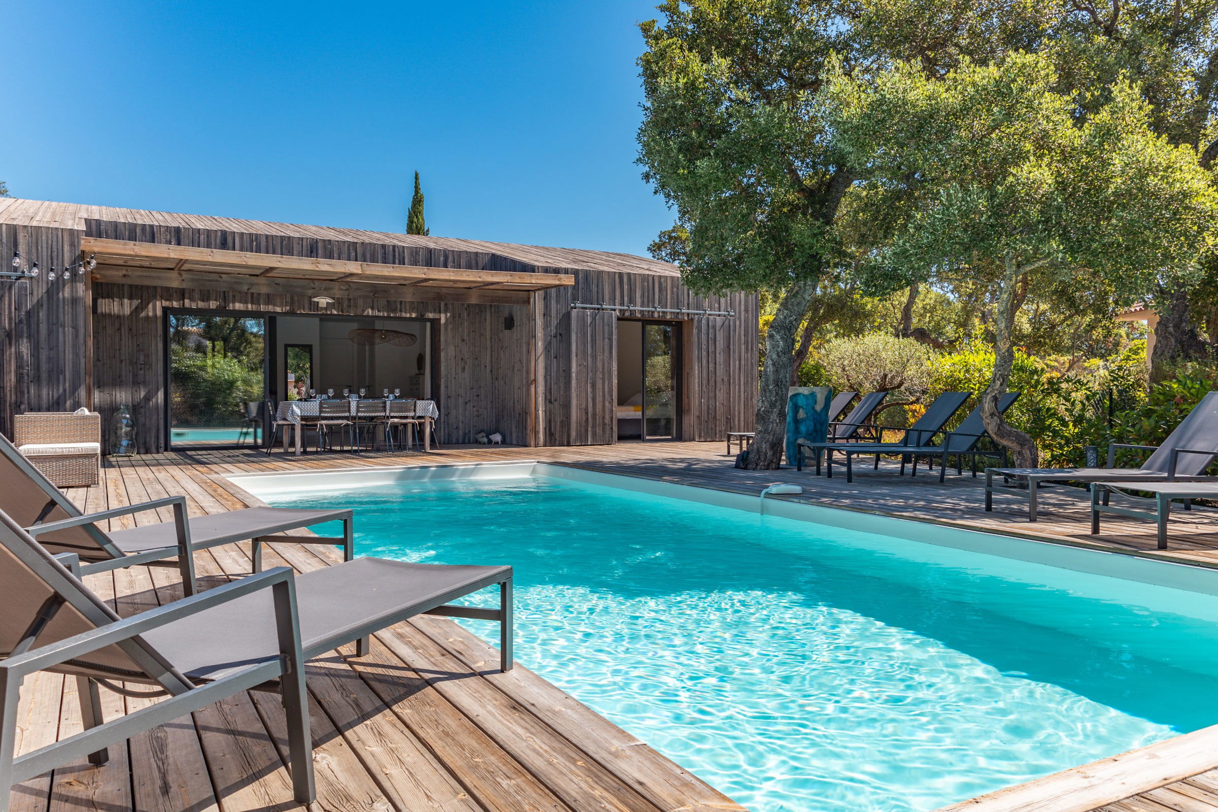 • Terrasse : Pool-house avec plancha, salon de jardin pour 10 personnes, mobilier extérieur comprenant 8 bains de soleil et 2 parasols.