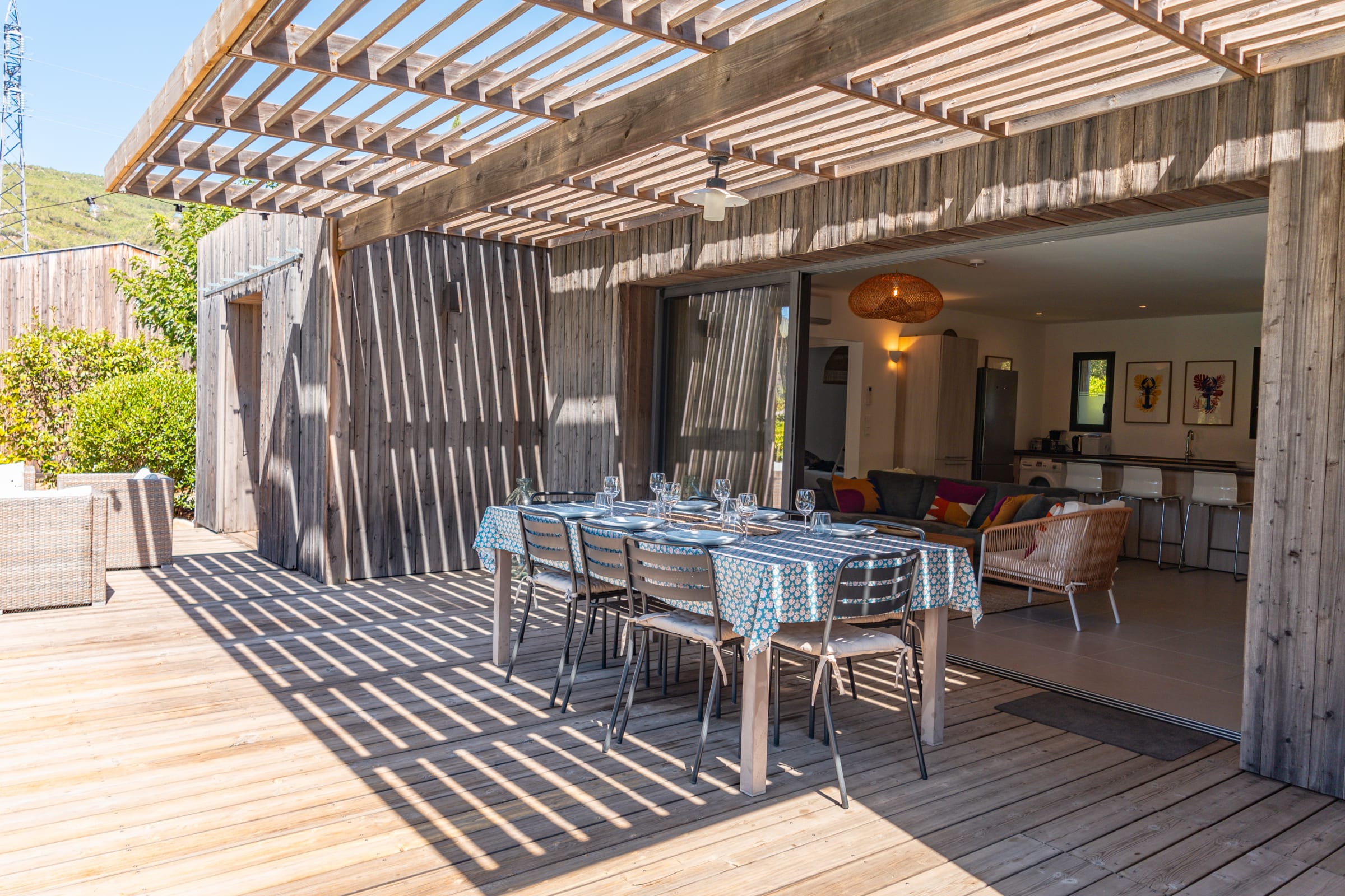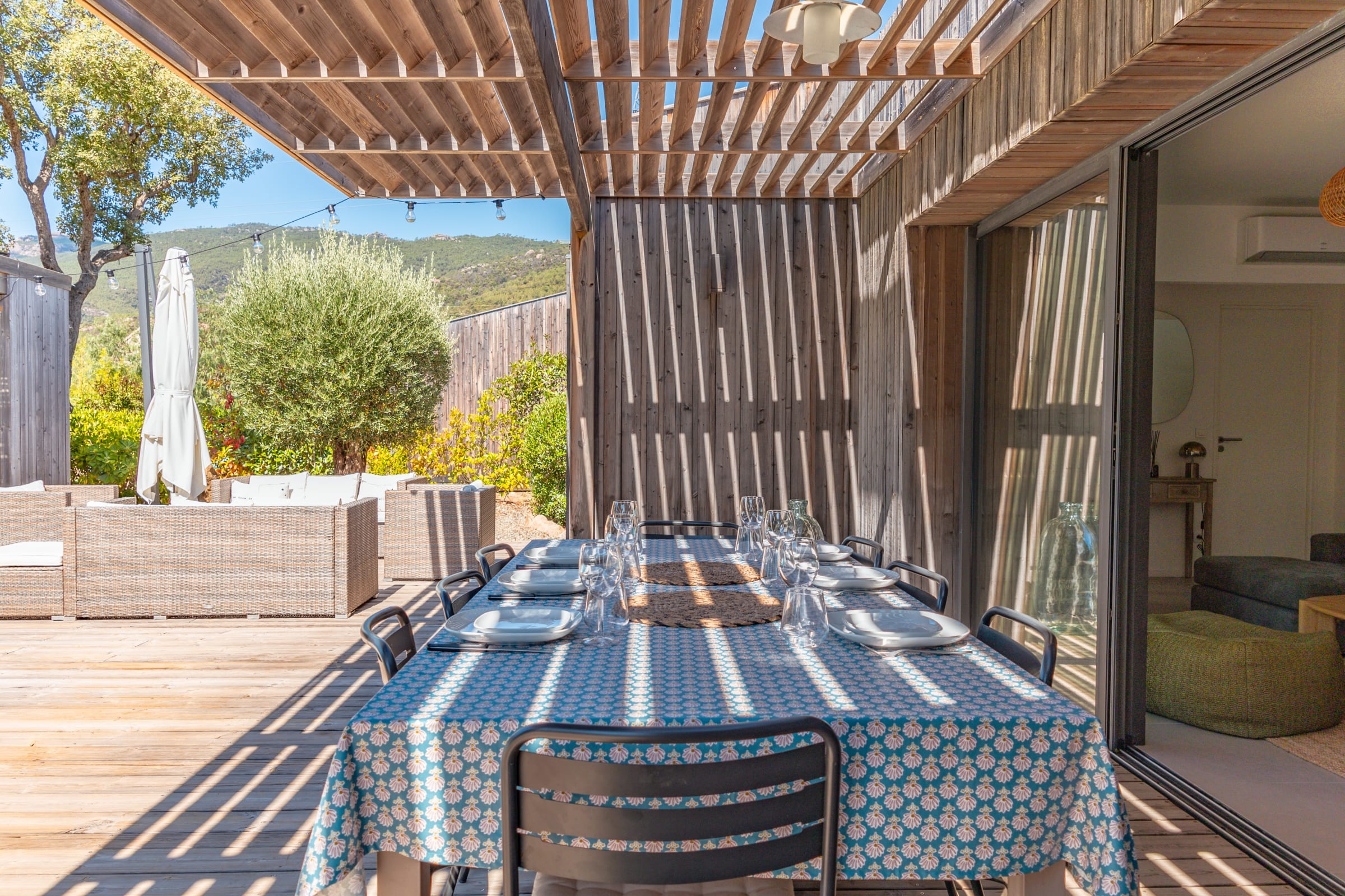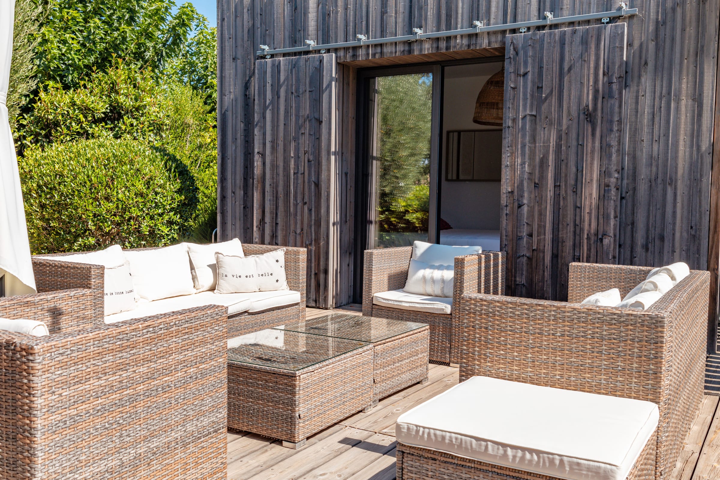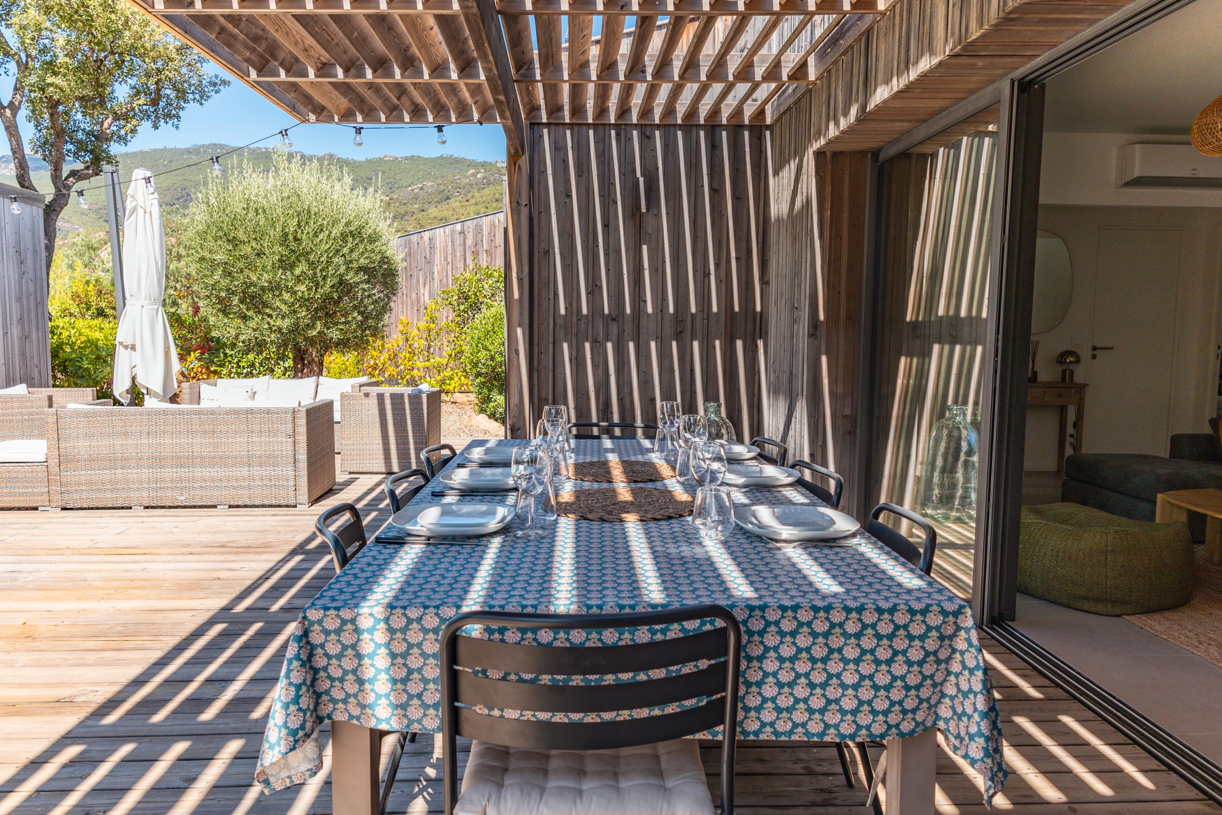 • Terrasse : Pool-house avec plancha, salon de jardin pour 10 personnes, mobilier extérieur comprenant 8 bains de soleil et 2 parasols.