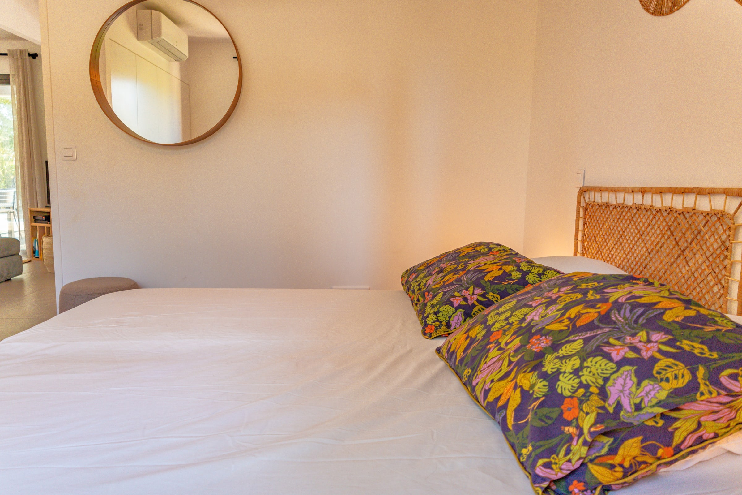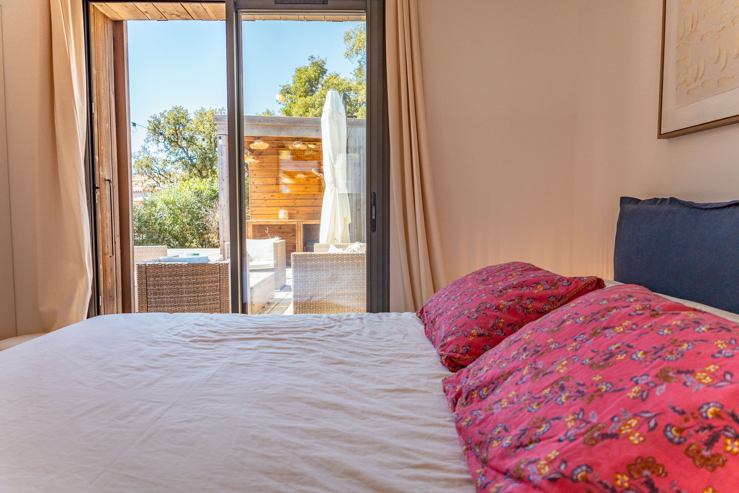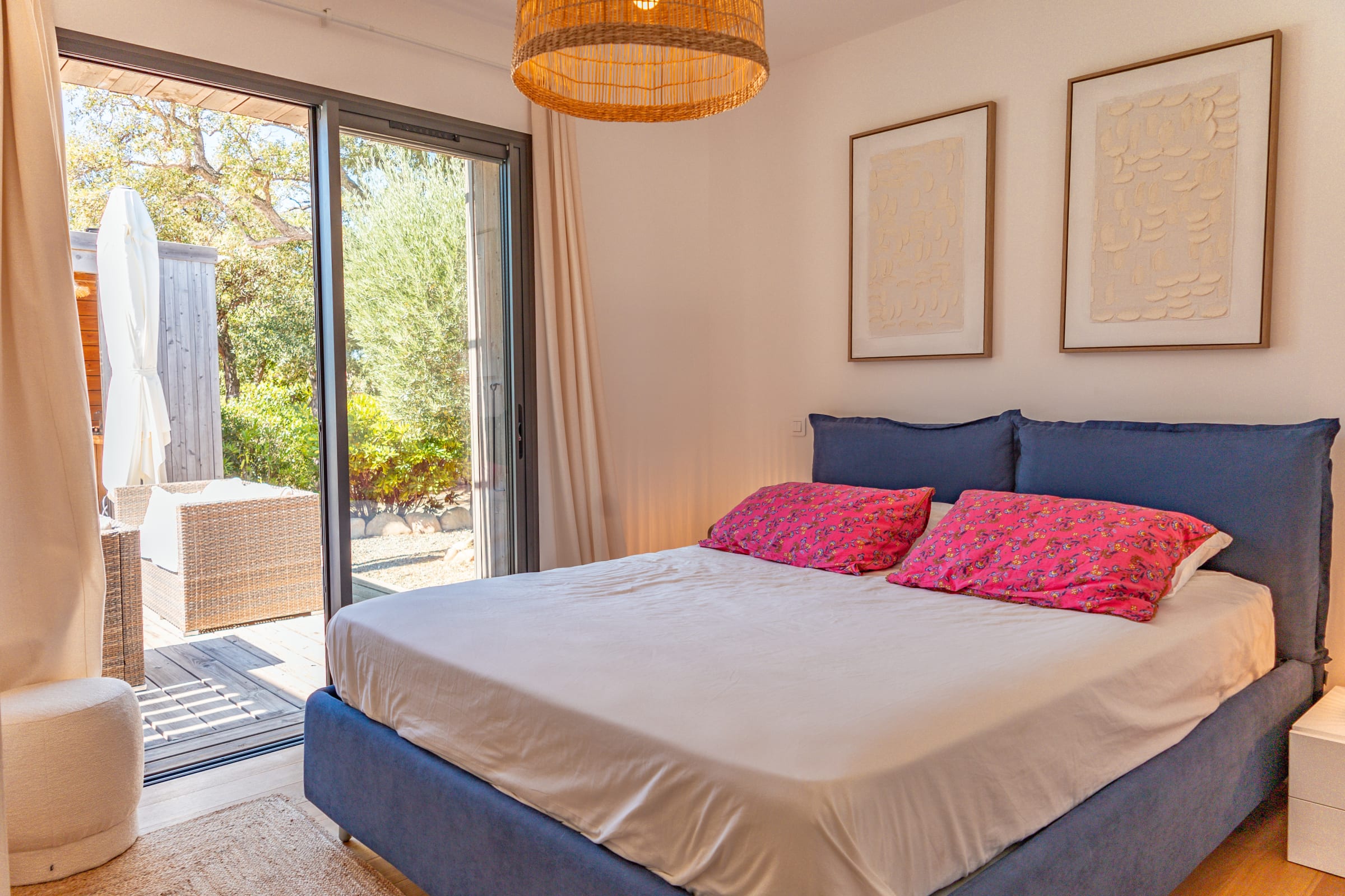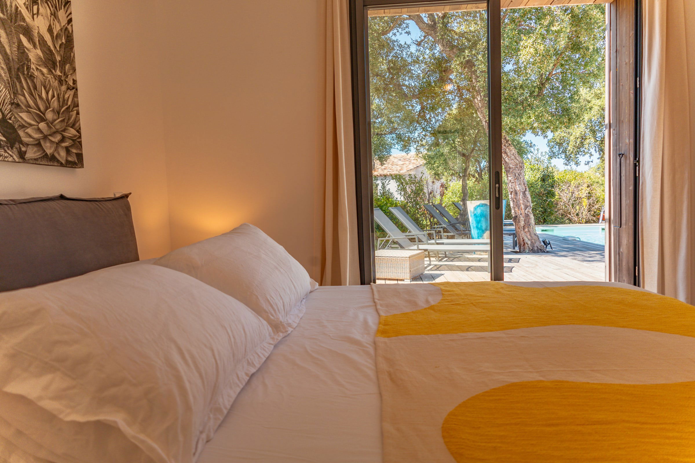 • Chambre 1 : Lit Queen Size (160x200), accès terrasse et piscine, placard intégré.