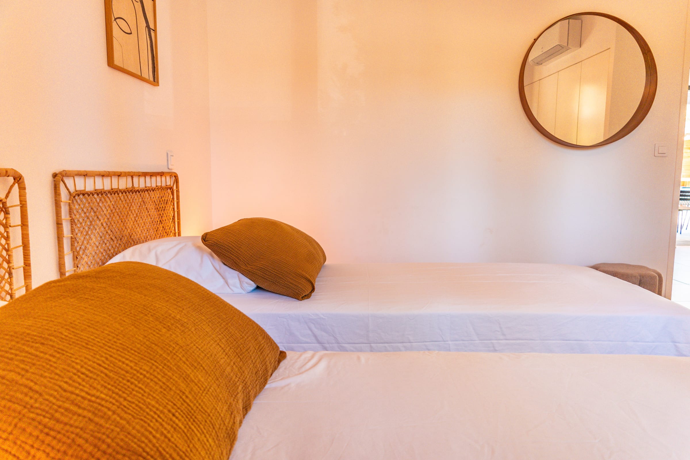 • Chambre 3 : Deux lits simples (80x190), rapprochables pour former un lit double, avec placard intégré.