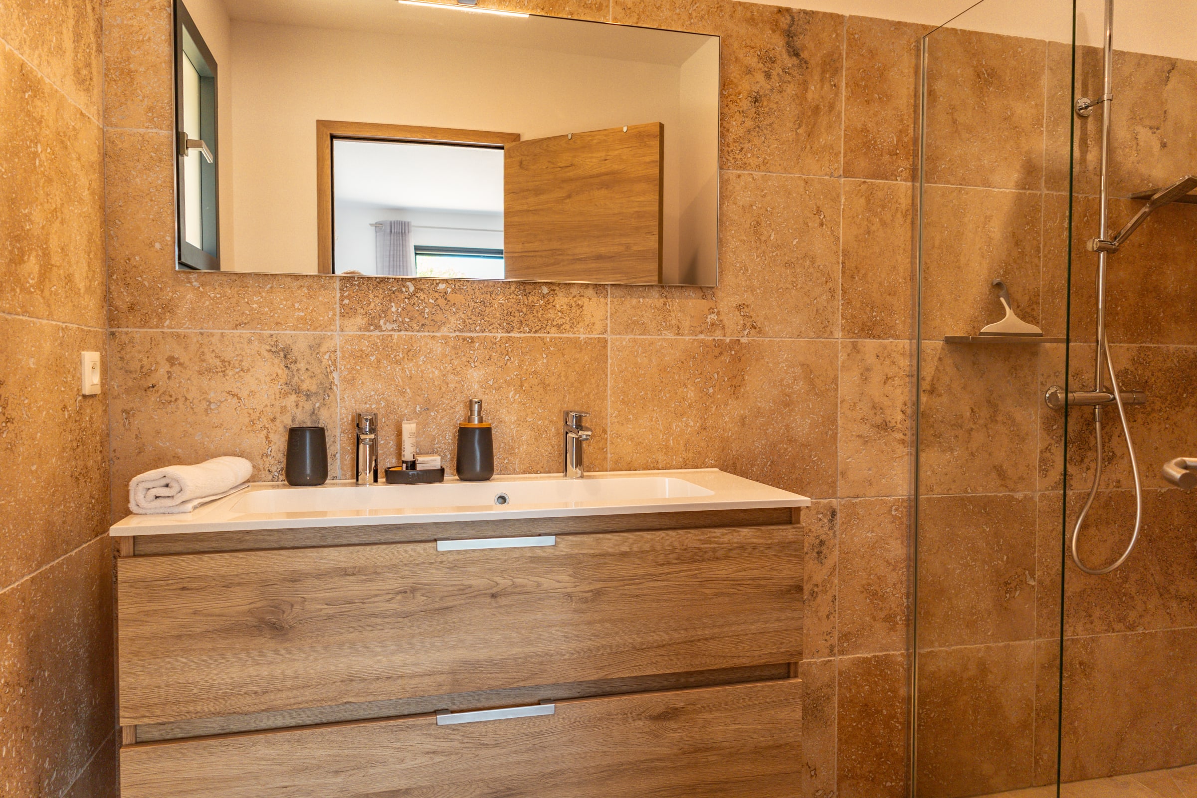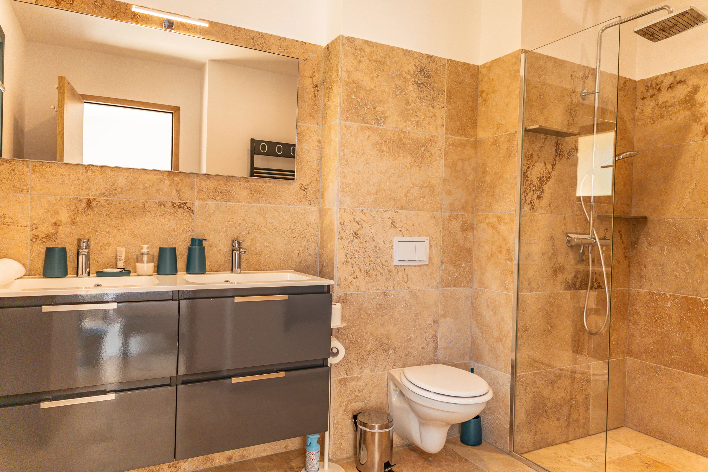 • Chambre 1 : Lit Queen Size (160x200) avec TV, salle de douche privative et toilettes.