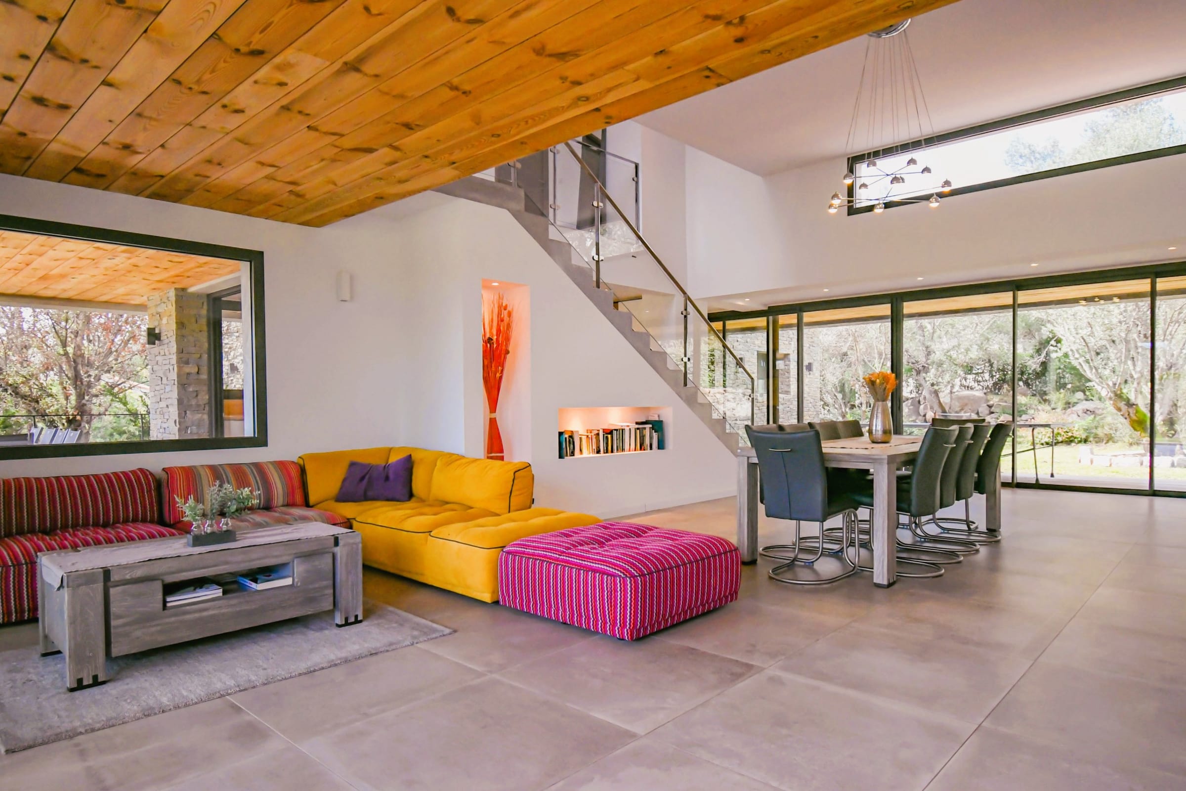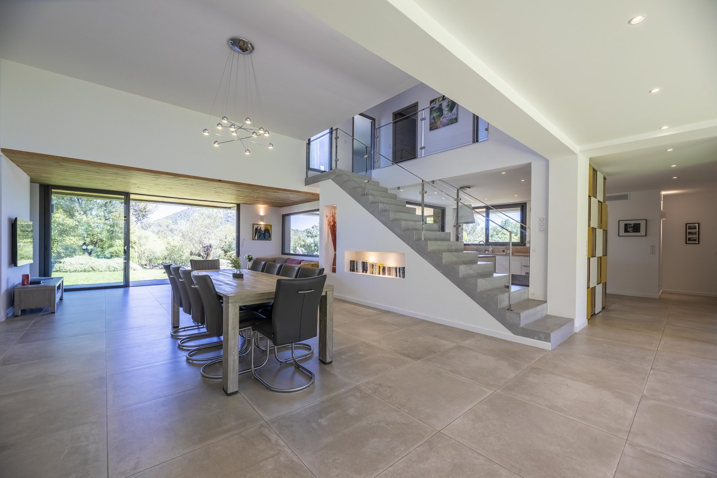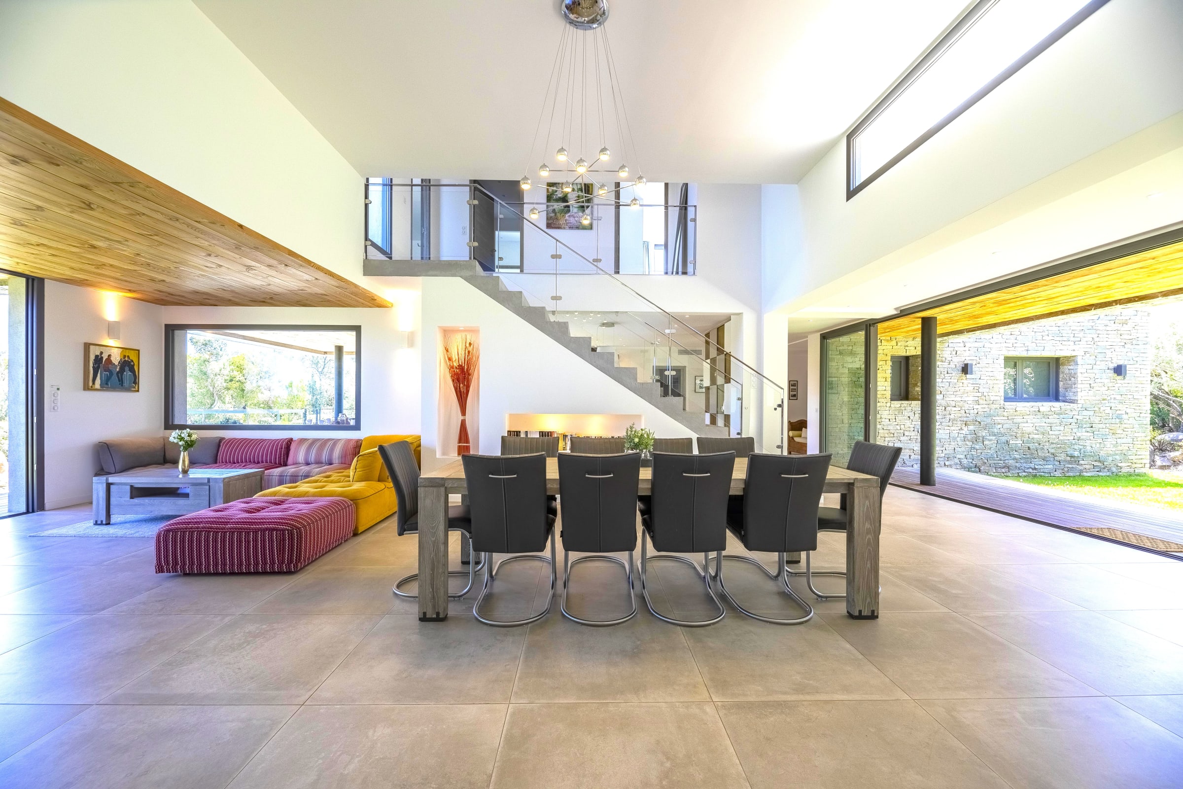 Un grand espace salon et salle à manger avec accès terrasse et piscine.
