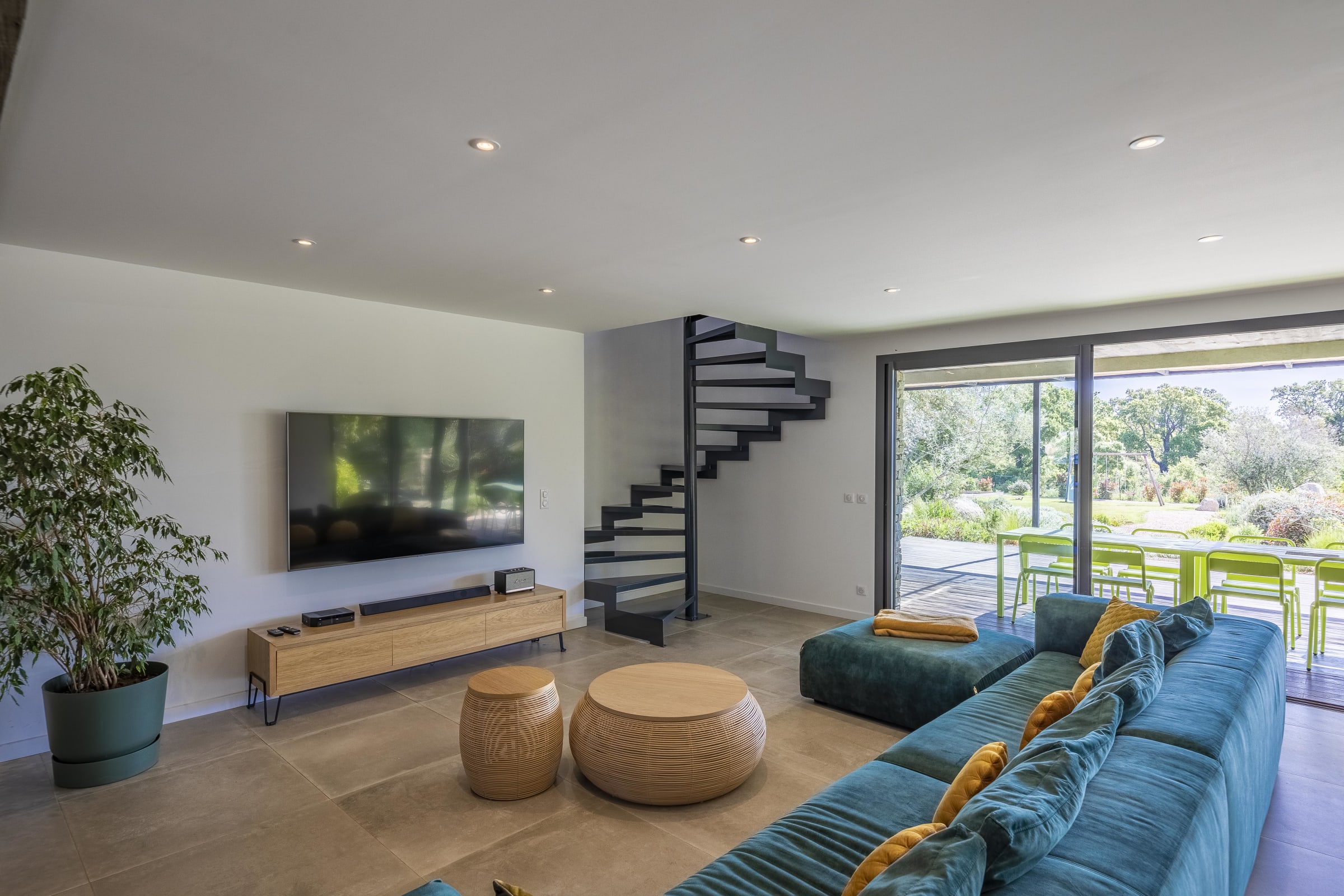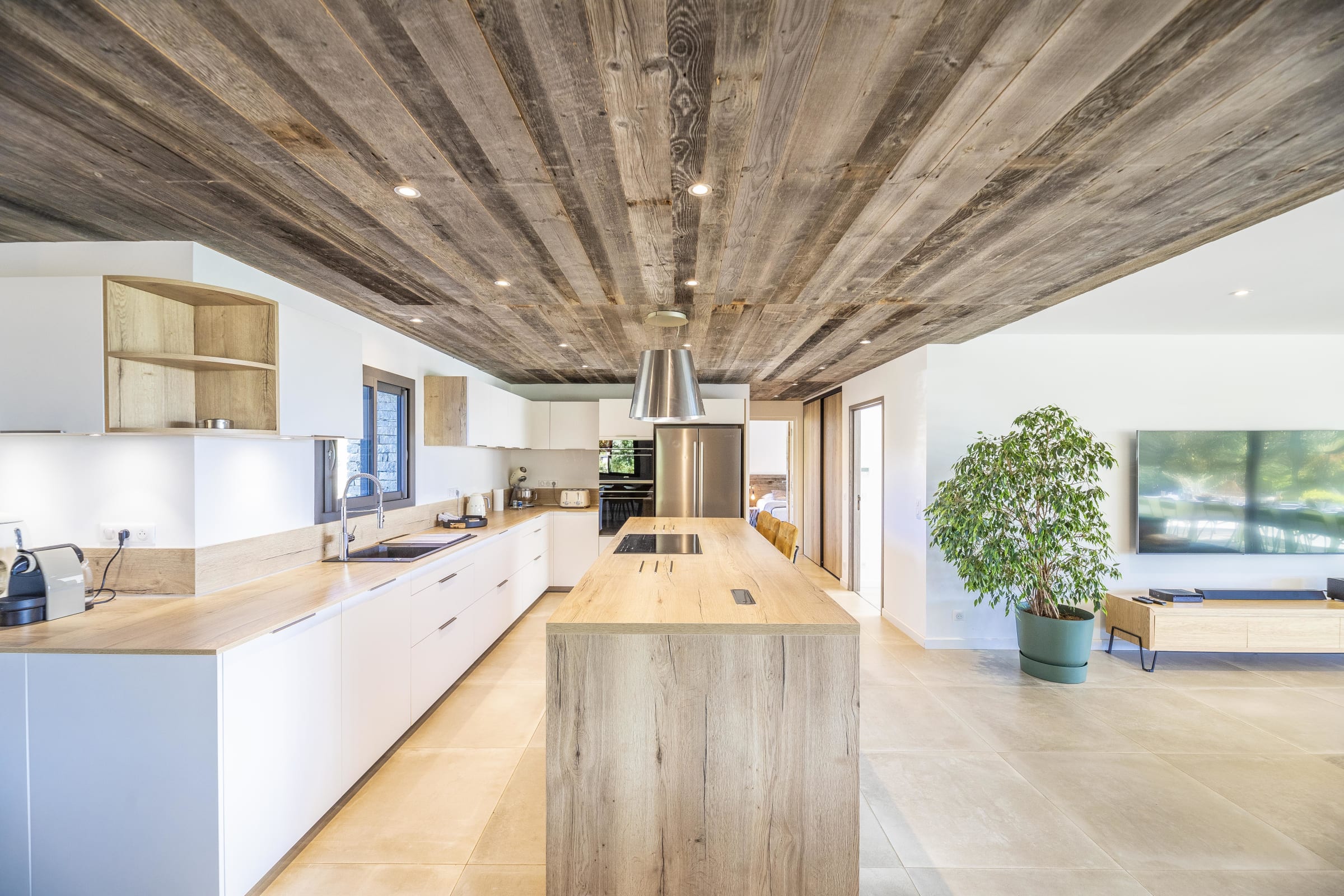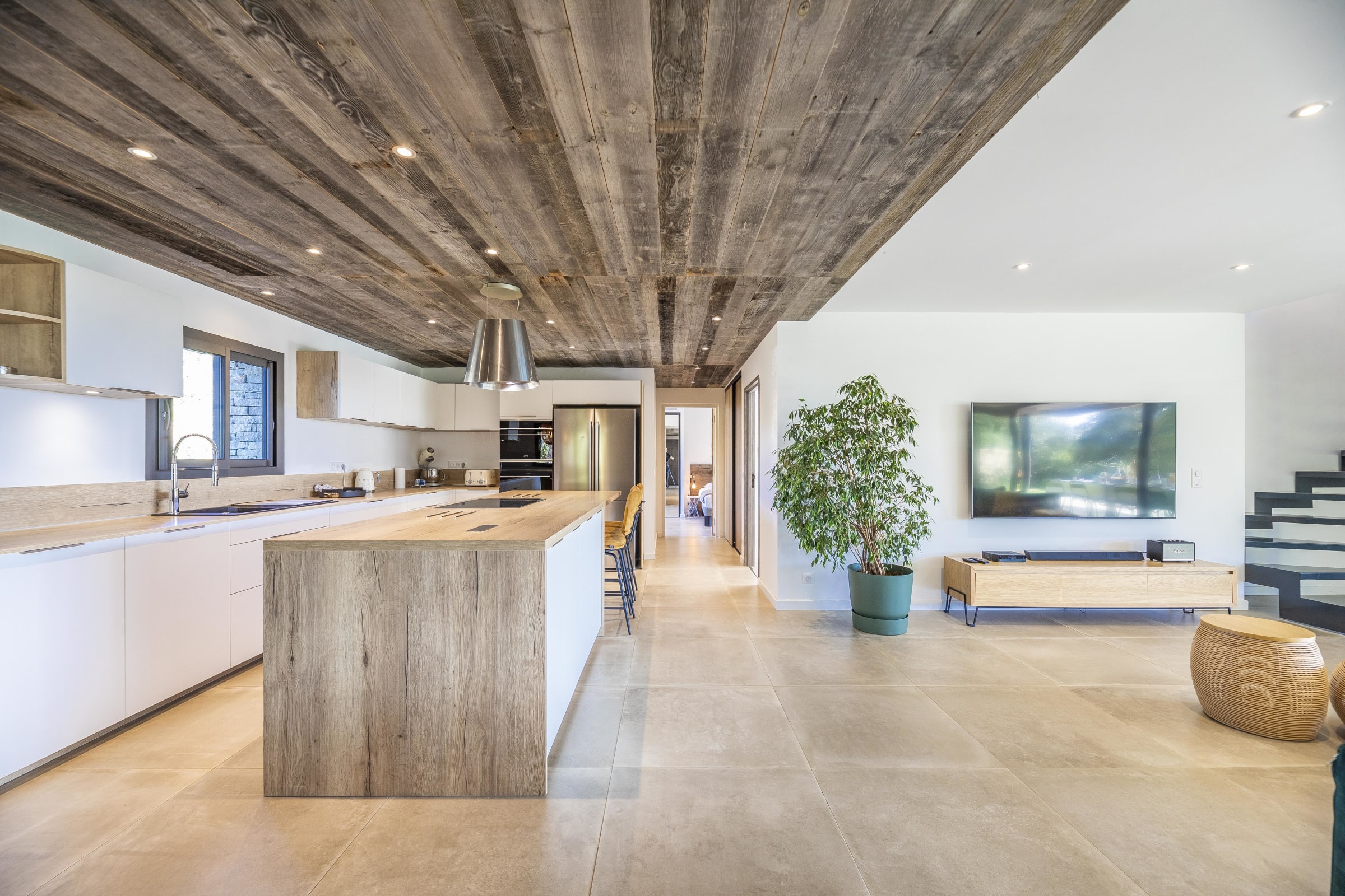 Les larges surfaces vitrées inondent les pièces de lumière et offrent une vue dégagée sur les extérieurs.