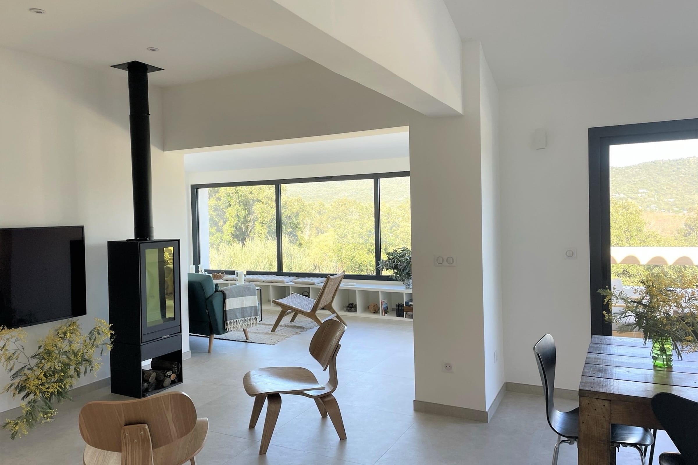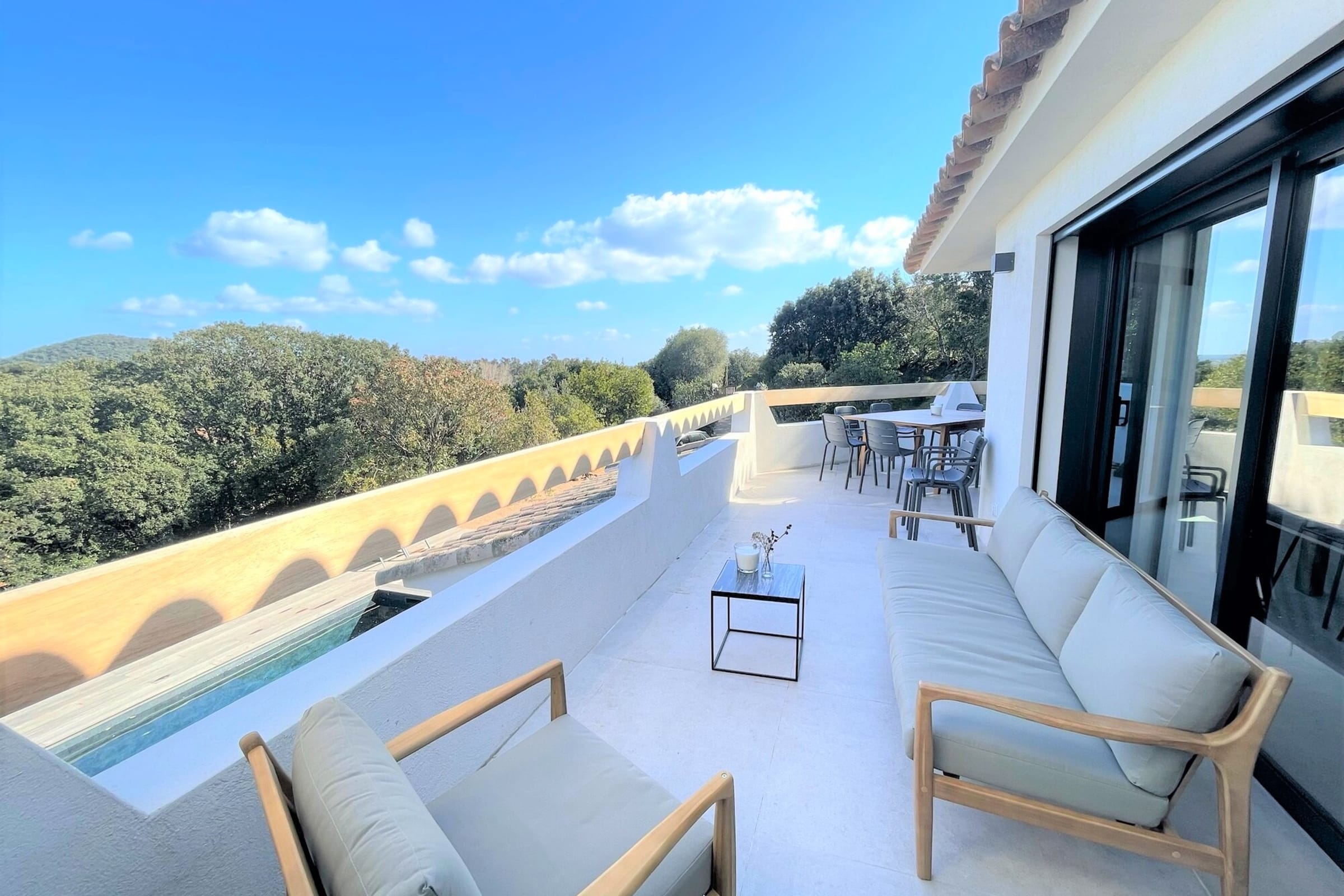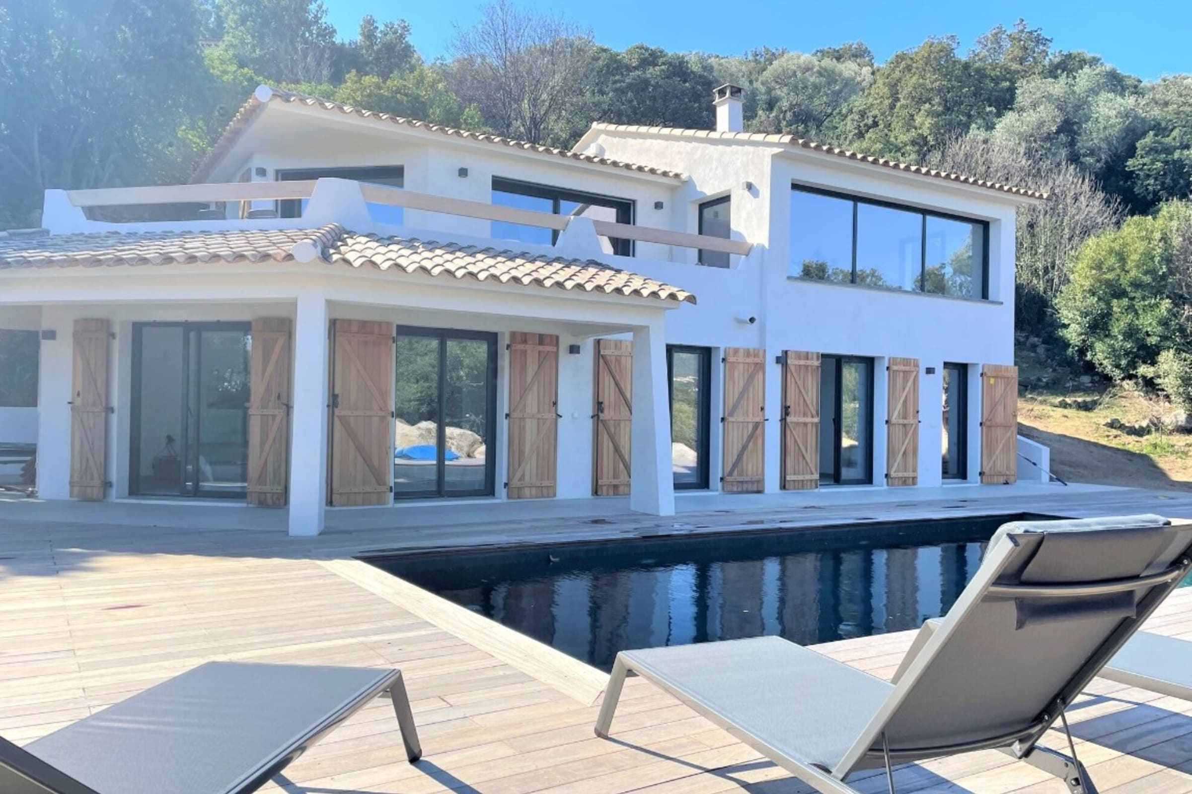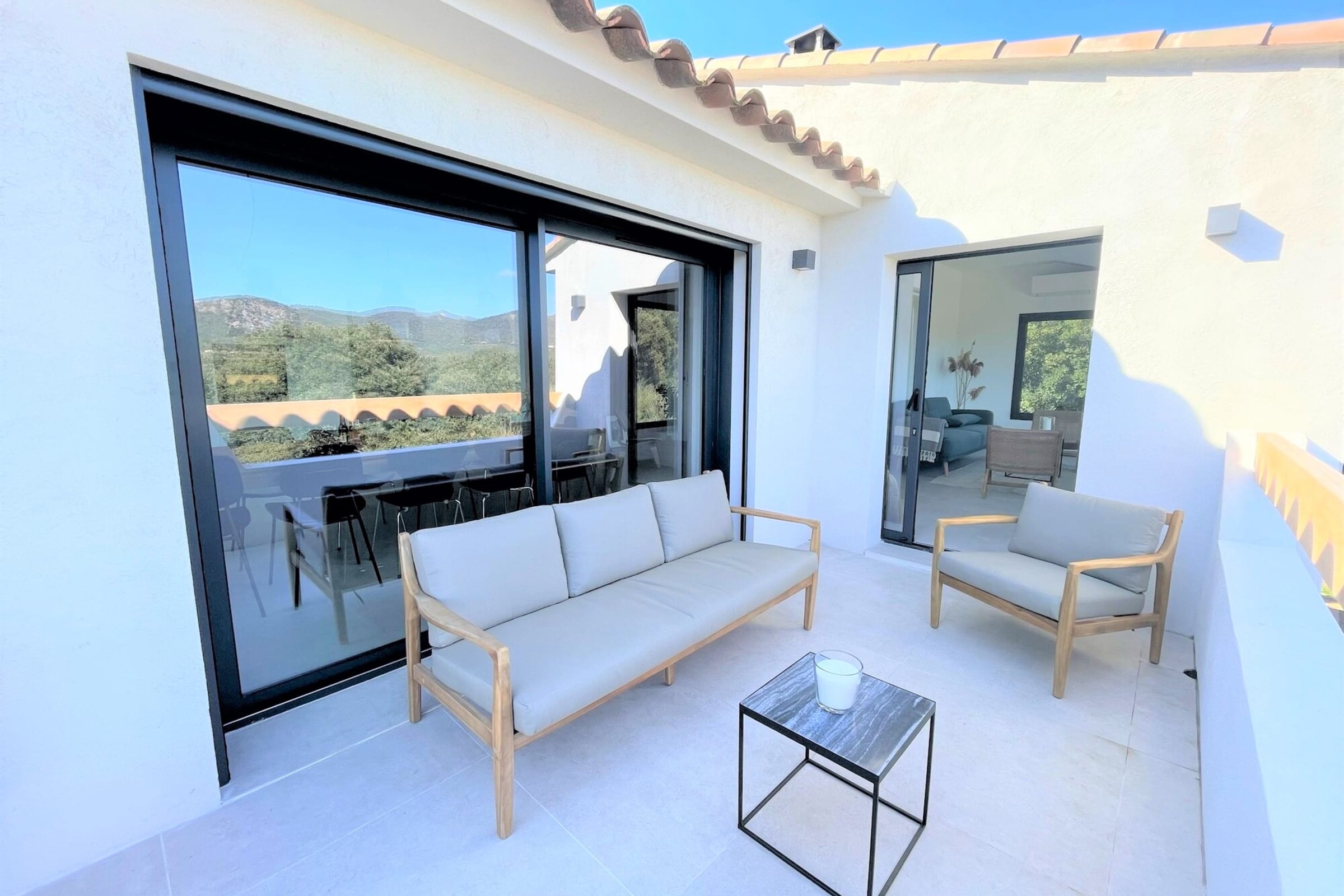 Villa entièrement rénovée (193 m2) avec un bel espace de vie organisé autour d’une grande table familiale, lumineux et ouvert sur une terrasse entièrement aménagée avec salon d’été, table extérieur et coin repas avec plancha. Le salon offre une vue contemplative sur les montagnes et maquis. Cuisine américaine entièrement équipée.