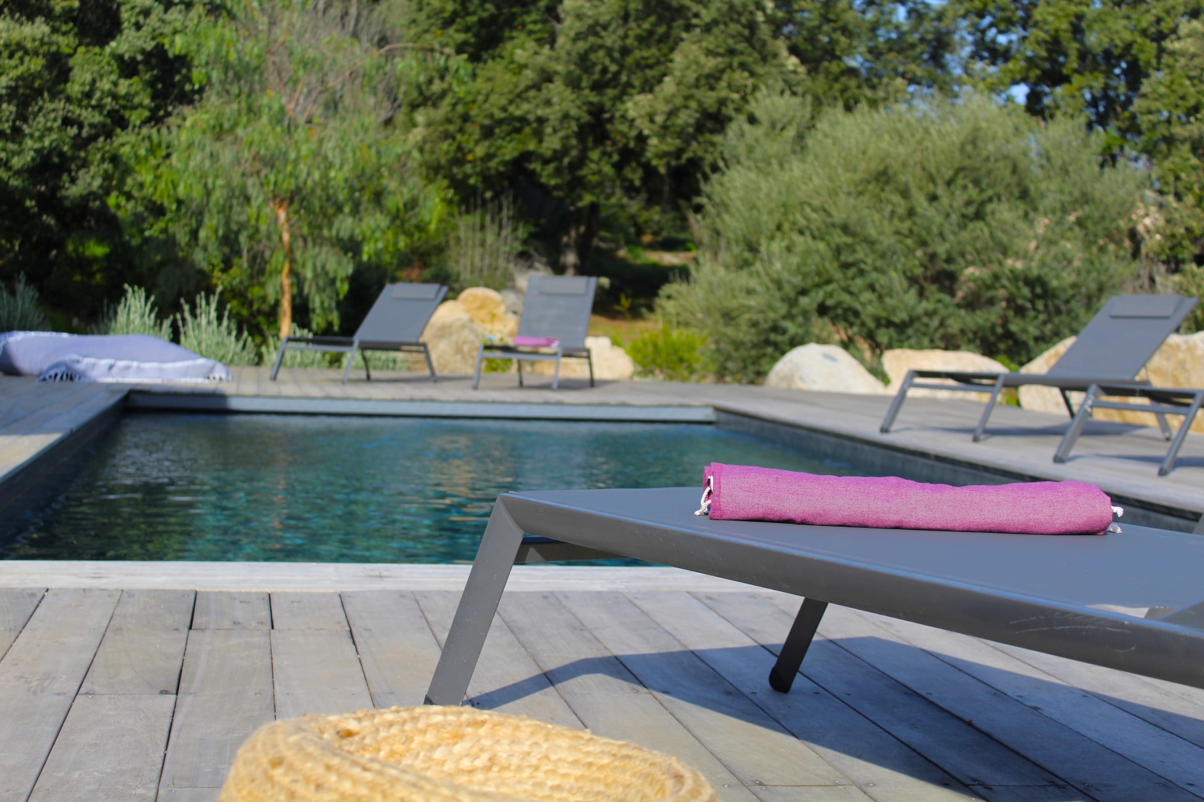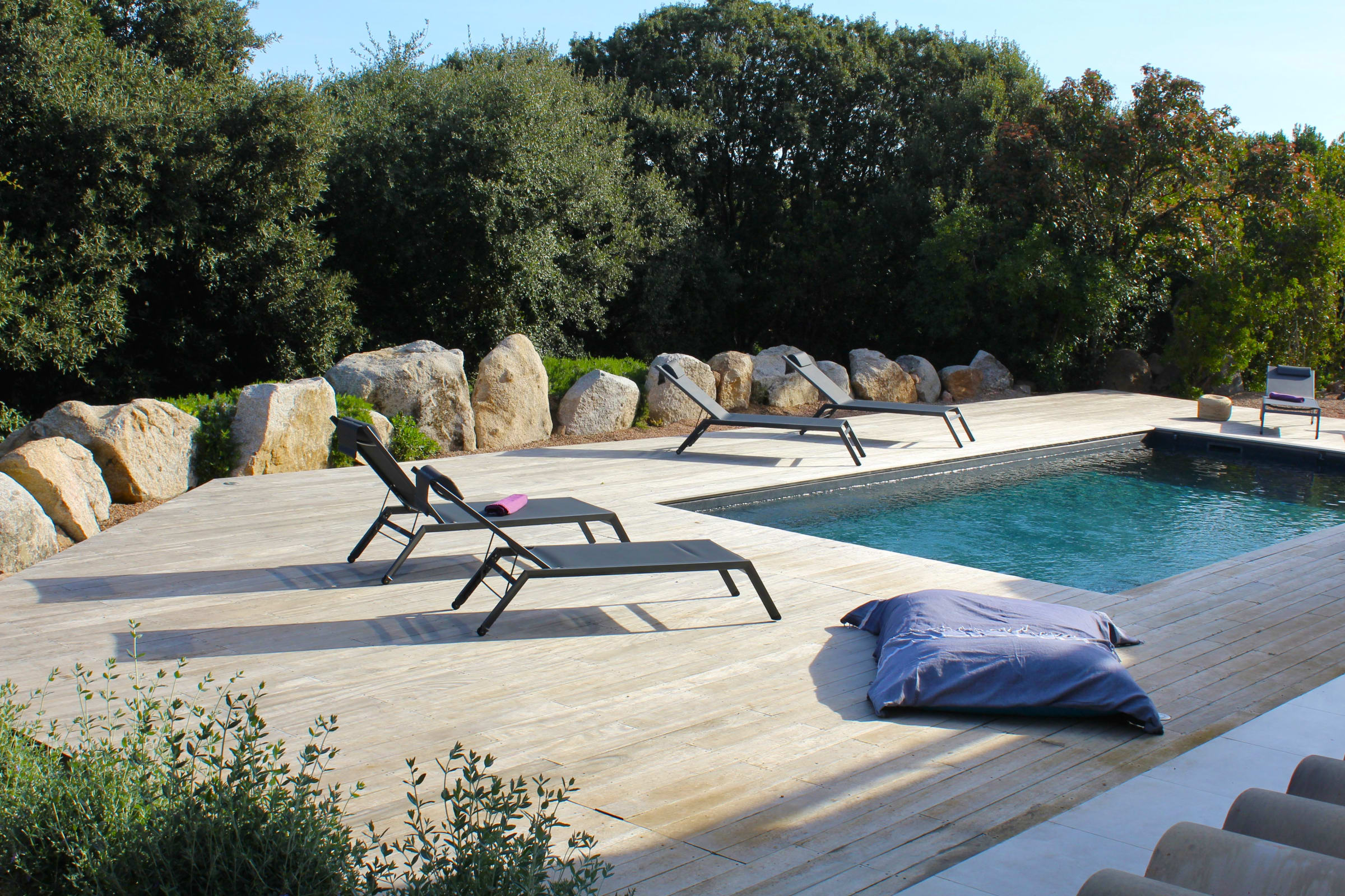Piscine 4*9 chauffée, sécurisée par un volet roulant immergé, entourée d’une terrasse de 200 m2, en bois exotique équipée avec 6 bains de soleil extérieurs, parasol.