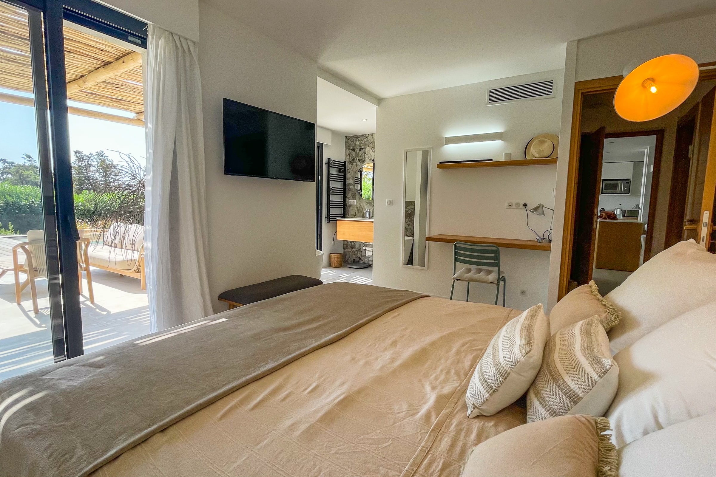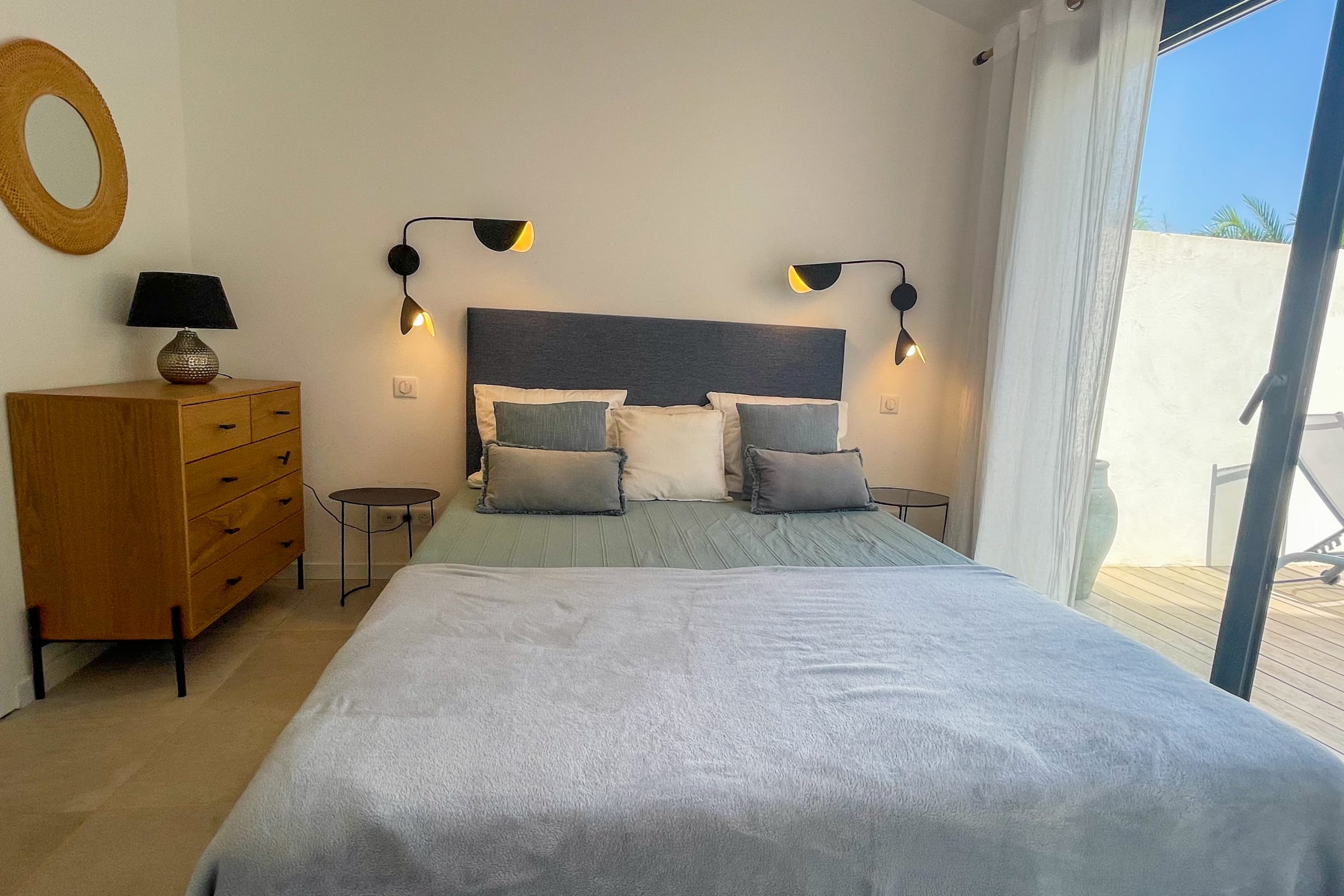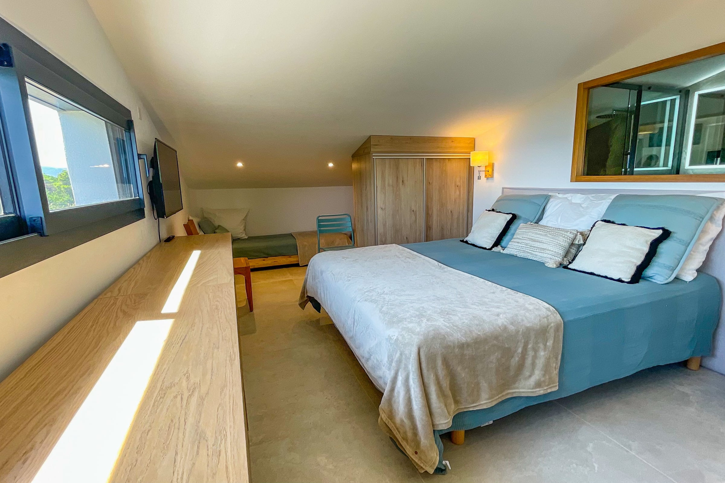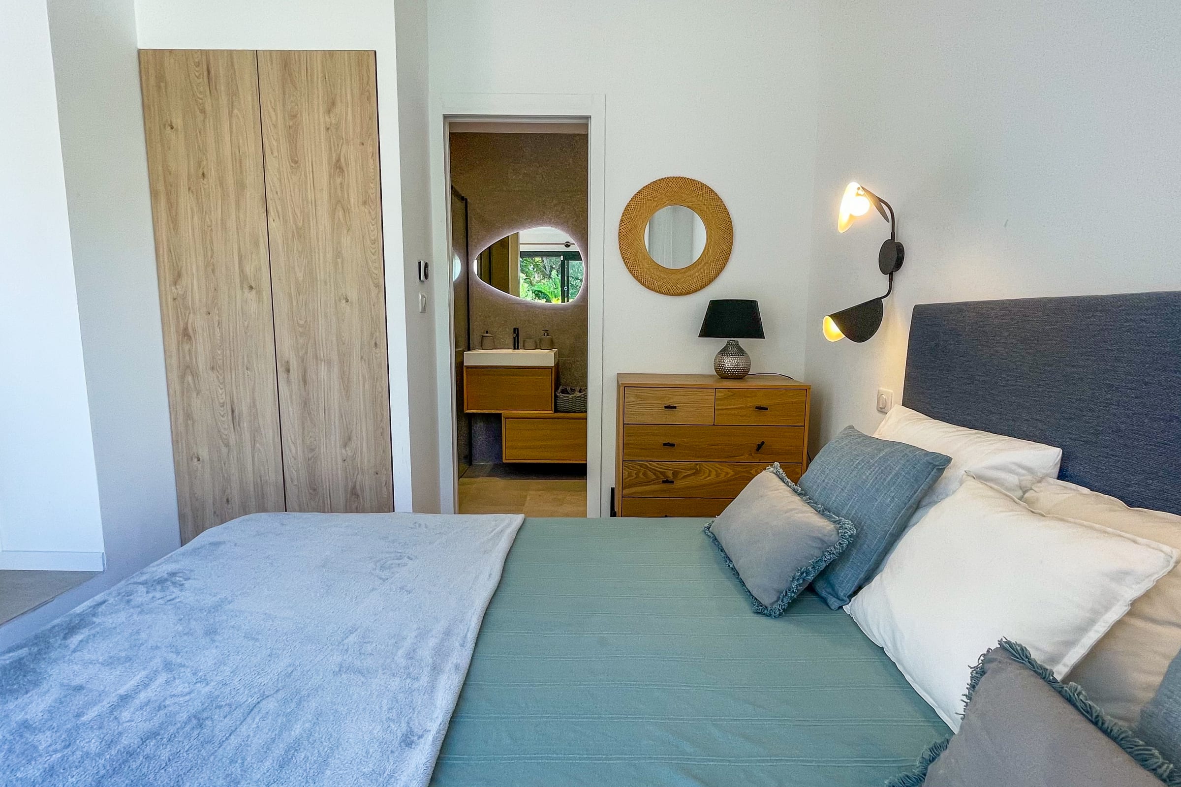• Suite parentale avec lit de 180x200 (modulable en 2 lits de 90x200), salle de bain privée et vue sur la mer depuis la terrasse.