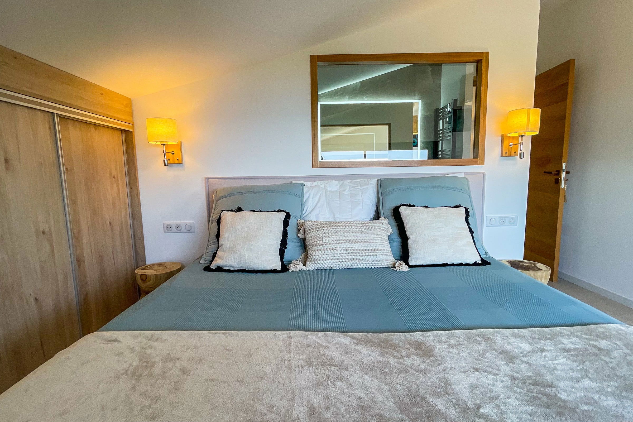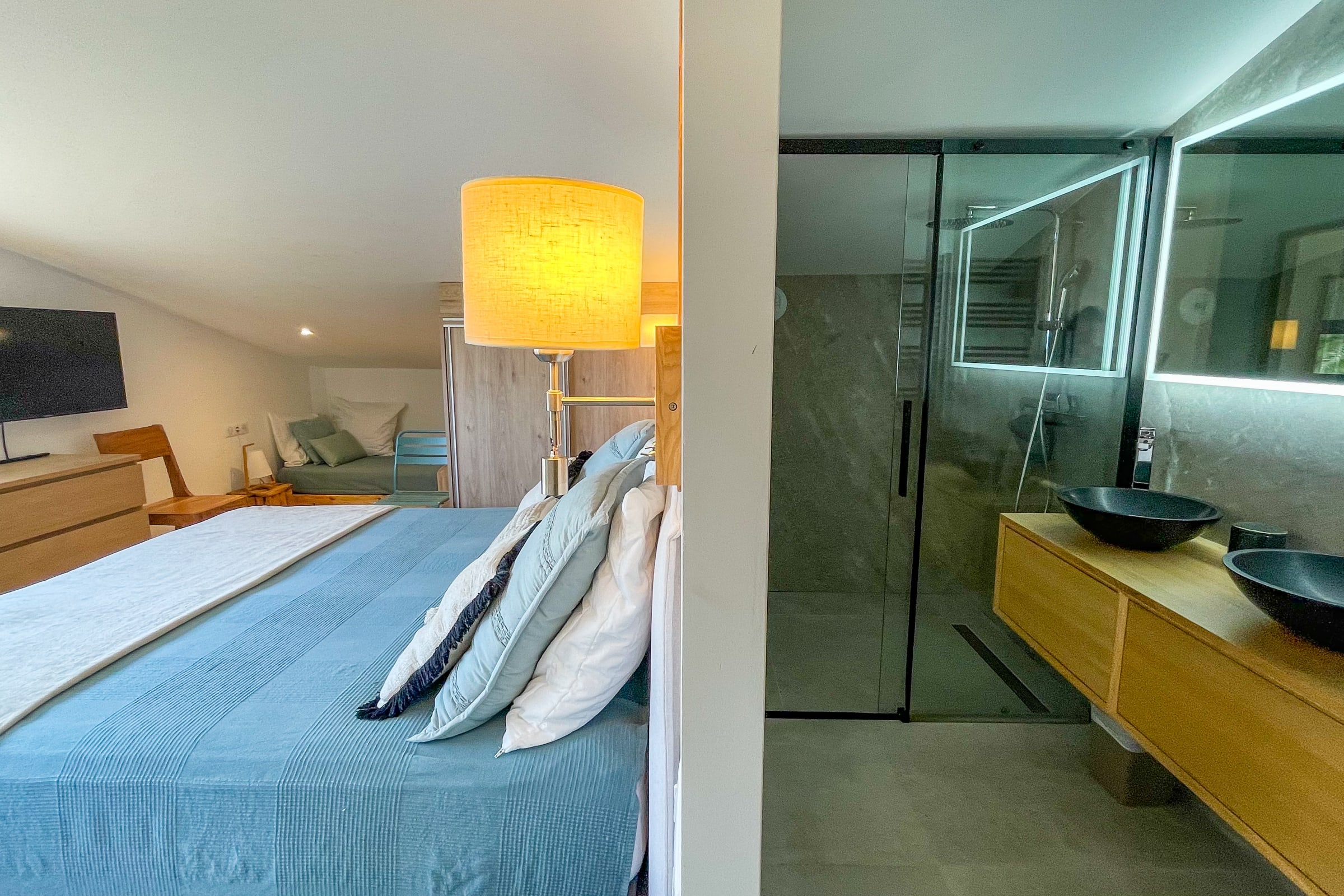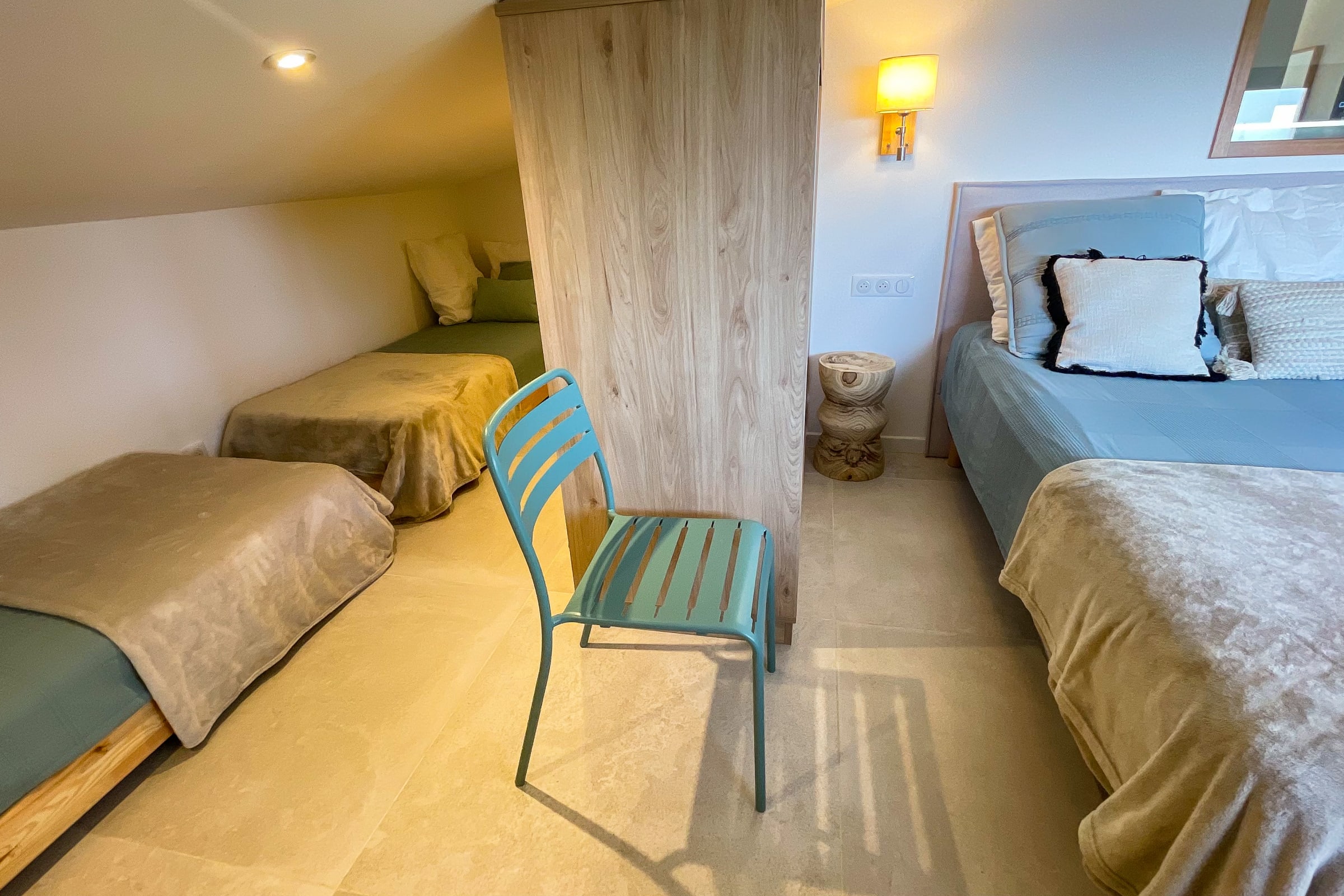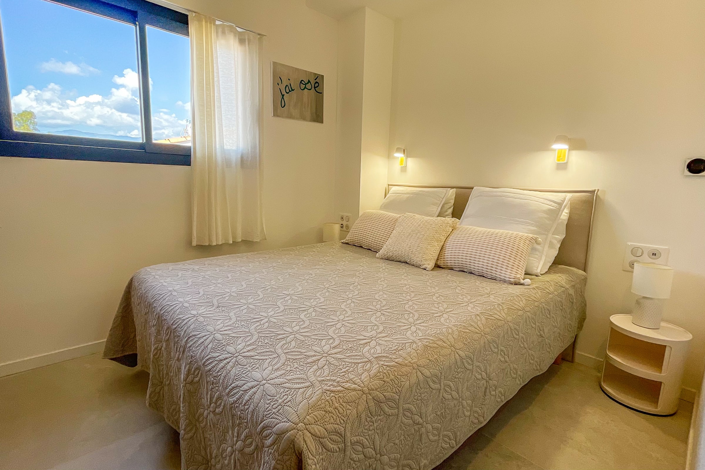 • Suite parentale avec lit de 180x200 (modulable en 2 lits de 90x200), salle de bain privée et vue sur la mer depuis la terrasse.