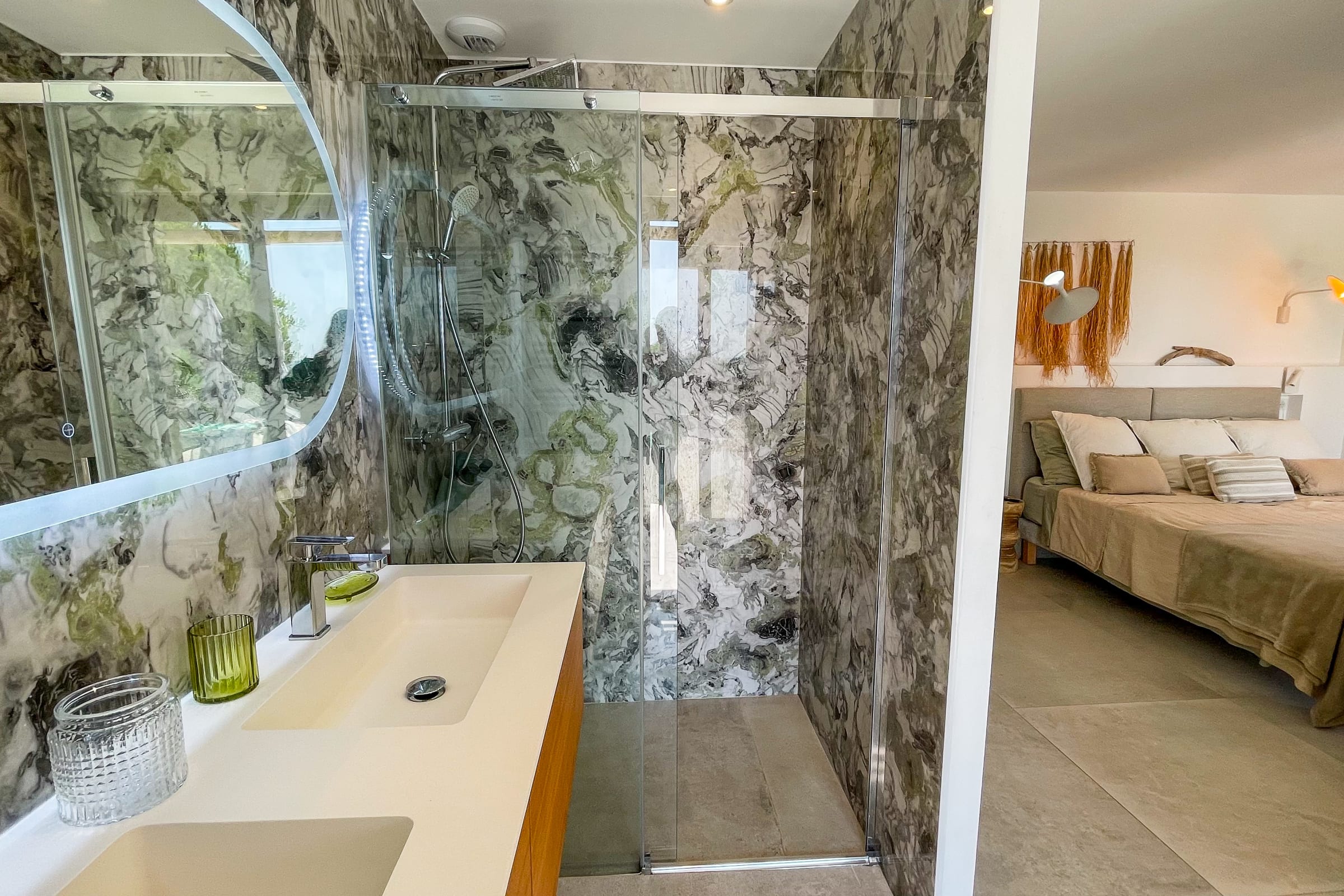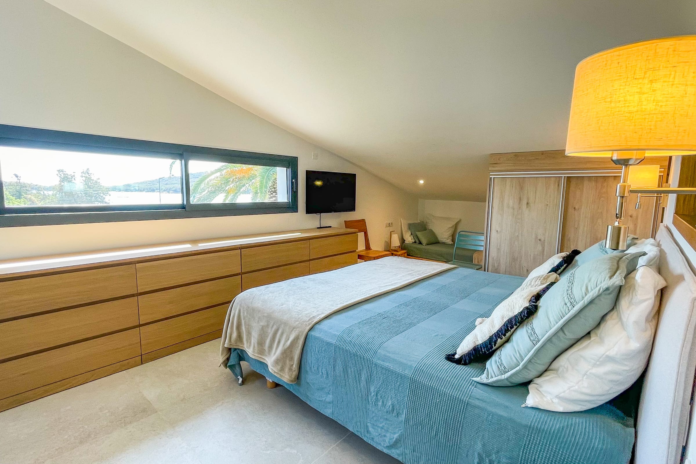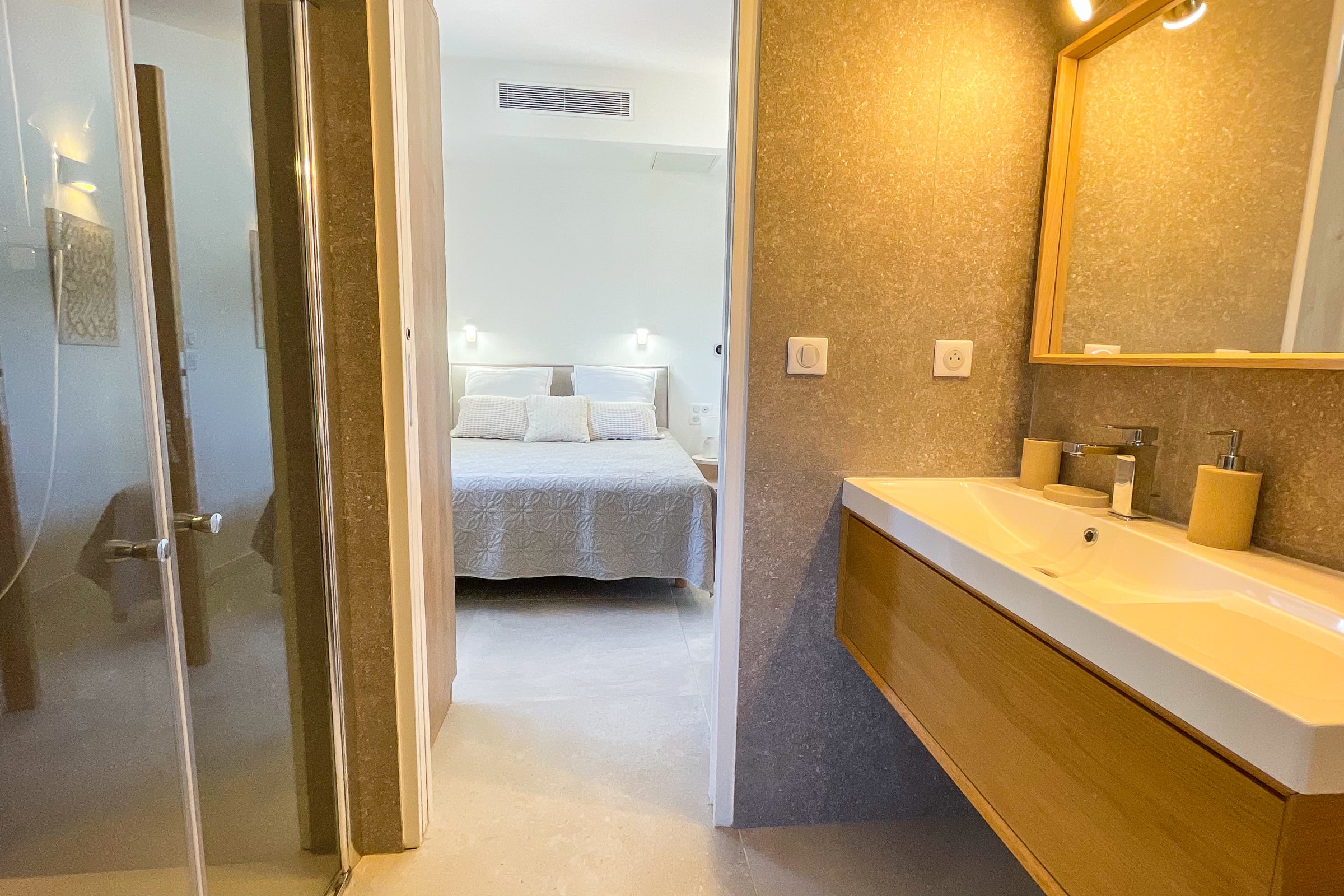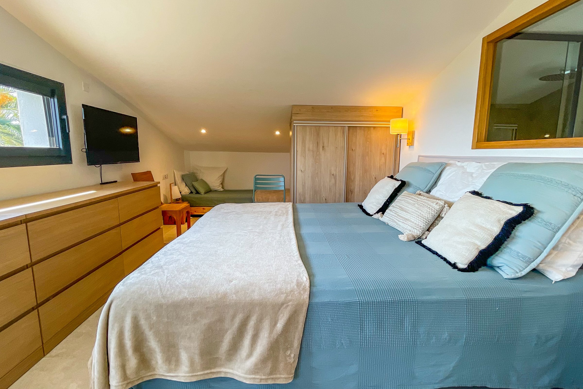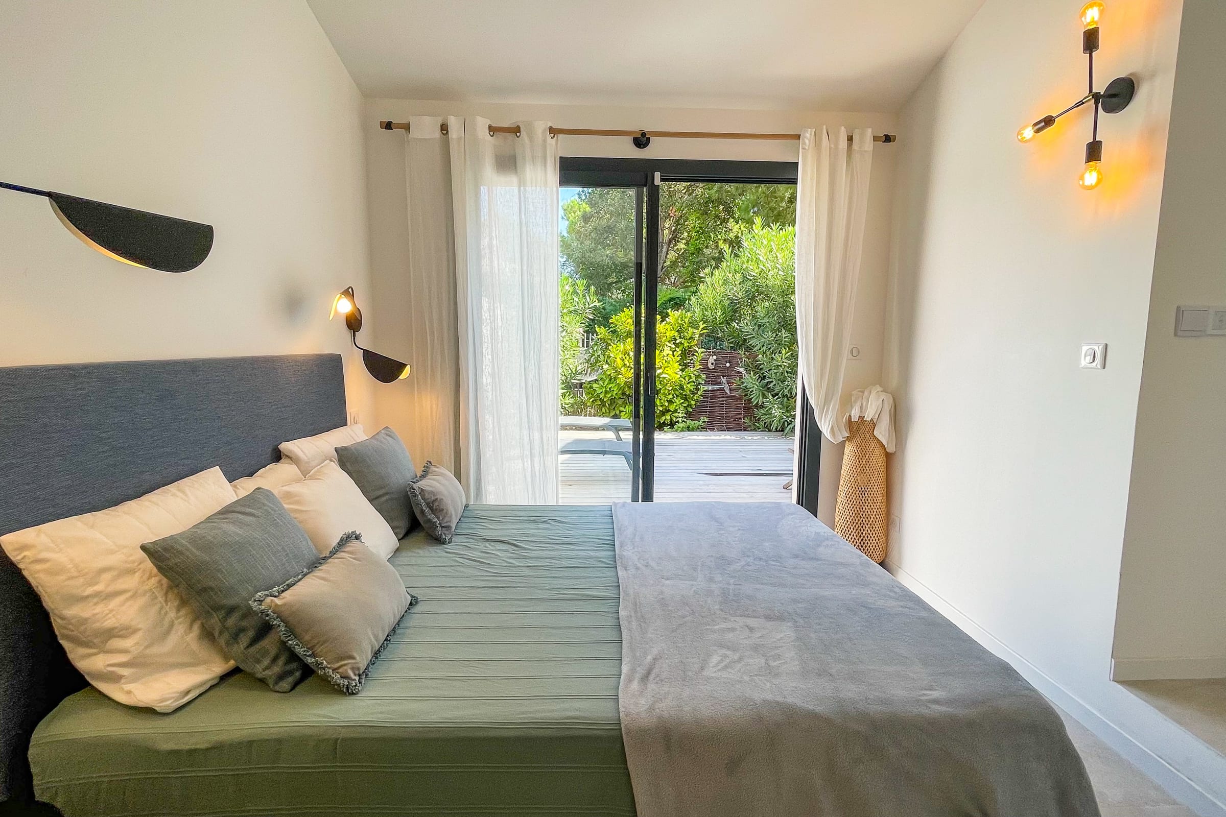 • Suite parentale avec lit de 180x200 (modulable en 2 lits de 90x200), salle de bain privée et vue sur la mer depuis la terrasse.
