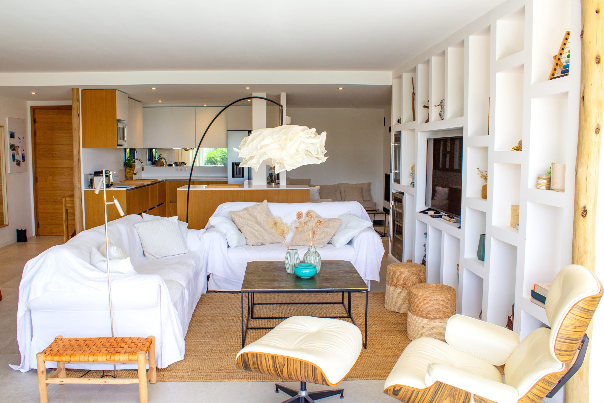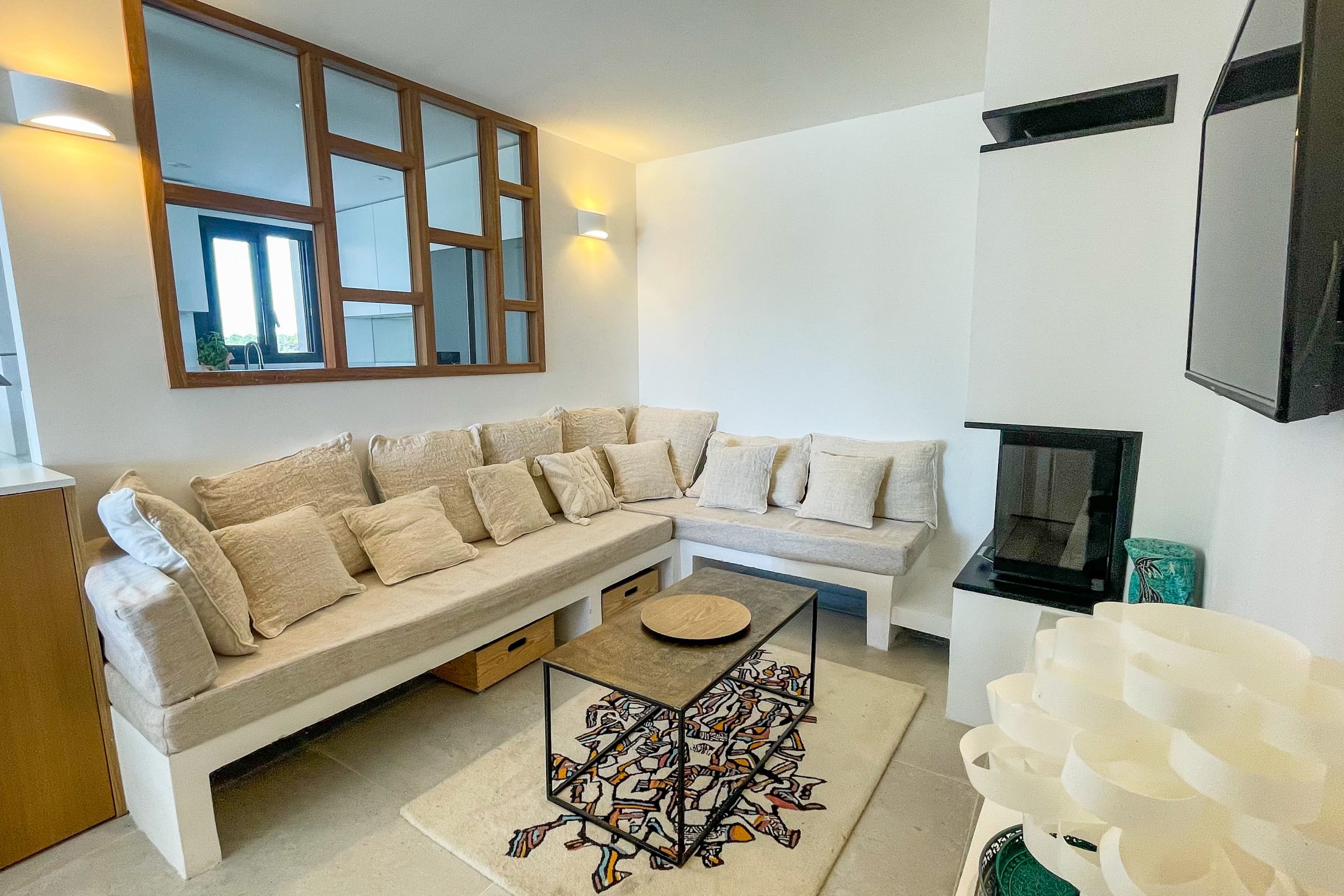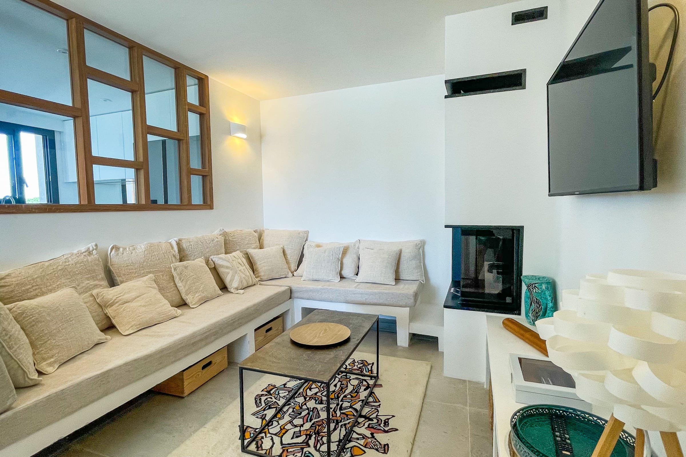• Salon/salle à manger lumineux avec vue panoramique sur la mer, cuisine ouverte entièrement équipée et petit coin salon.