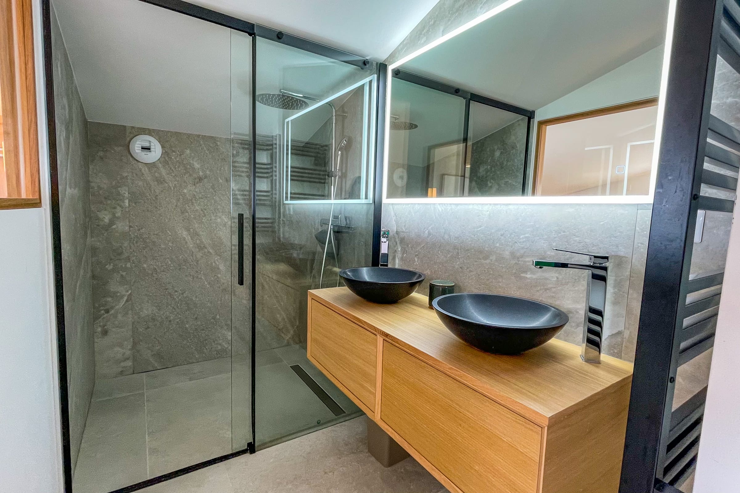 • Suite familiale avec lit de 180x200 (modulable en 2 lits de 90x200) et 2 lits d'appoint de 80x200, salle de bain privée et WC séparé.