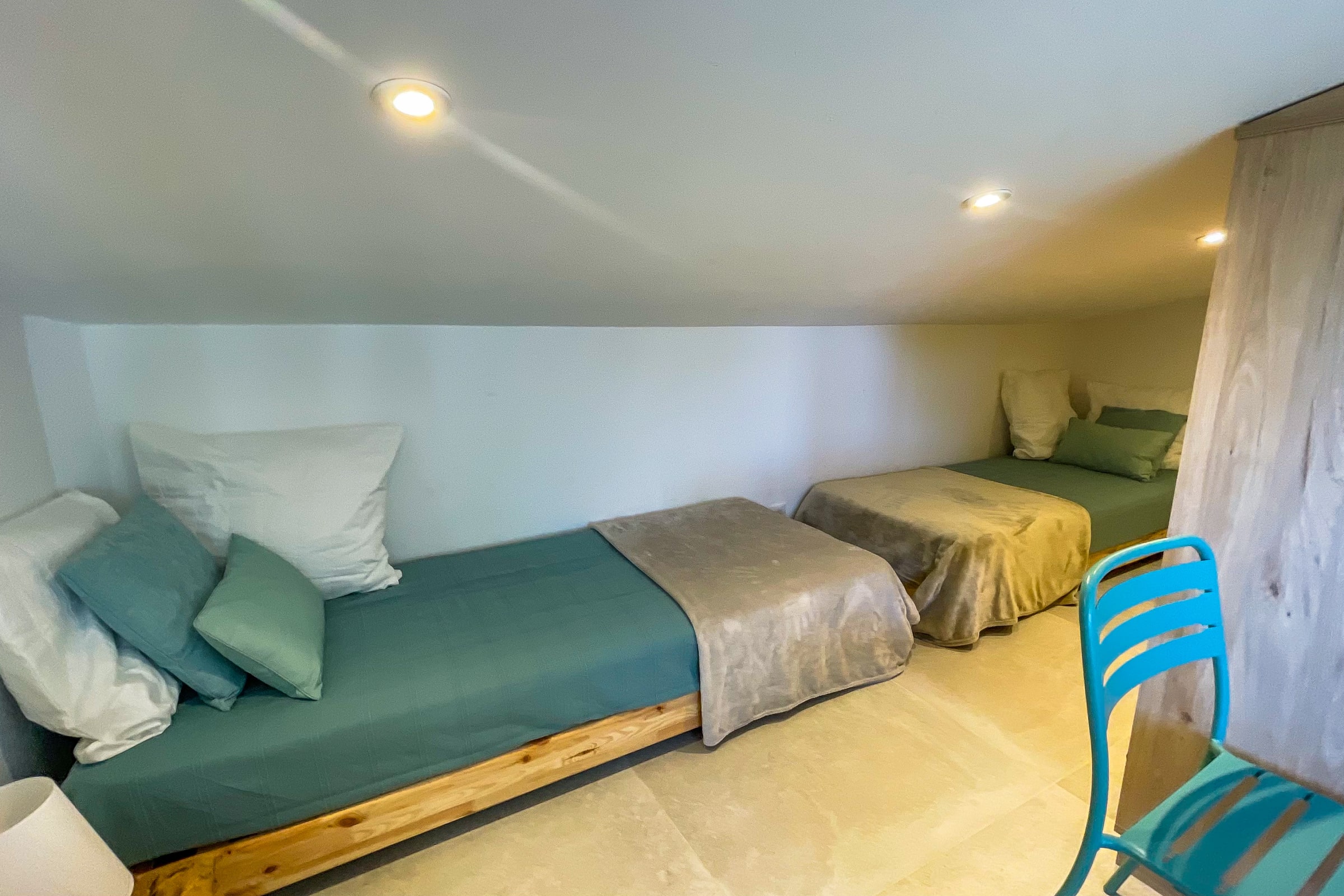 • Chambre double avec lit de 160x200 (modulable en 2 lits de 80x200), salle de bain attenante et vue sur la mer.