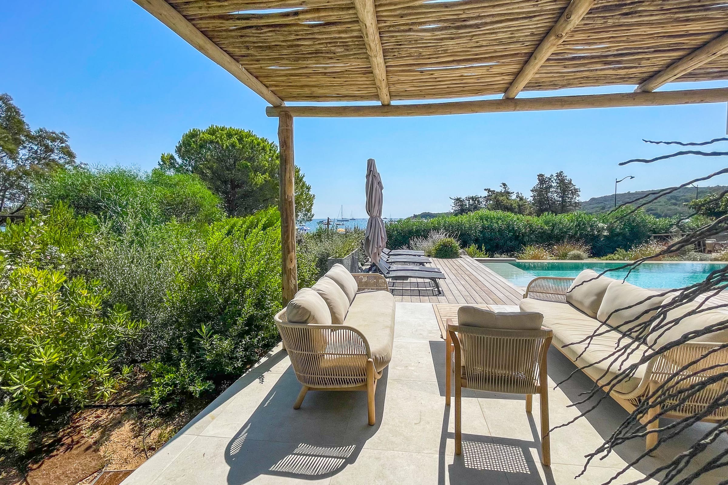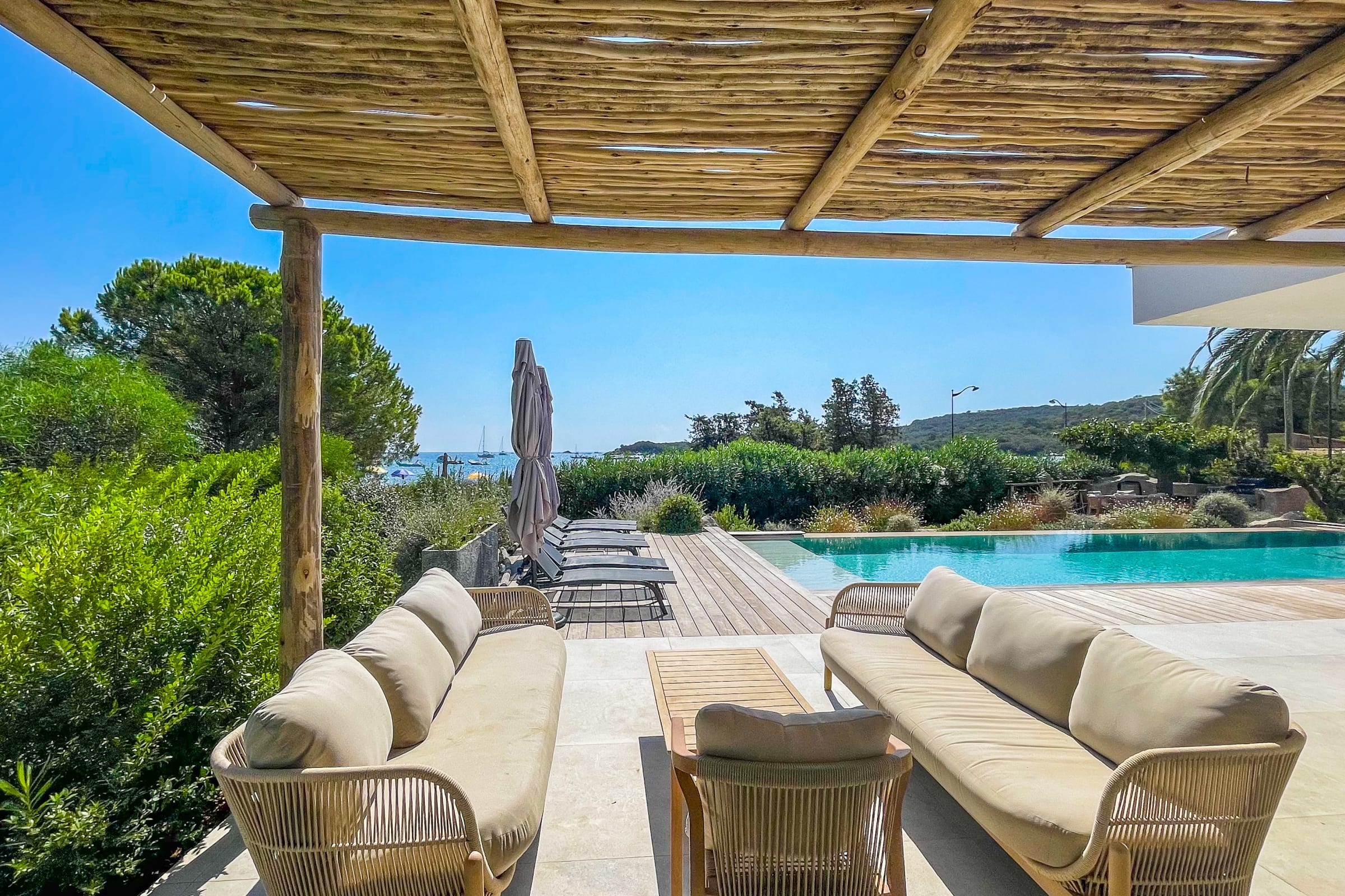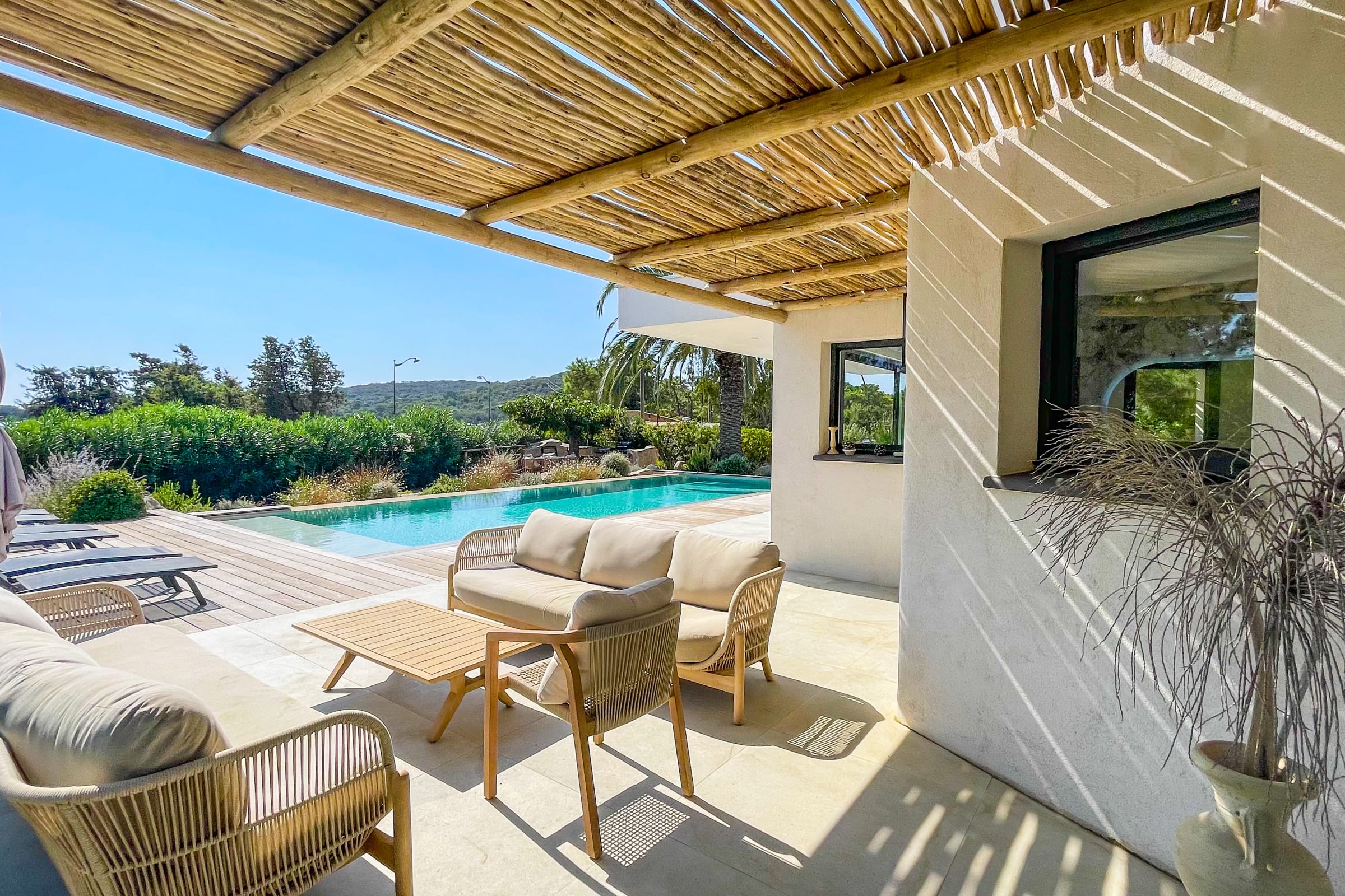 Grande terrasse avec coin salon, 6 bains de soleil et un espace repas pour déjeuner à l'abri du soleil.