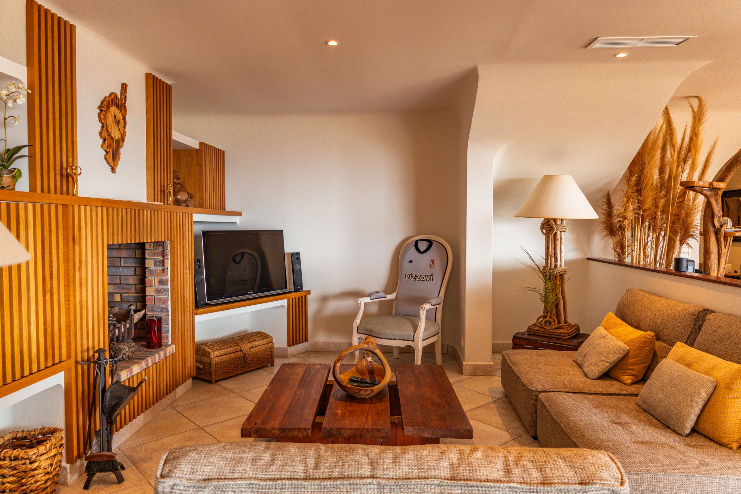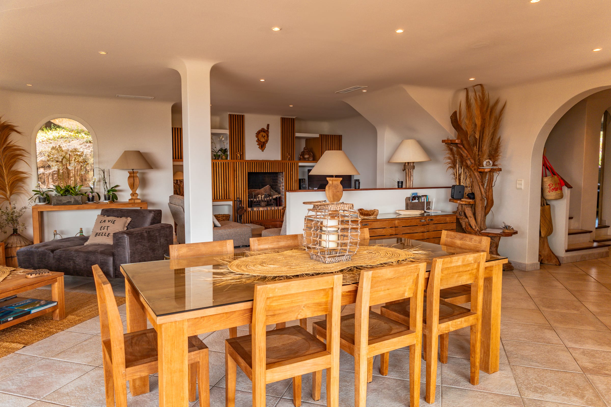 - Un coin salon et cheminée pour une ambiance chaleureuse, cosy et conviviale.