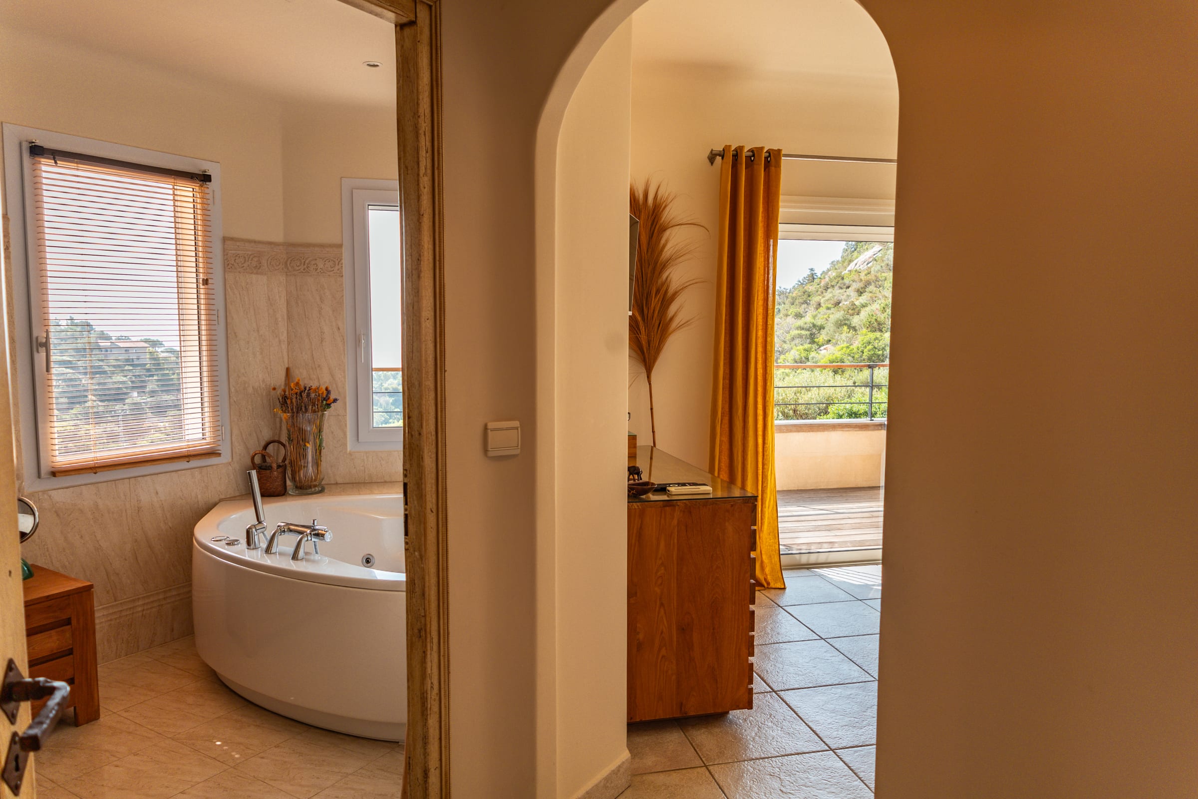 - Chambre 2 : Lit King Size 180 cm avec terrasse vue mer, un dressing, une salle de bain attenante avec baignoire , douche et WC.