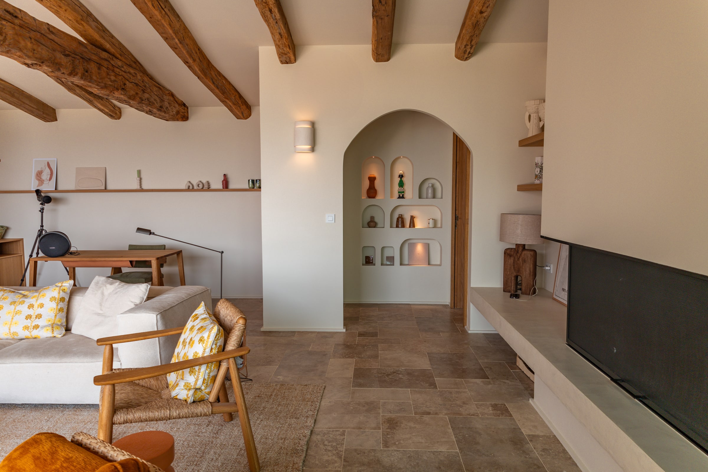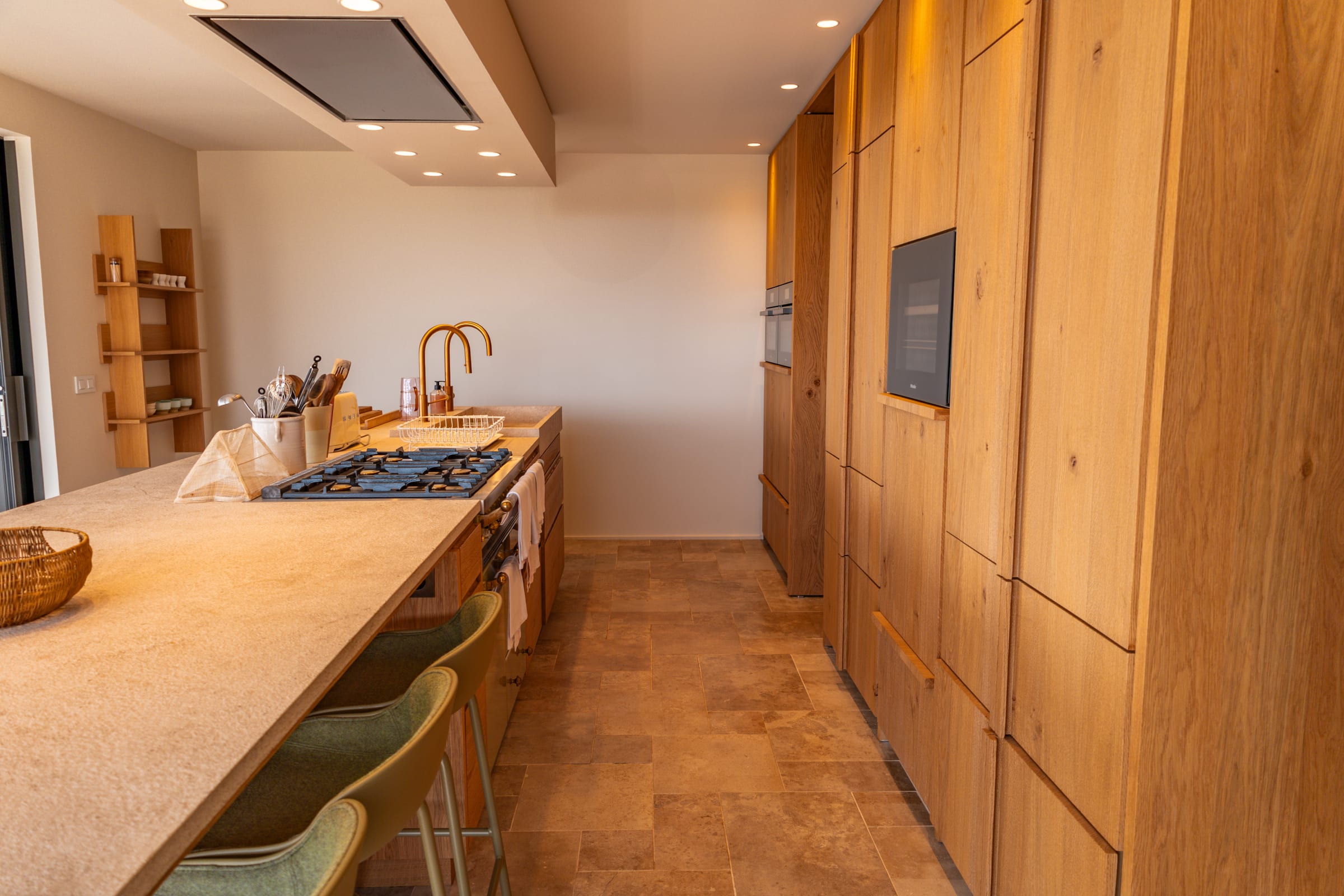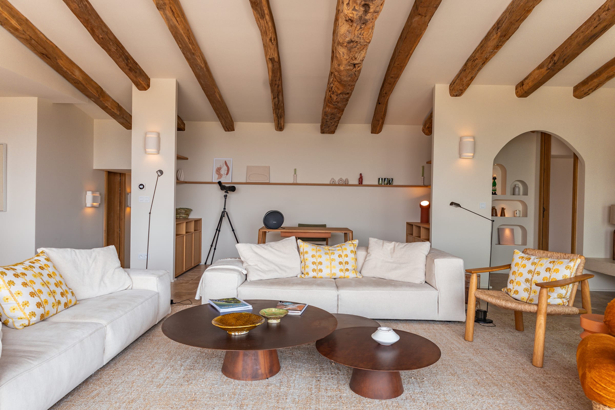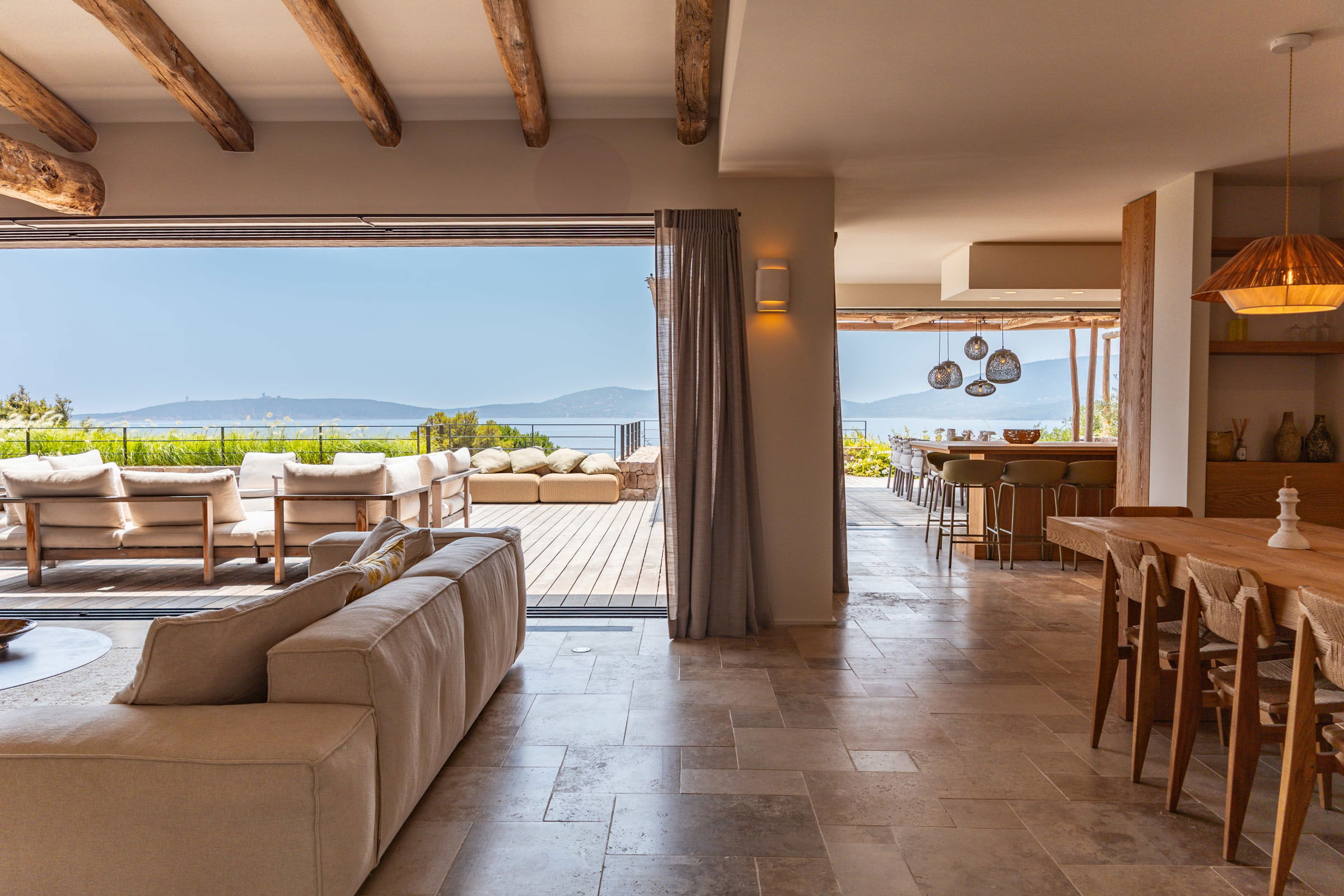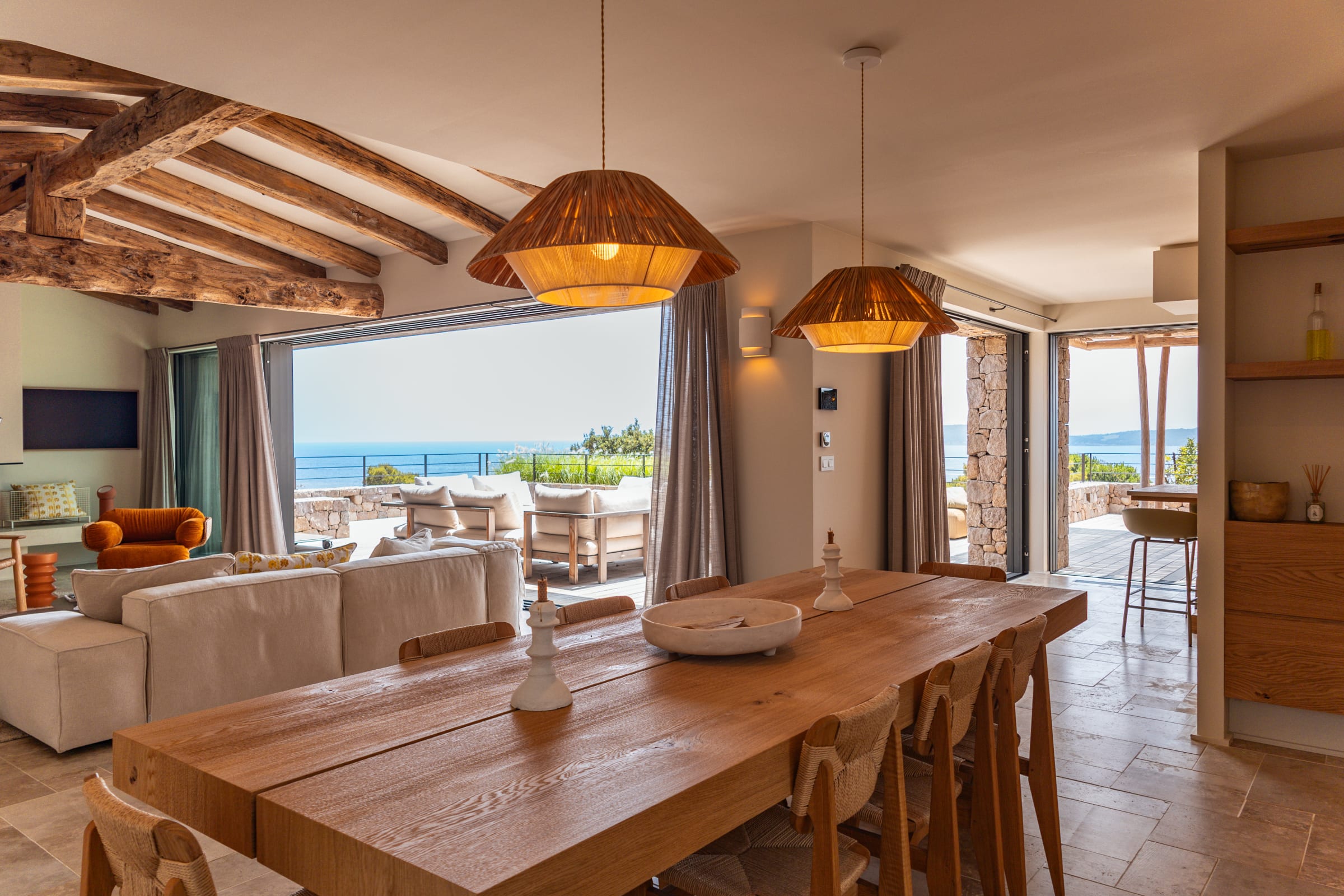 Un vaste espace de vie baigné de lumière, avec un coin salon confortable face à une grande télévision, ouvert sur une salle à manger conviviale. L'ensemble donne sur la terrasse avec une vue mer spectaculaire. Une cuisine entièrement équipée complète ce lieu de vie central, idéale pour partager de bons repas en famille ou entre amis.
