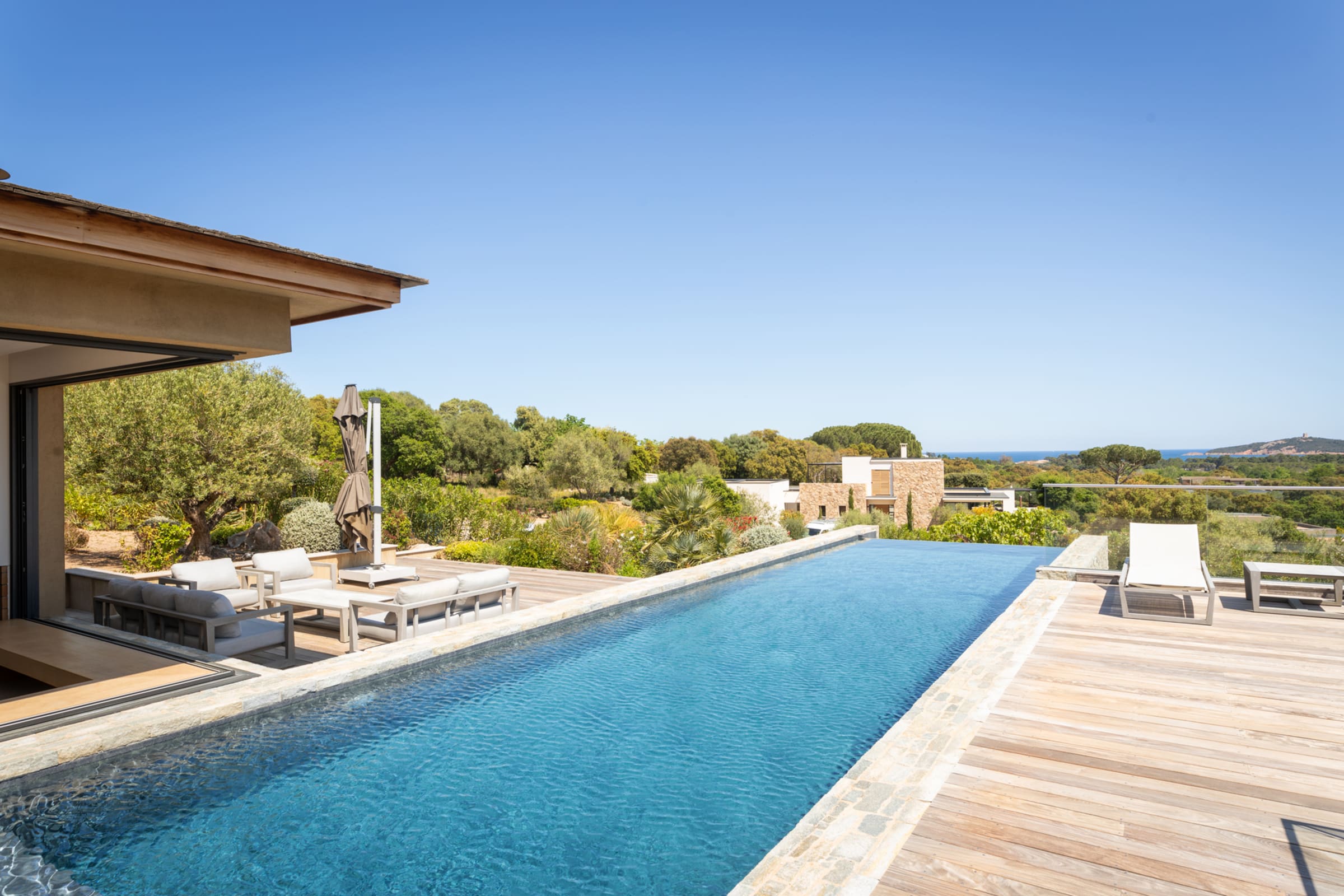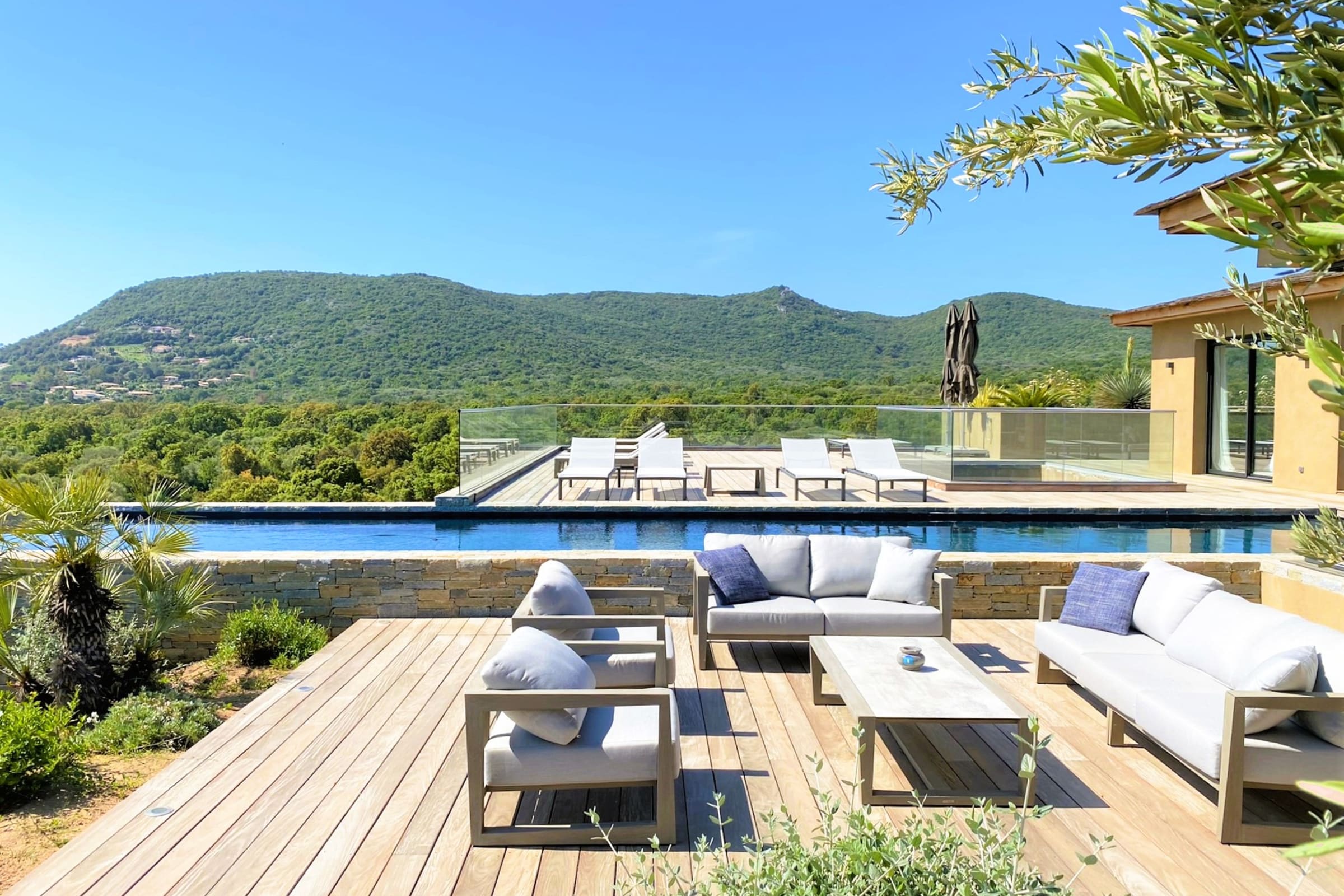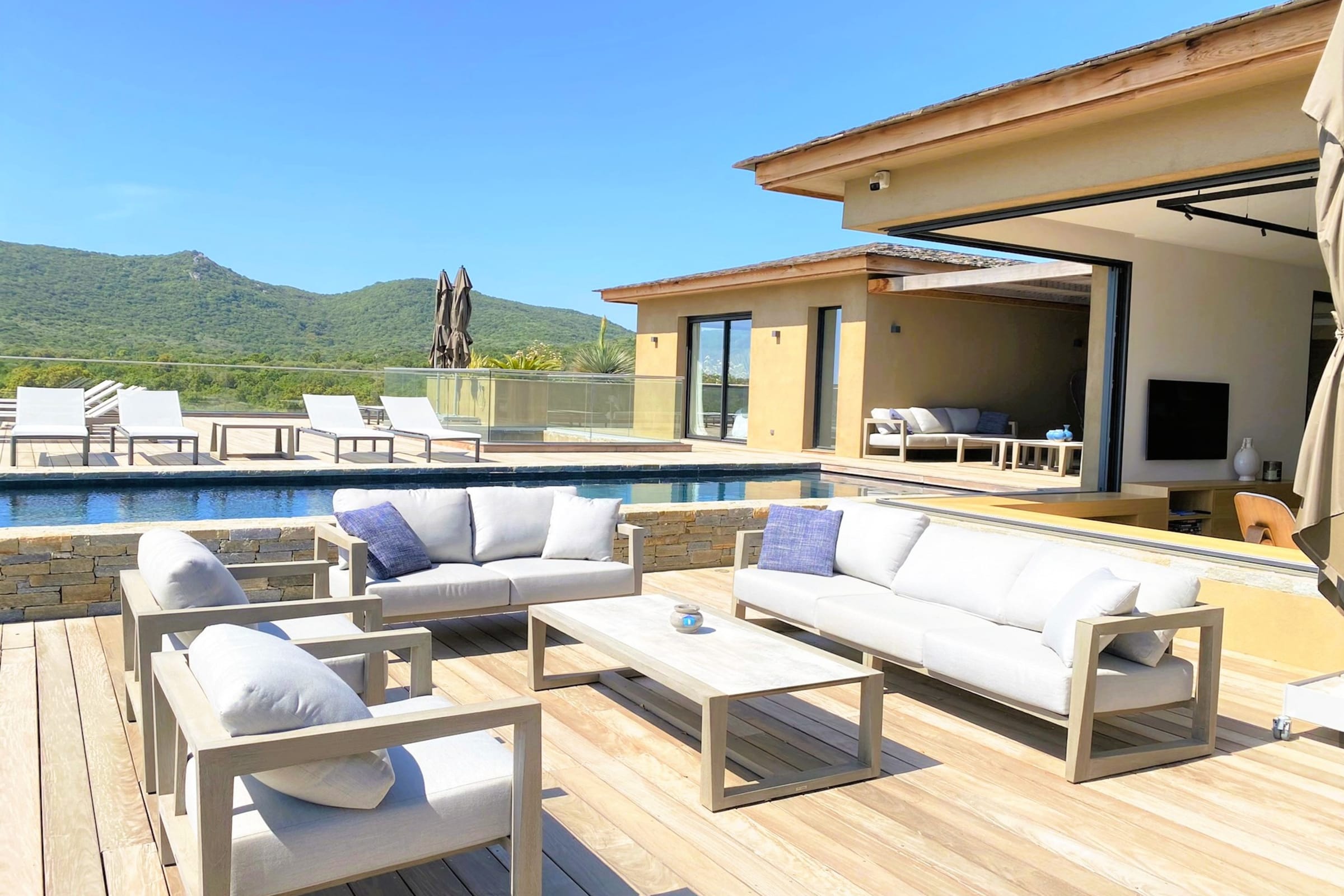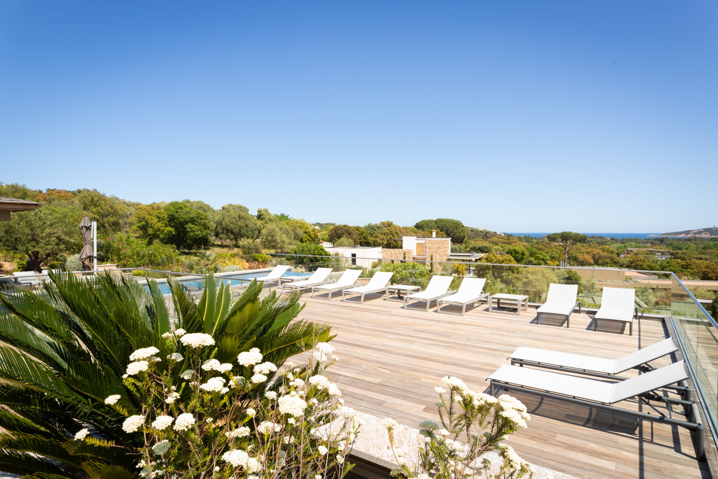 - Grande terrasse en IPE avec superbe vue sur la baie de Pinarellu et sa tour génoise.