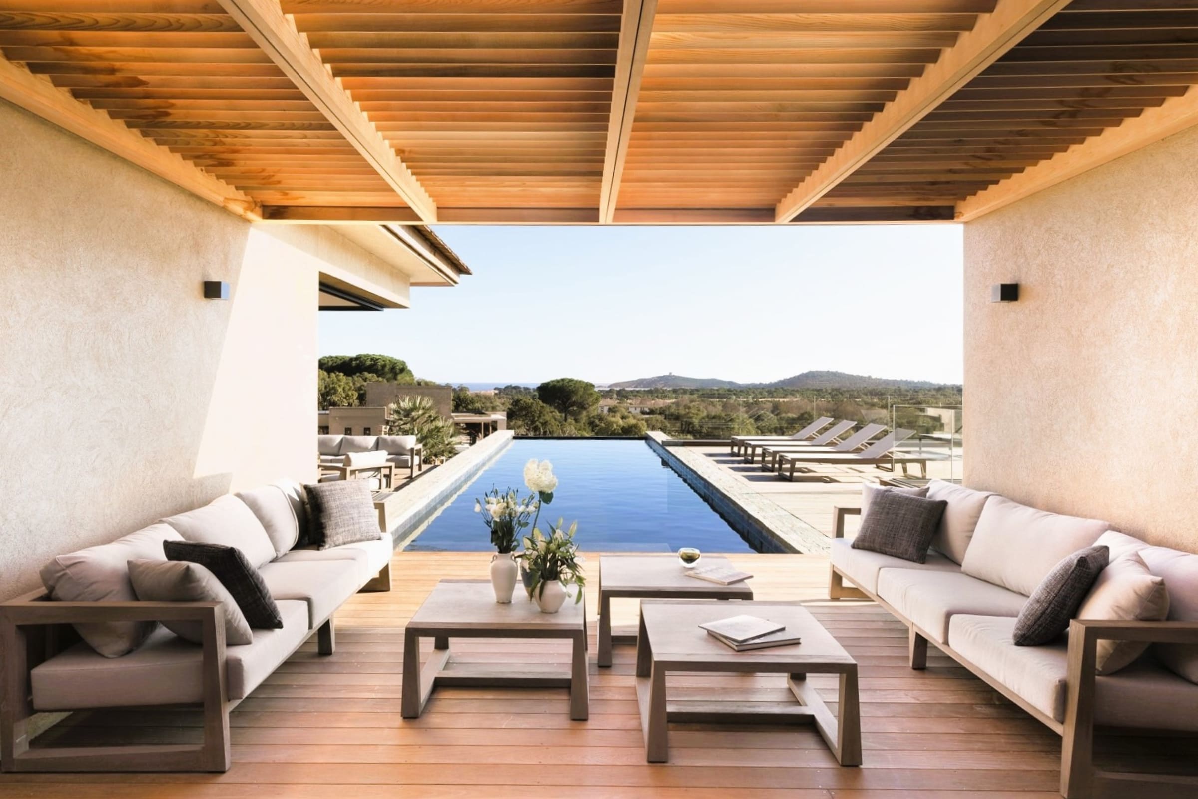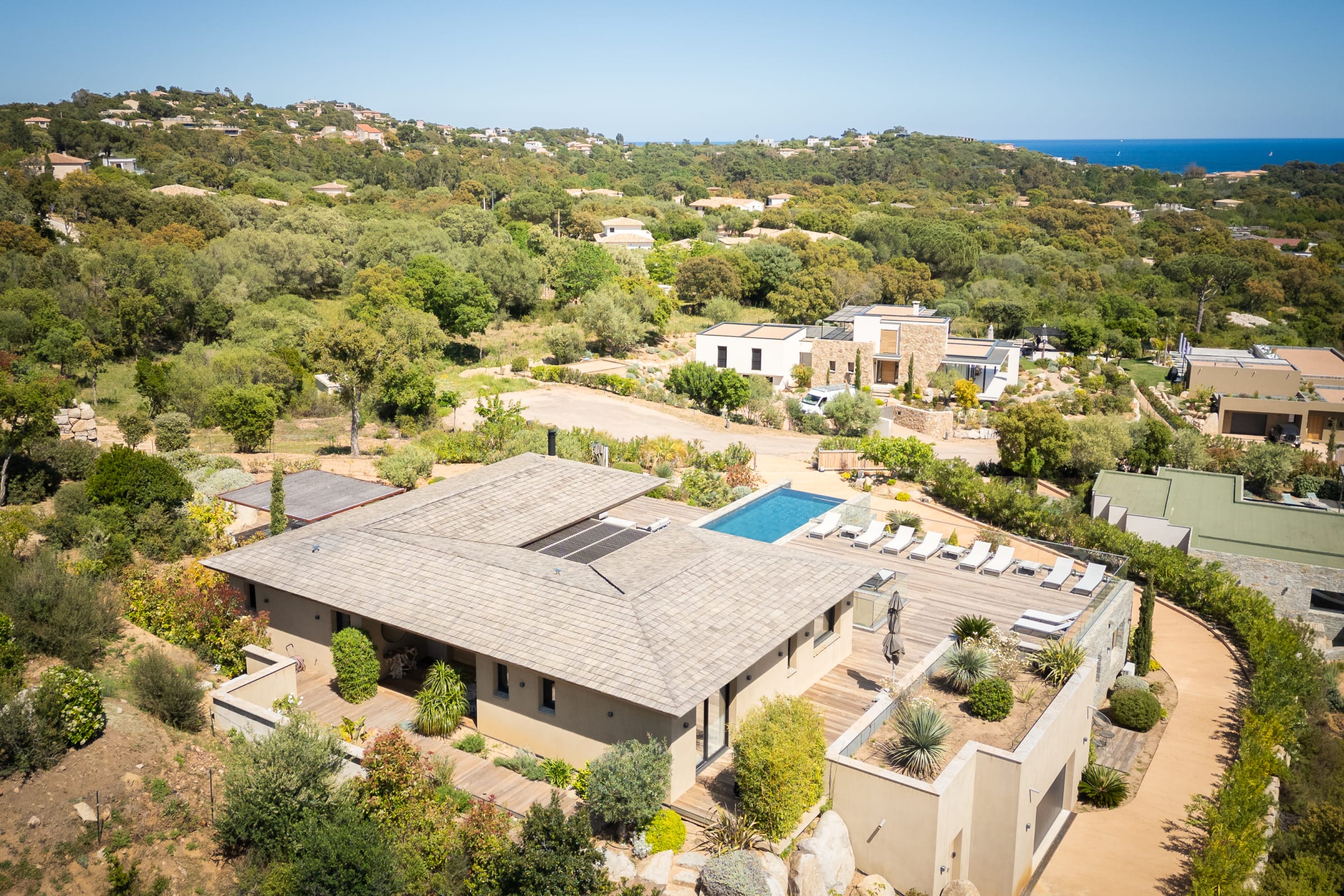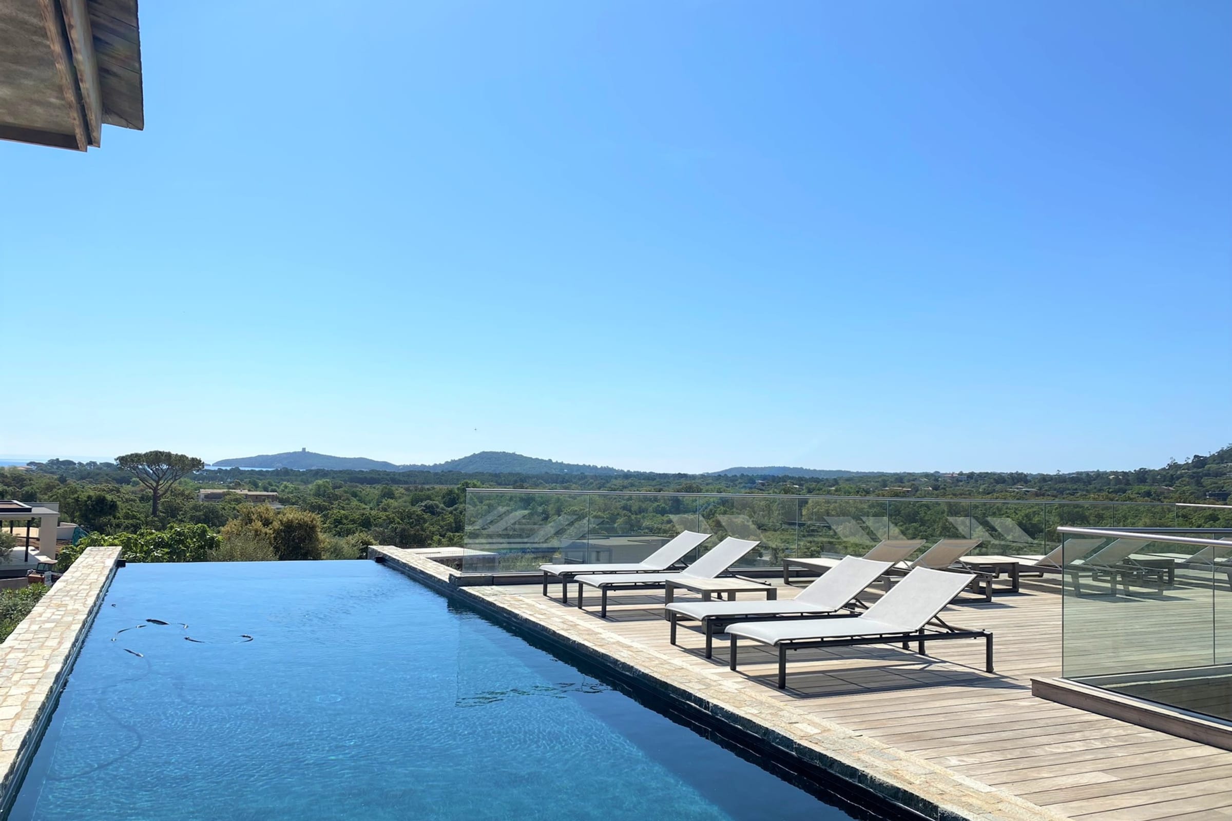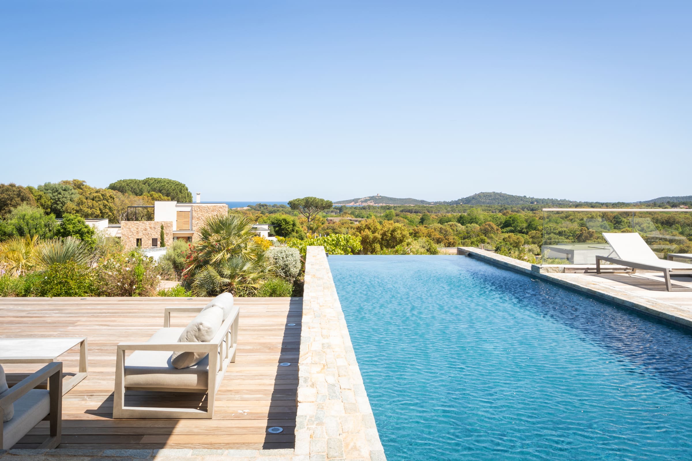 - Grande terrasse en IPE avec superbe vue sur la baie de Pinarellu et sa tour génoise.
