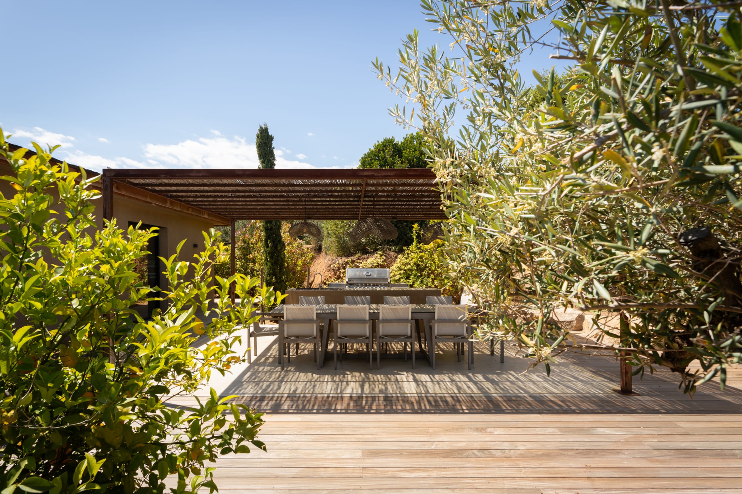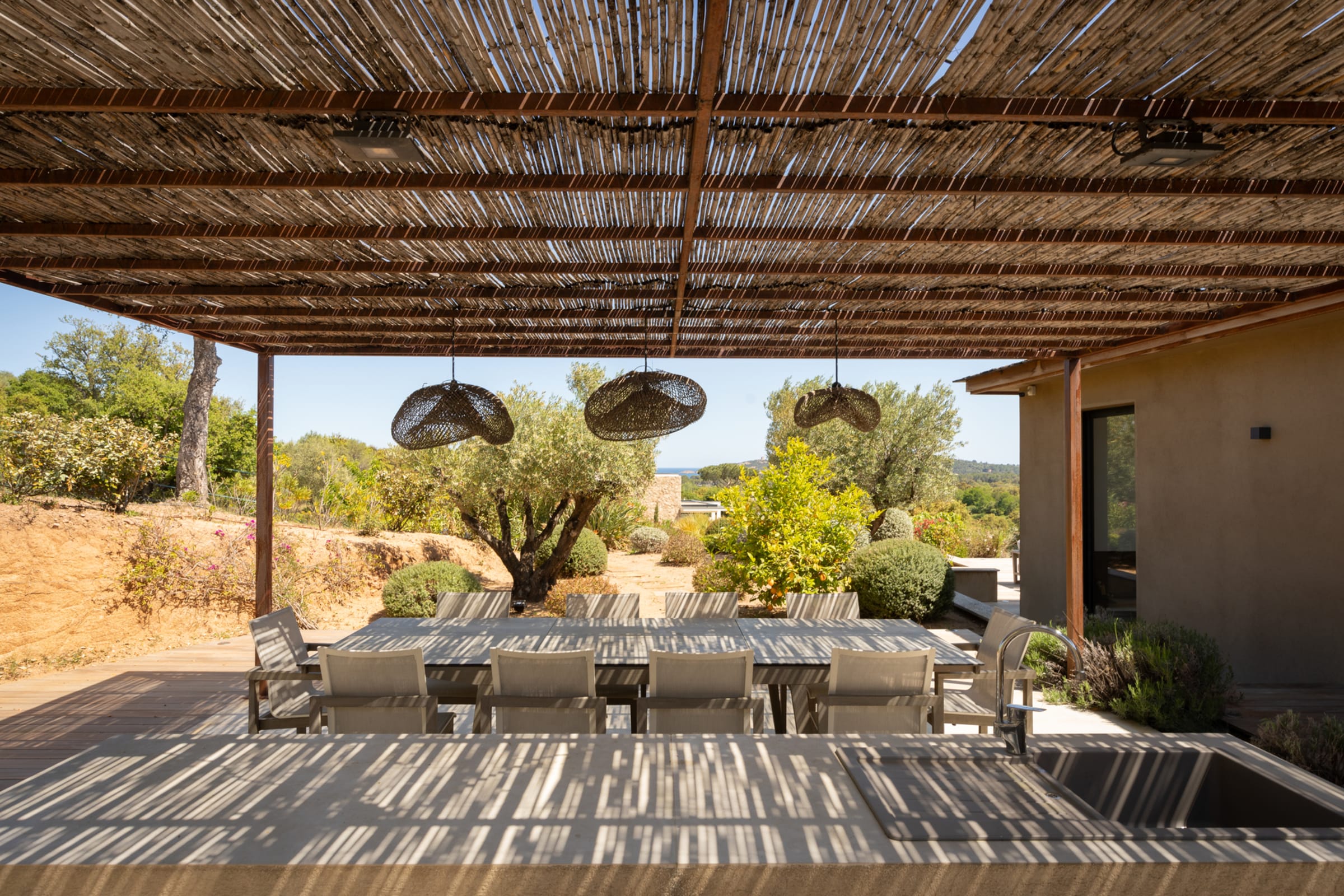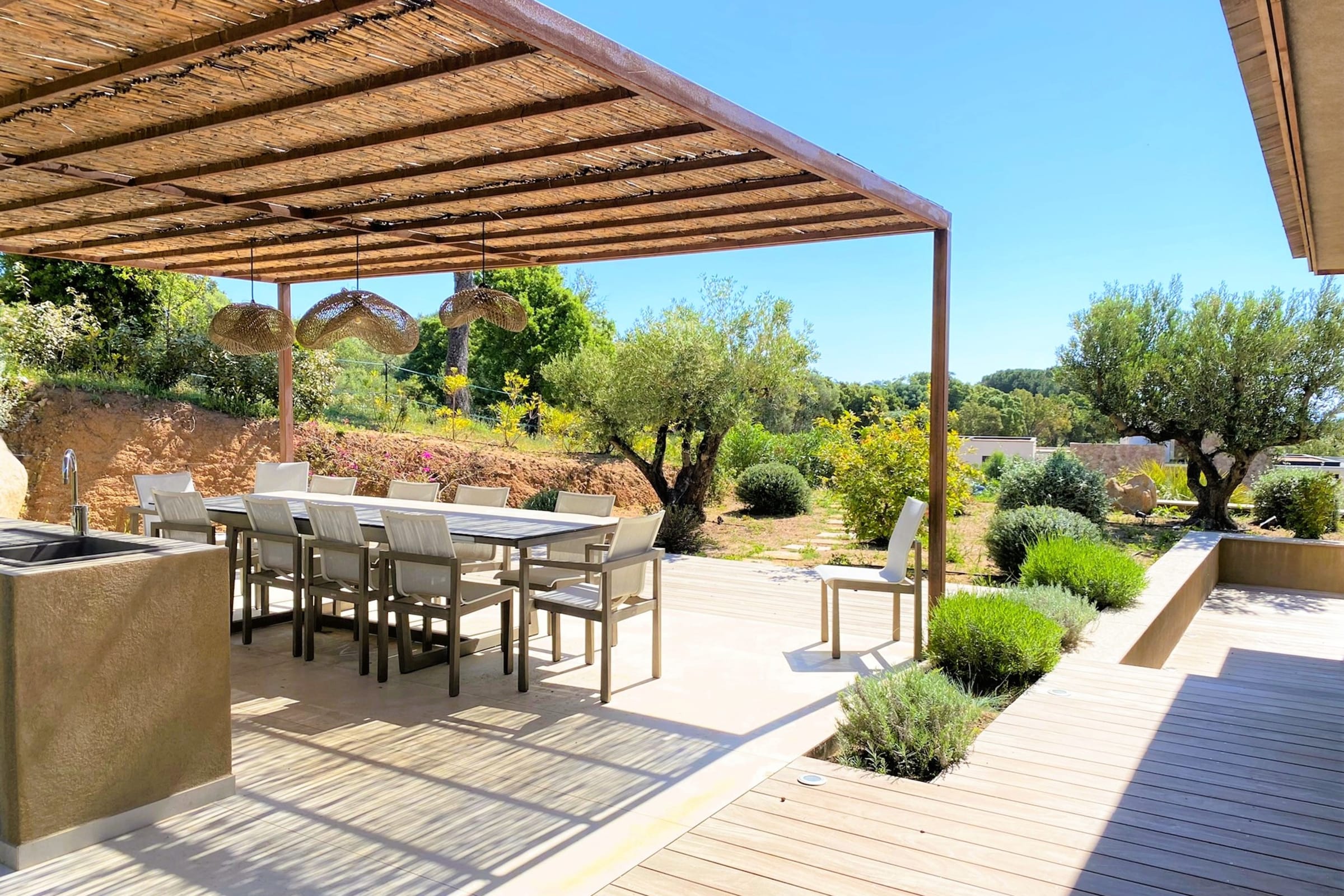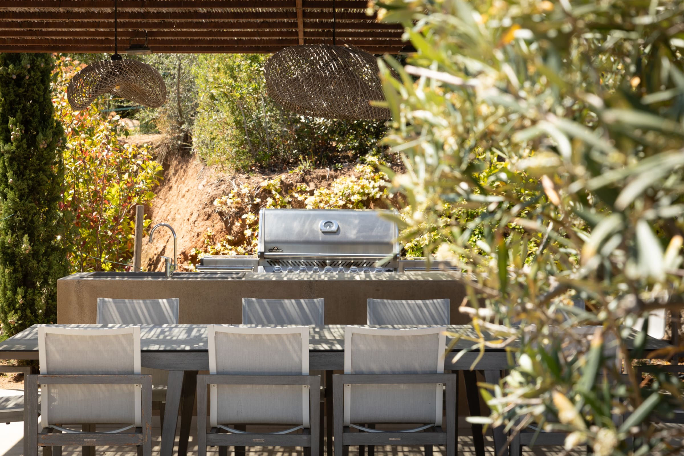 - L’espace repas extérieur, implanté au cœur du jardin vous permettra de déjeuner et dîner au gré de vos envies en contemplant la baie. Il peut recevoir 12 convives, est équipé d’un plan de travail, d’un point d’eau avec évier et d’un barbecue XXL Napoléon.