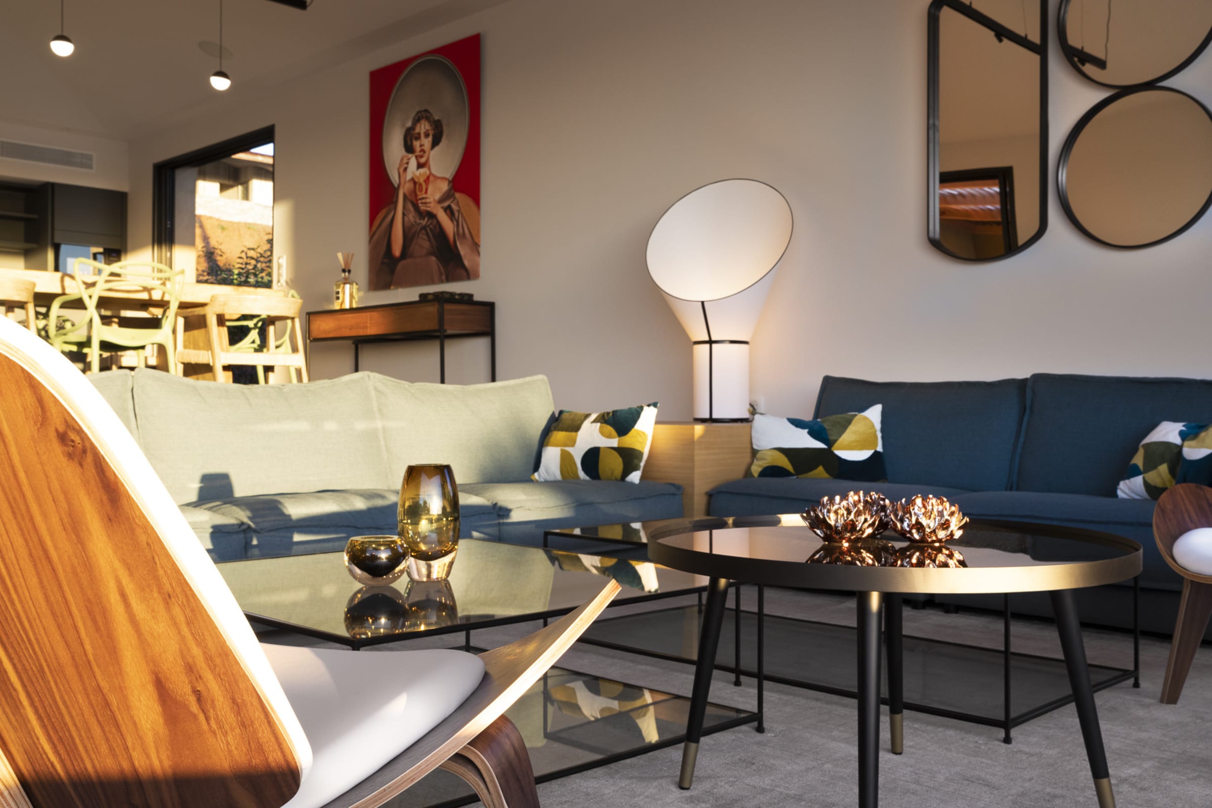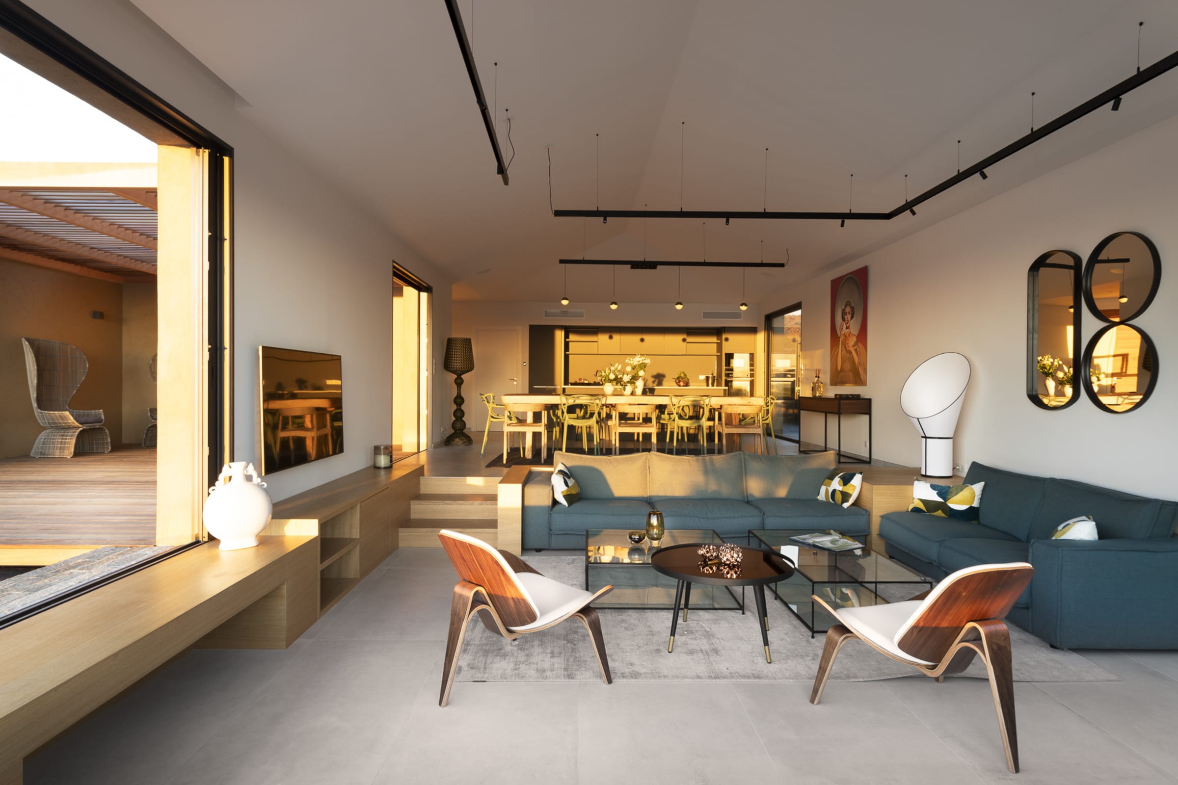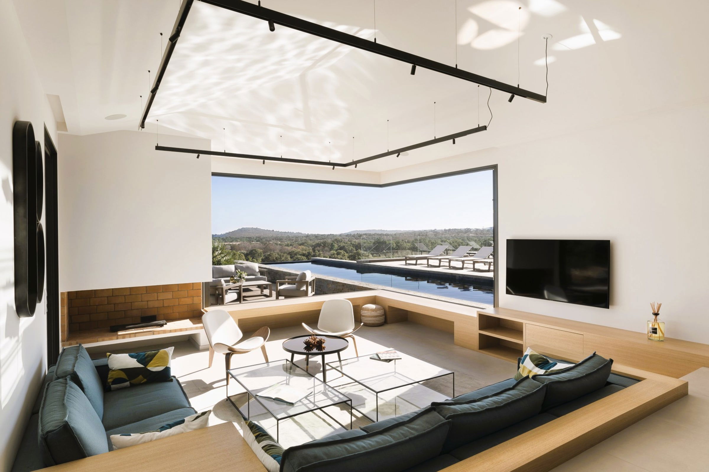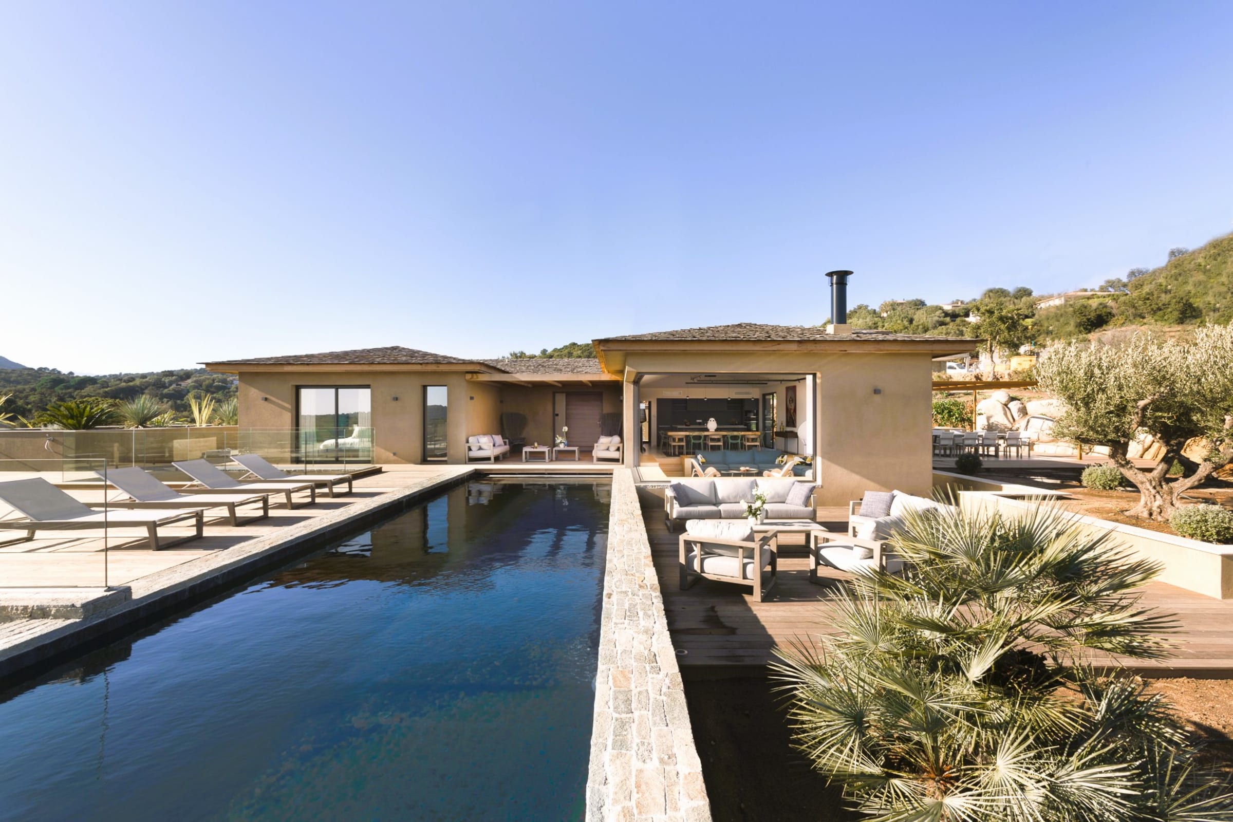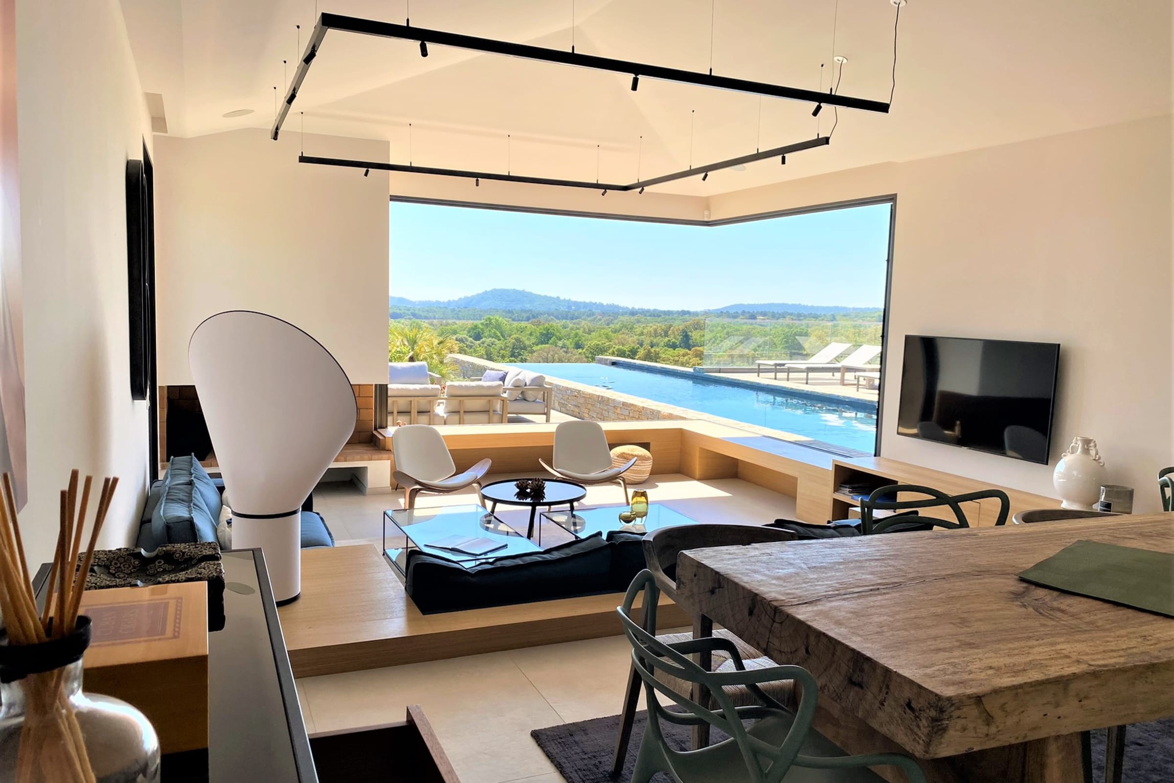 - Salon/salle à manger avec cheminée et baies vitrées d’angle entièrement escamotable donnant sur la terrasse et la piscine – vue mer
