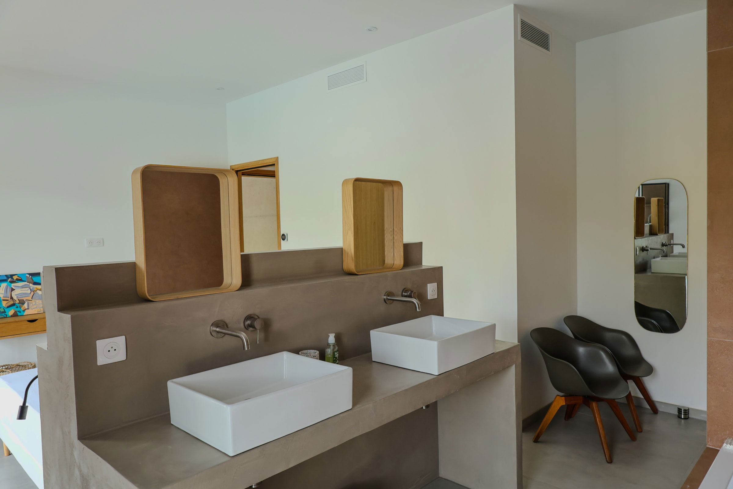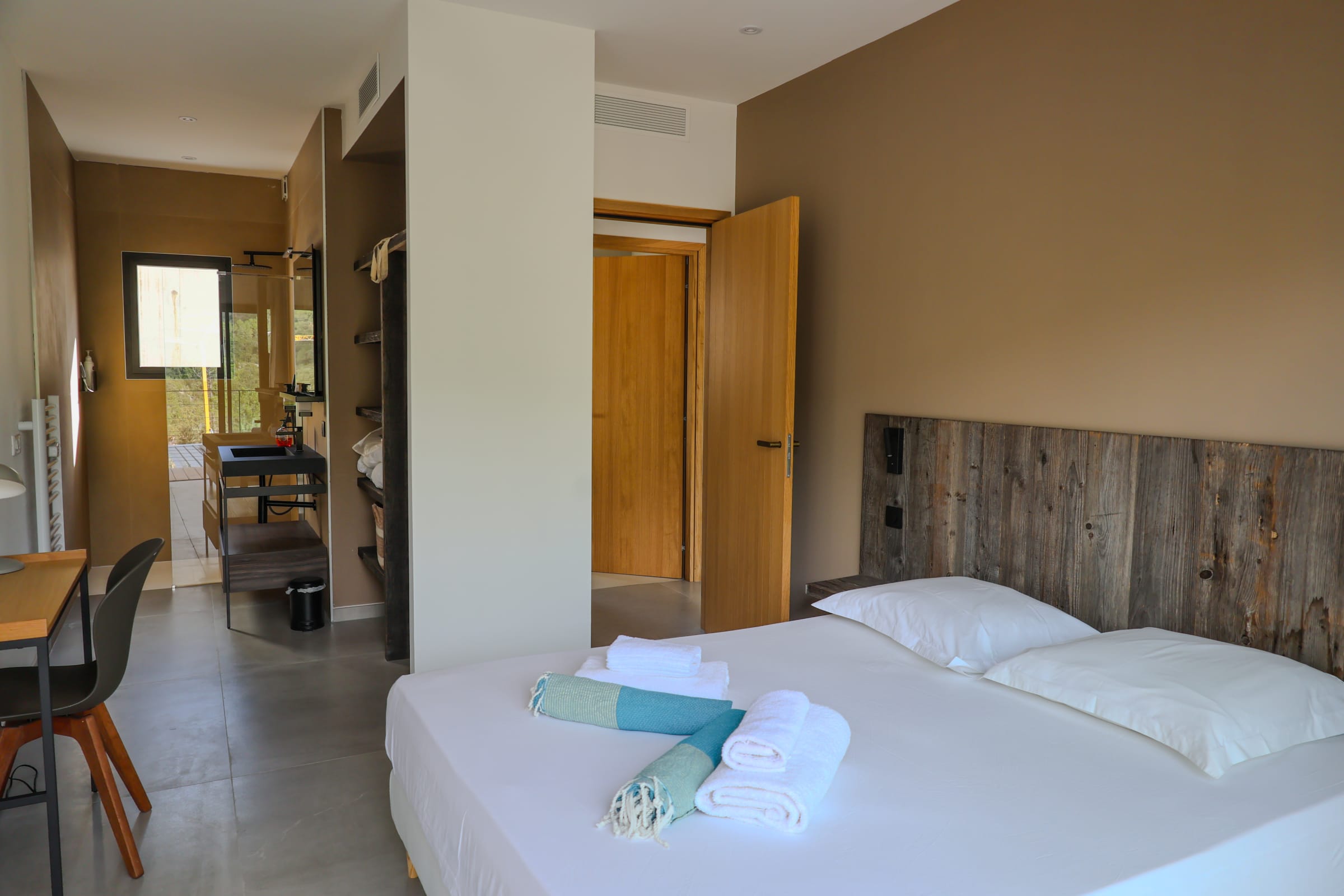 La suite possède un lit 160*200, une salle de douche avec baignoire, double vasque et un toilette. Un accès direct à la terrasse et à la piscine est possible.
