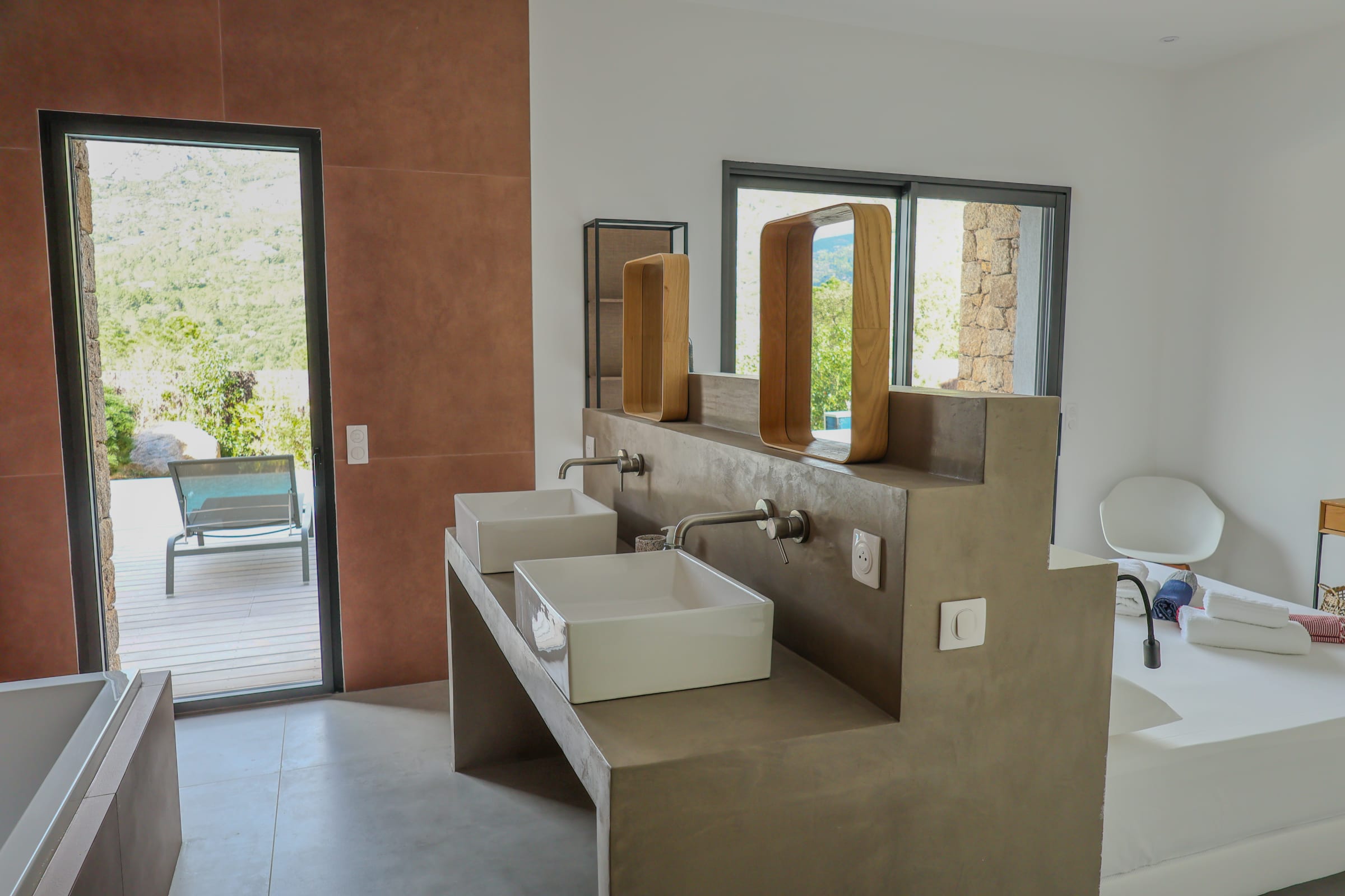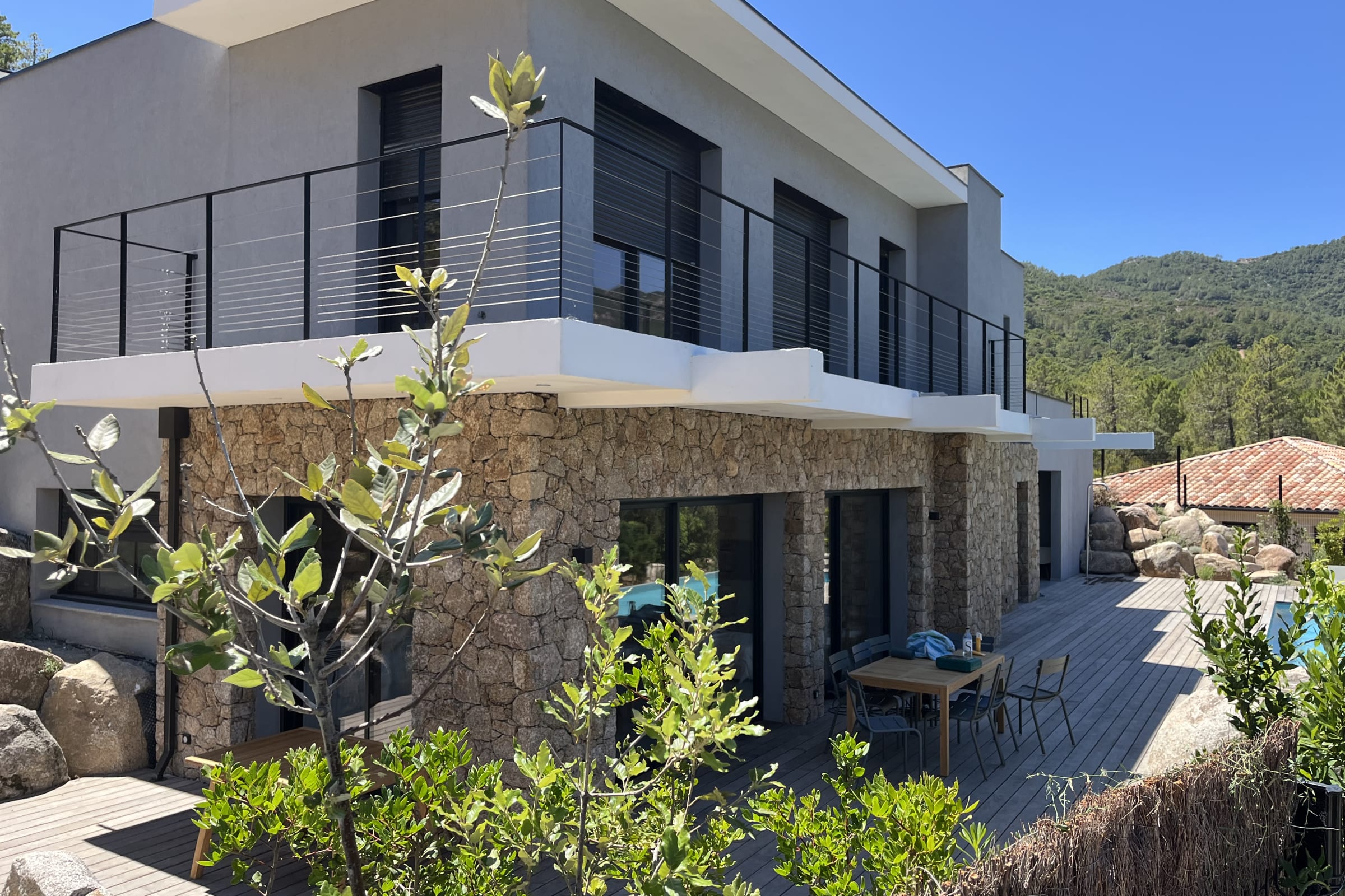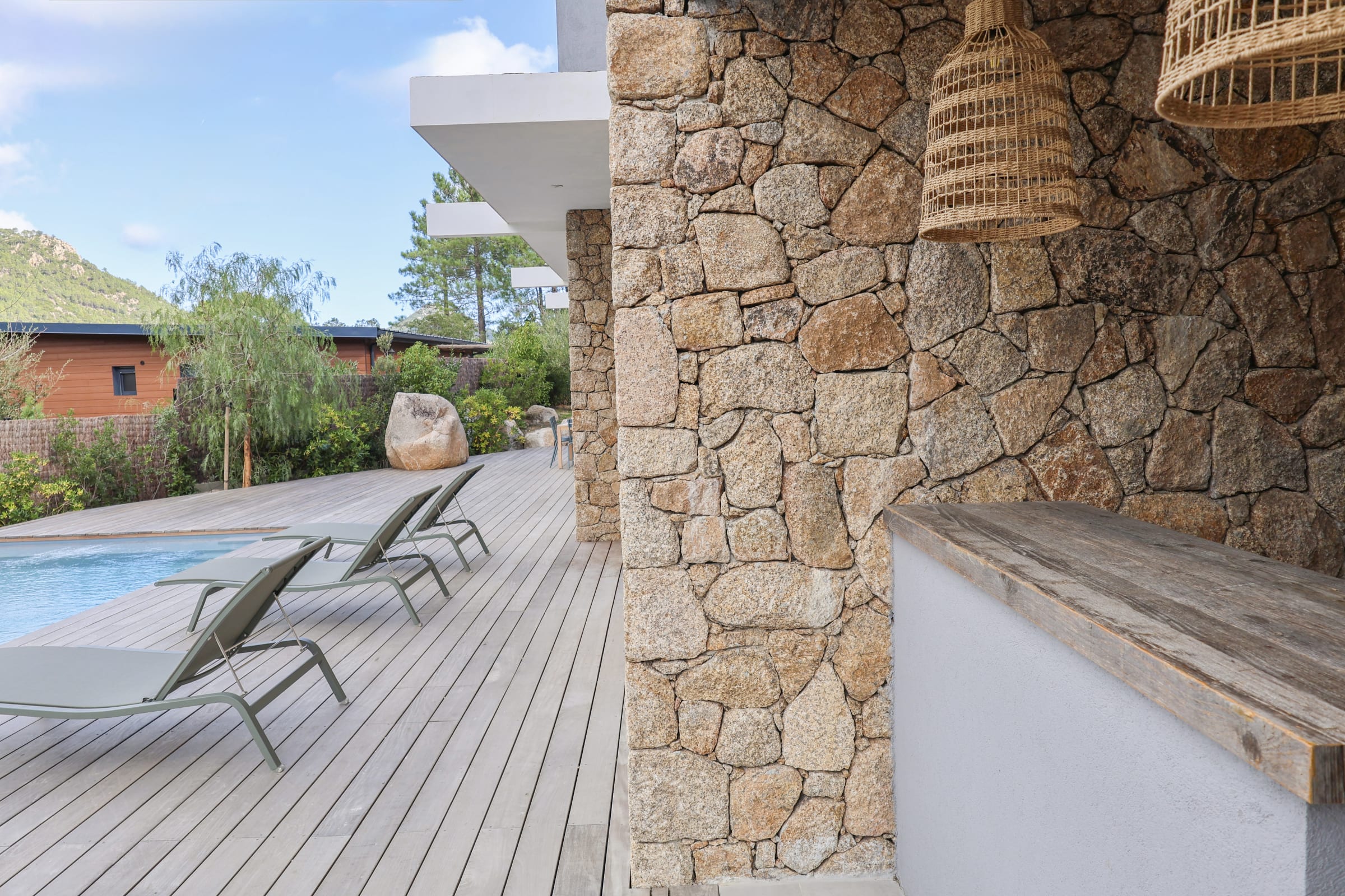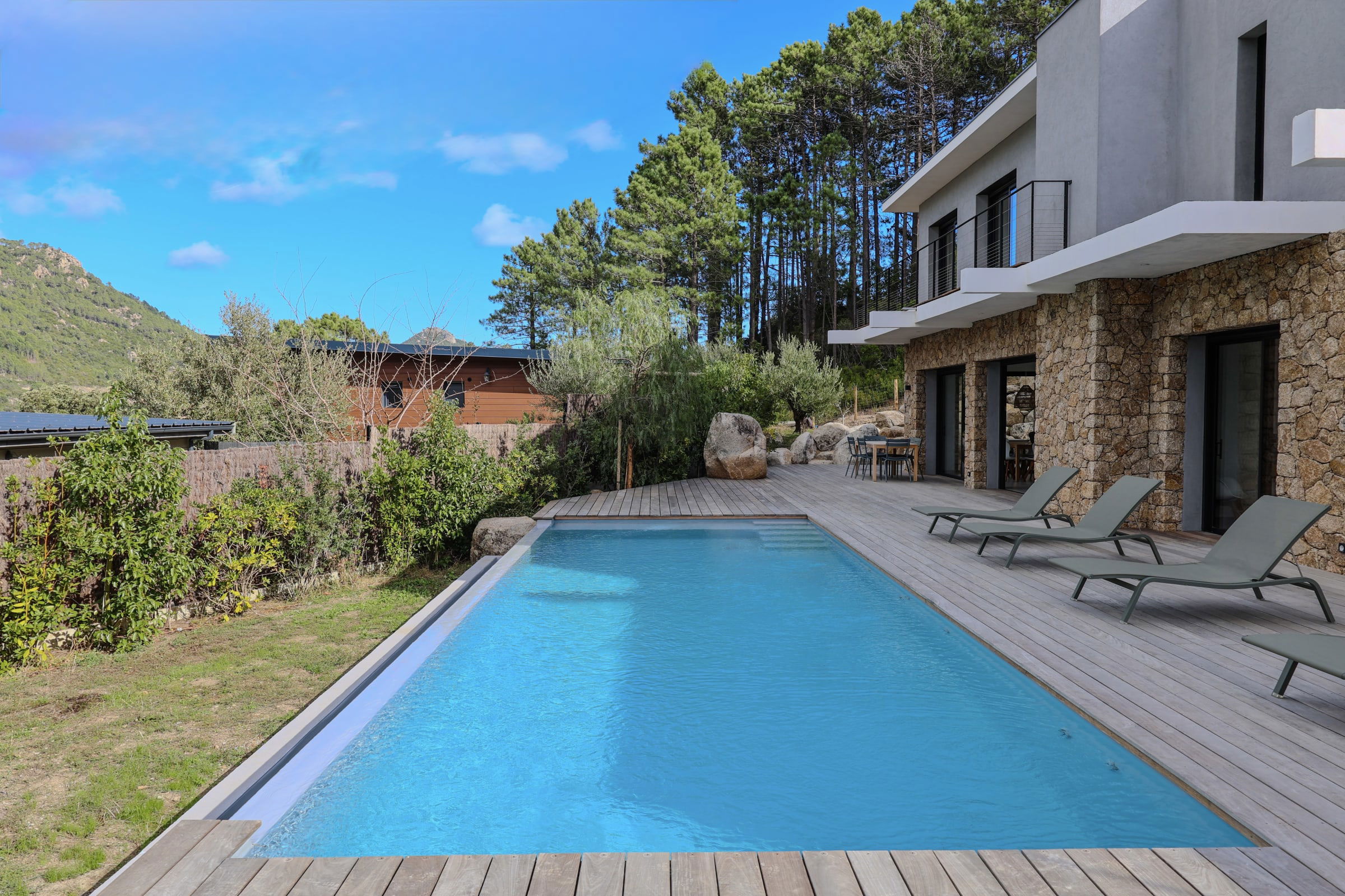 La terrasse offre une belle piscine chauffée et sécurisée avec une alarme, un coin bar et plancha ainsi que 6 bains de soleil, le tout face aux montagnes de la vallée du Cavu et du massif de Bavella.