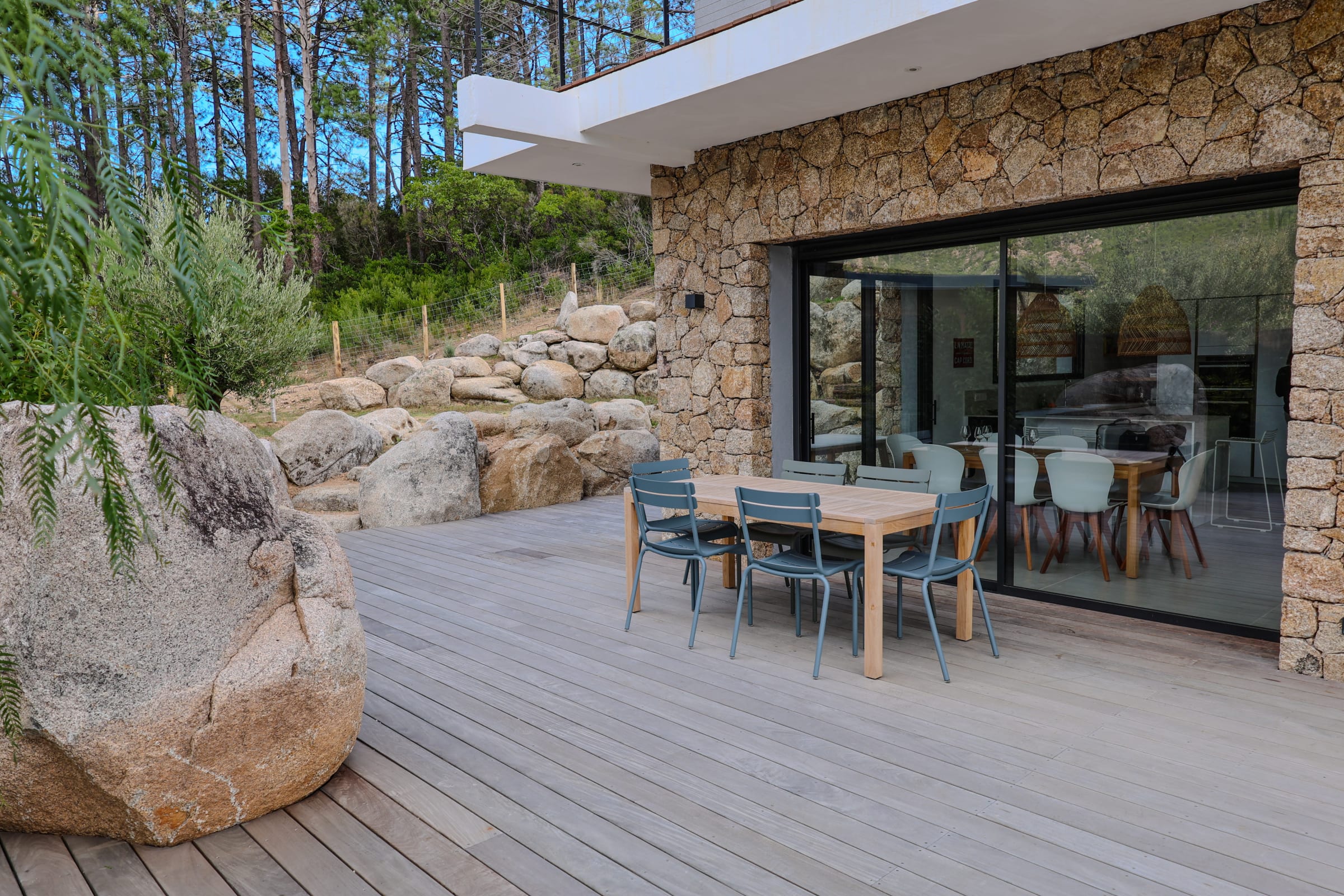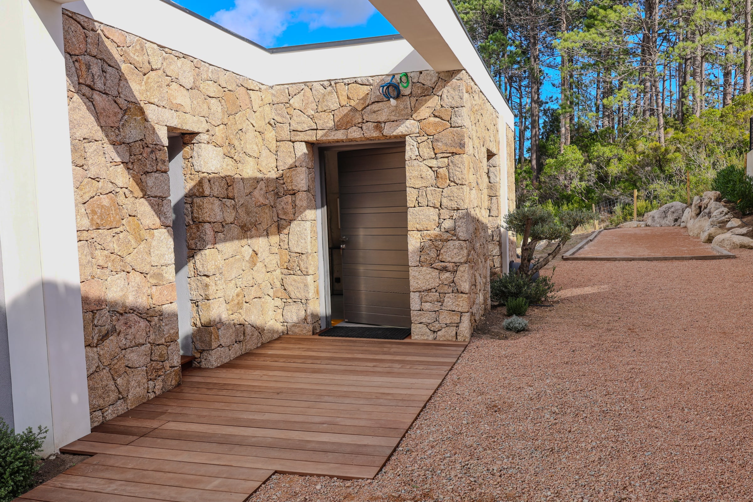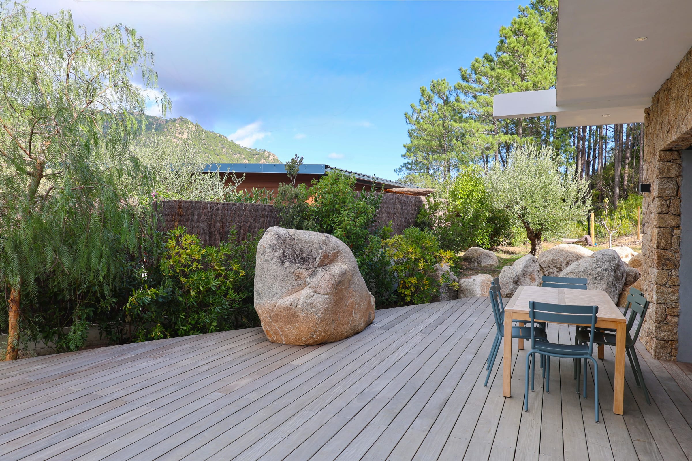 La terrasse et les espaces extérieurs invitent à la détente : 6 bains de soleil, plancha, terrain de pétanque, repas en plein air ou soirées sous les étoiles… tout y est pour savourer l’art de vivre insulaire.