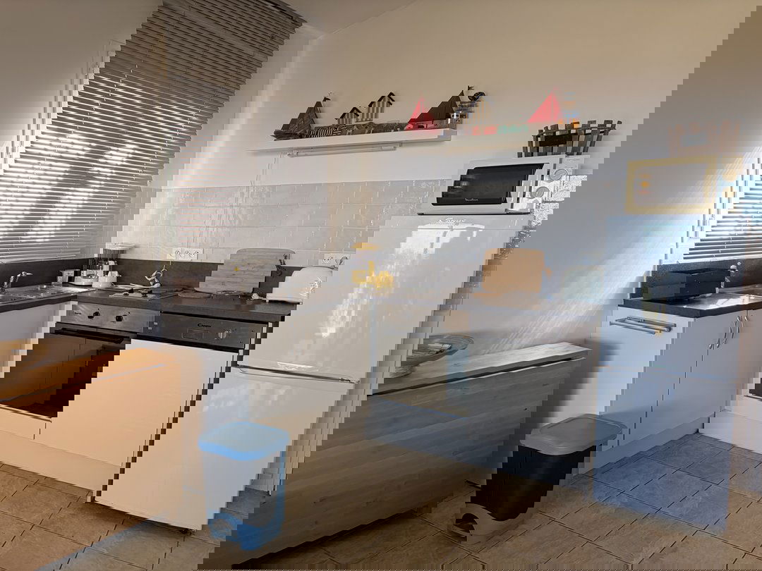- Entrée sur séjour aménagé : canapé convertible, TV (TNT), cuisine ouverte entièrement équipée : combiné frigo-congélateur, plaque électrique 2 feux, four électrique, lave-vaisselle, cafetière filtre, four micro-onde, grille-pain..