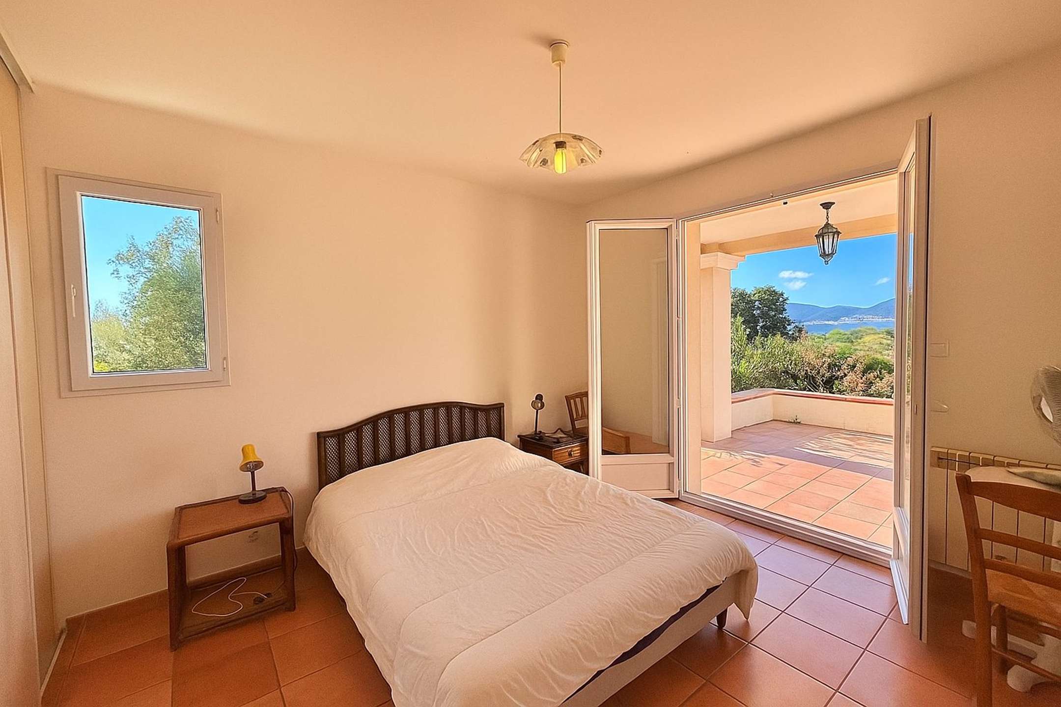 La villa dispose de 5 couchages, elle est composée d'un vaste séjour avec cuisine équipée indépendante, un espace cellier avec lave-vaisselle, une salle à manger, une suite parentale avec salle d'eau et WC, le tout donnant sur la terrasse avec une magnifique vue dégagée donnant sur le jardin et la ville d'Ajaccio. A l'étage supérieur deux chambres donnant sur une terrasse vue mer et sur le jardin : une chambre avec 2 lits simples et une chambre avec 1 lit simple. Une salle d'eau et un wc complètent l'étage.