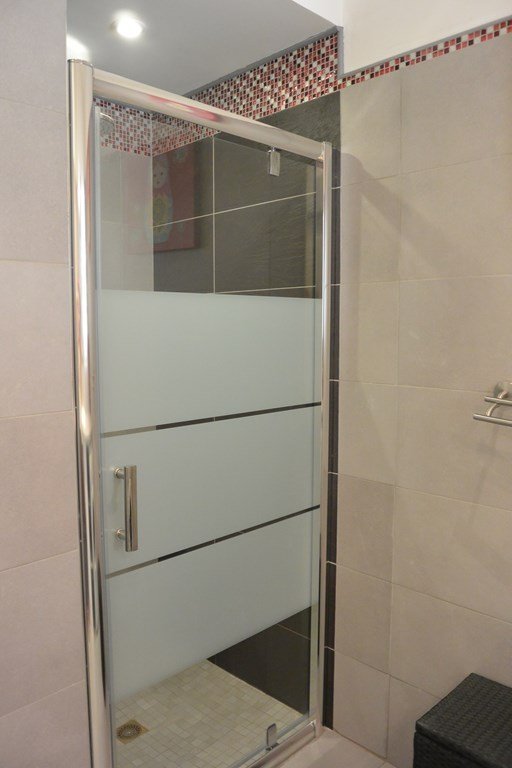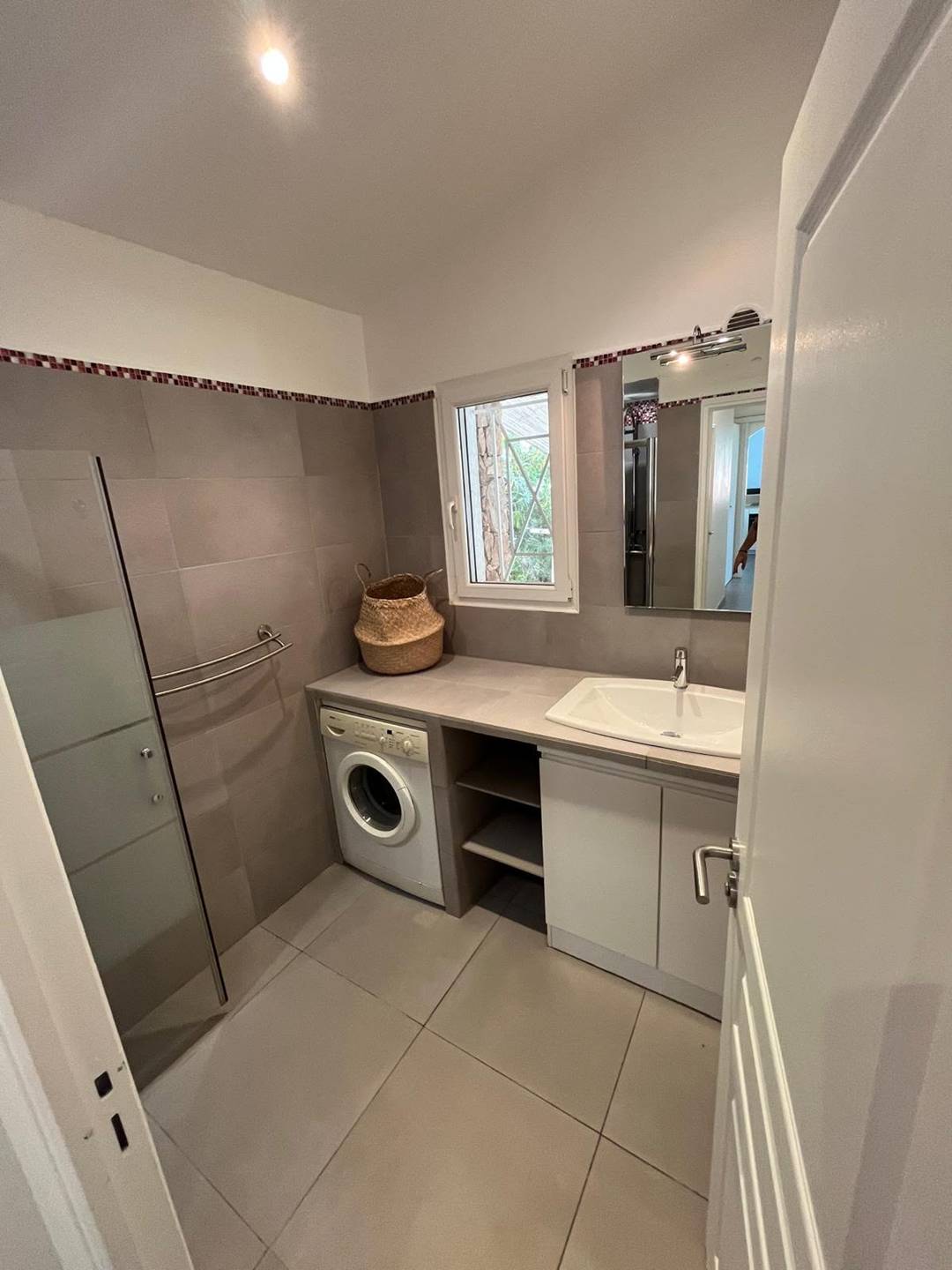 Salle d'eau : douche, lavabo, lave-linge.