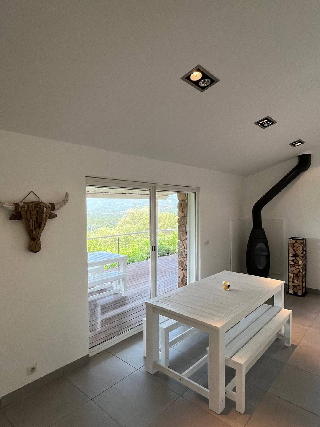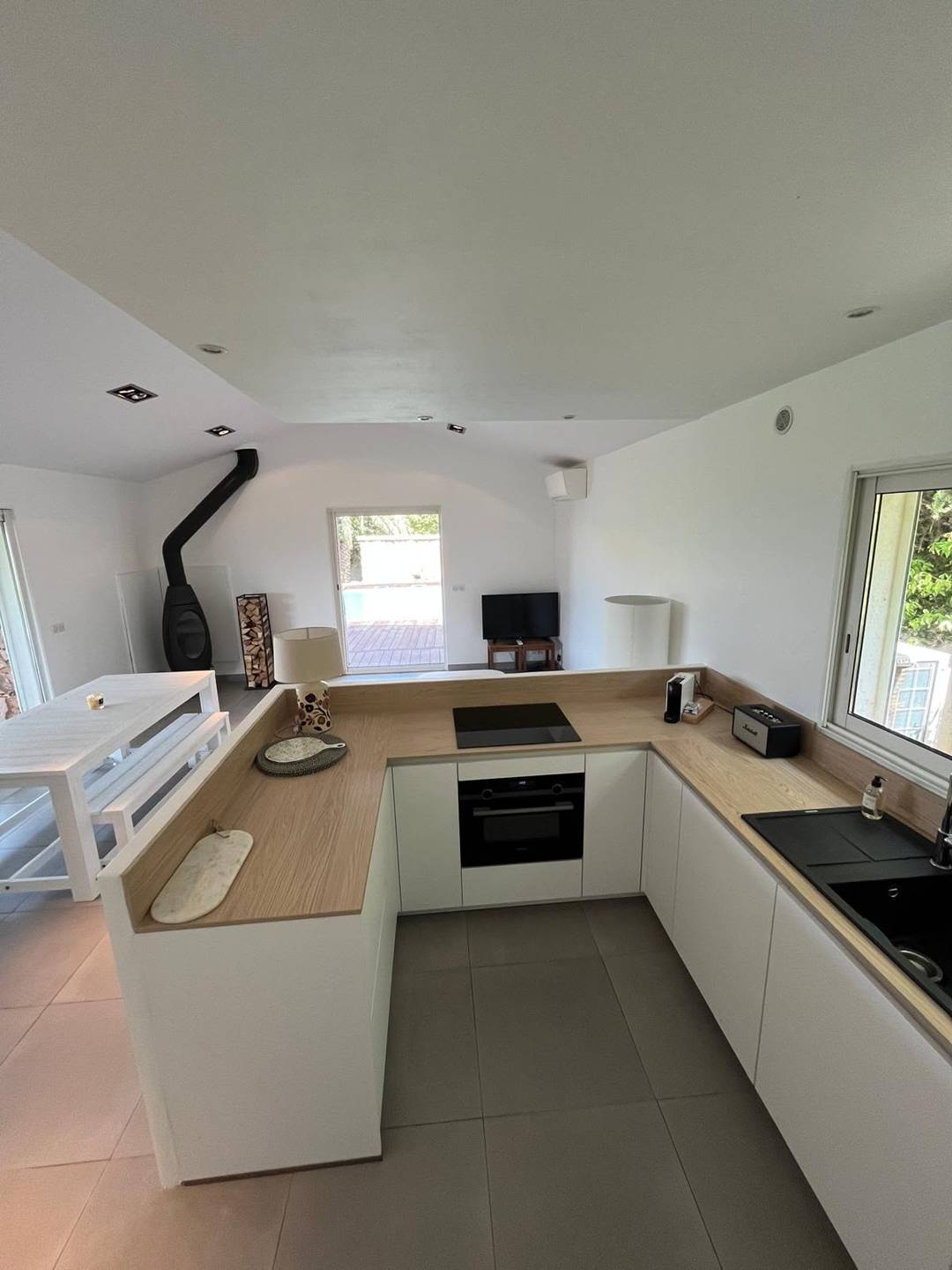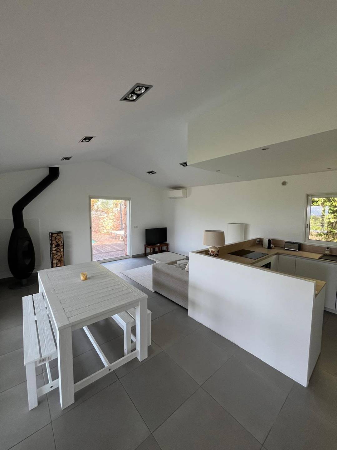 Séjour - salon - cuisine américaine : baies vitrées - accès terrasse face à la vallée et ses vignobles - accès autre terrasse et piscine - climatisation réversible (chauf/froid) : canapé, télévision (française, TNT), .... réfrigérateur, plaque de cuisson (vitrocéramique), four (électrique) + micro-onde, hotte aspirante, lave-vaisselle, cafetière, .... aspirateur, table et fer à repasser.