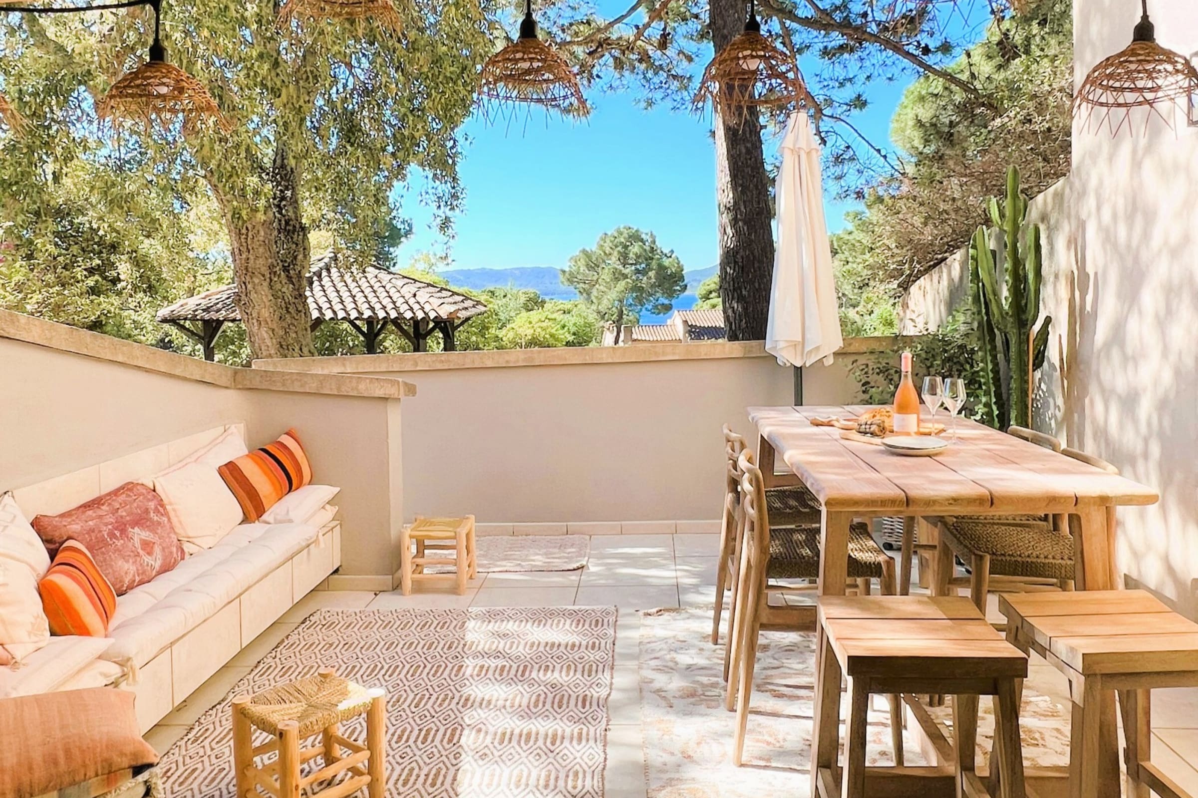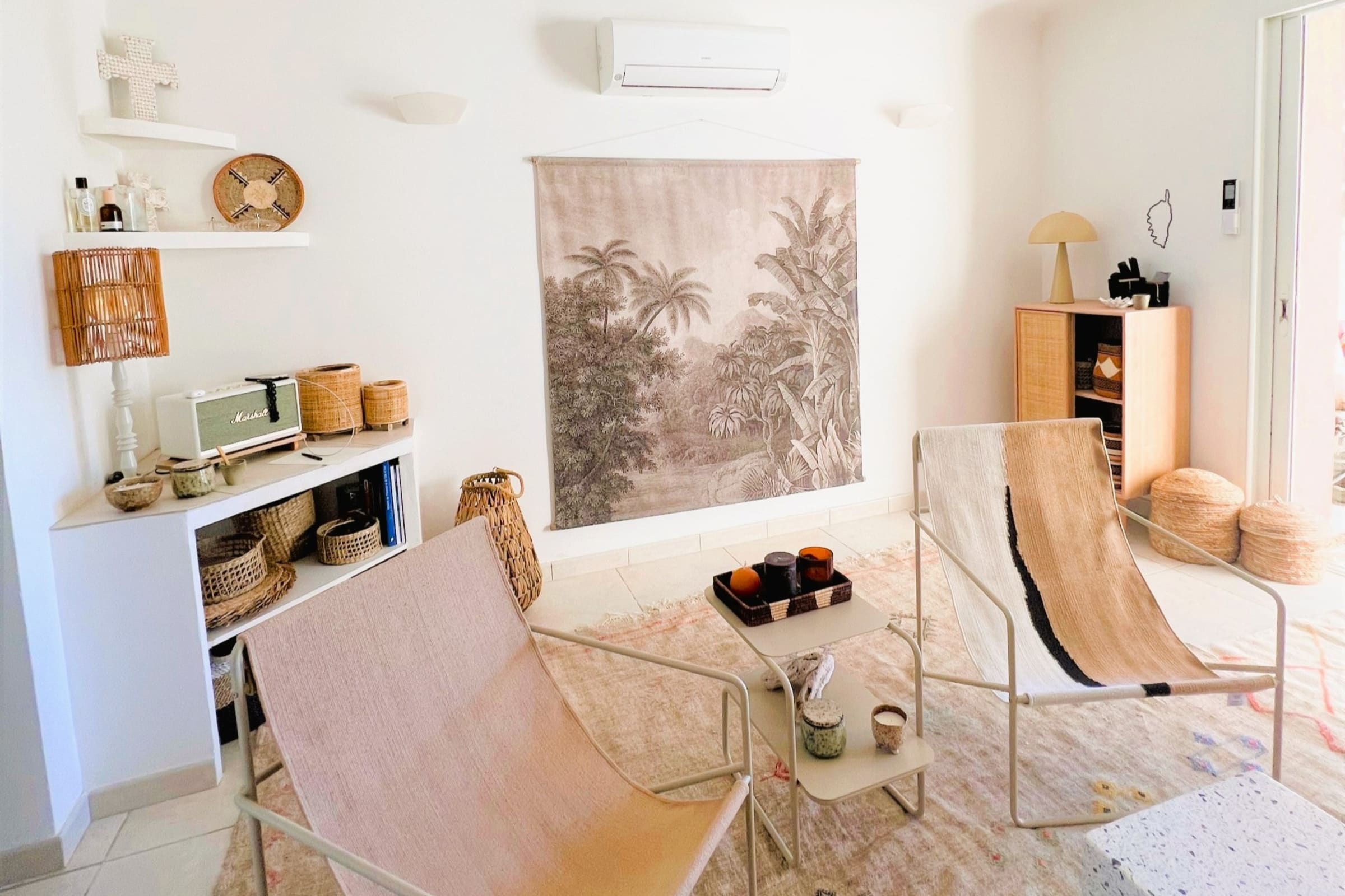 Le salon séjour donne accès à une terrasse arrière aménagée, équipée d’une plancha et d’un espace repas extérieur, idéale pour profiter des déjeuners à l’ombre durant les chaudes journées d’été.
