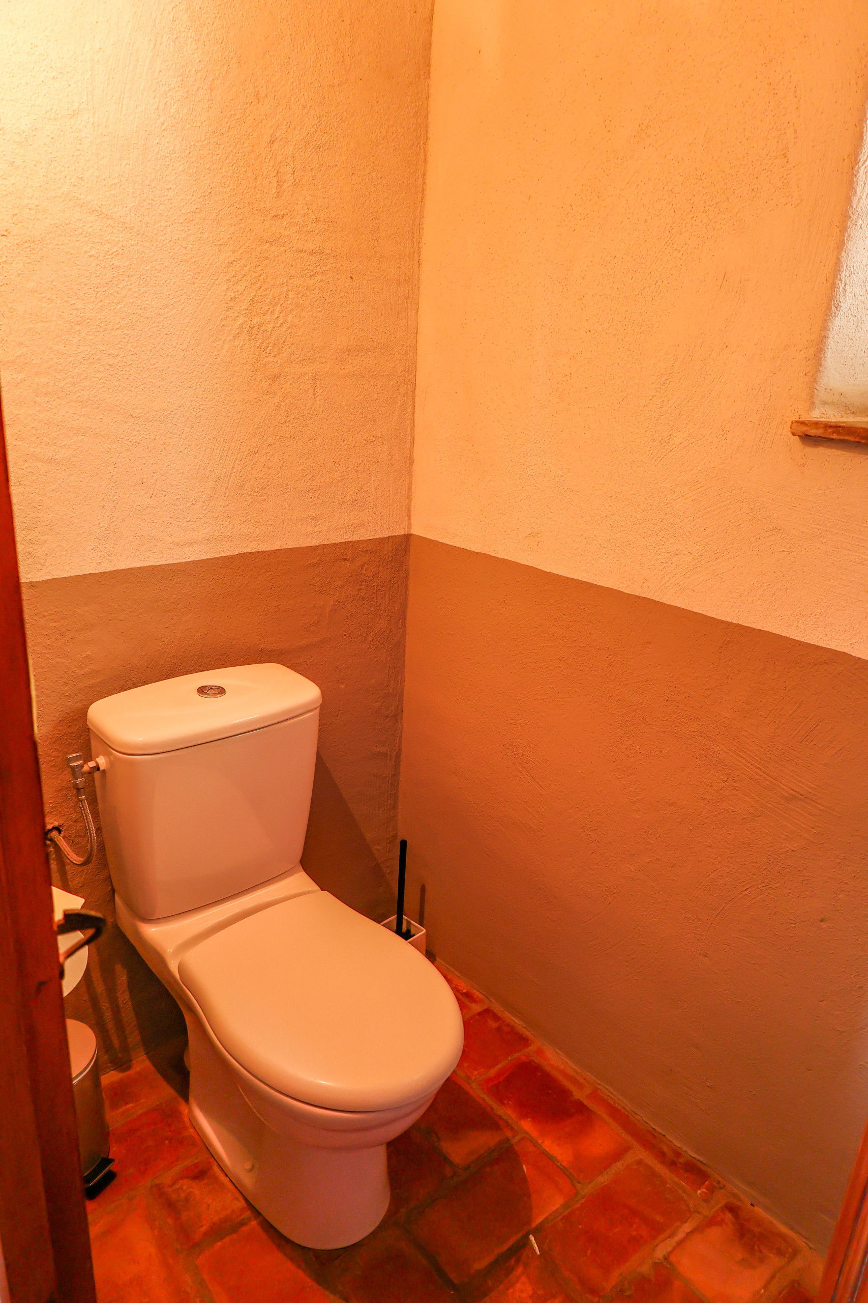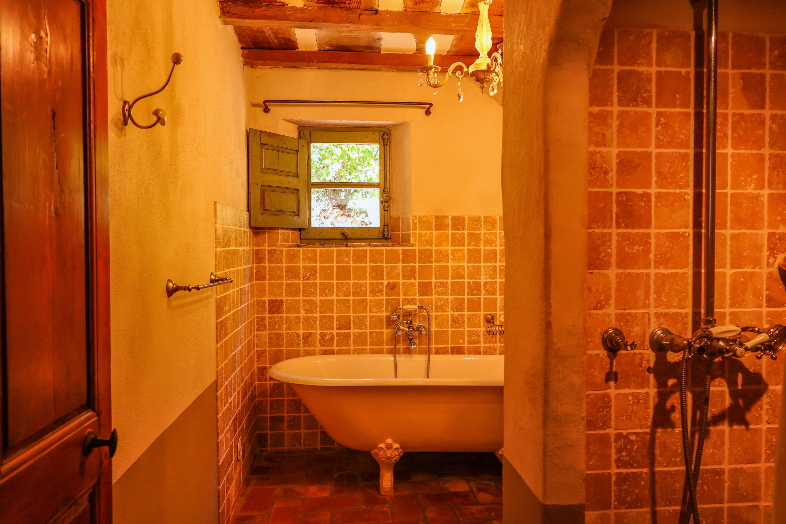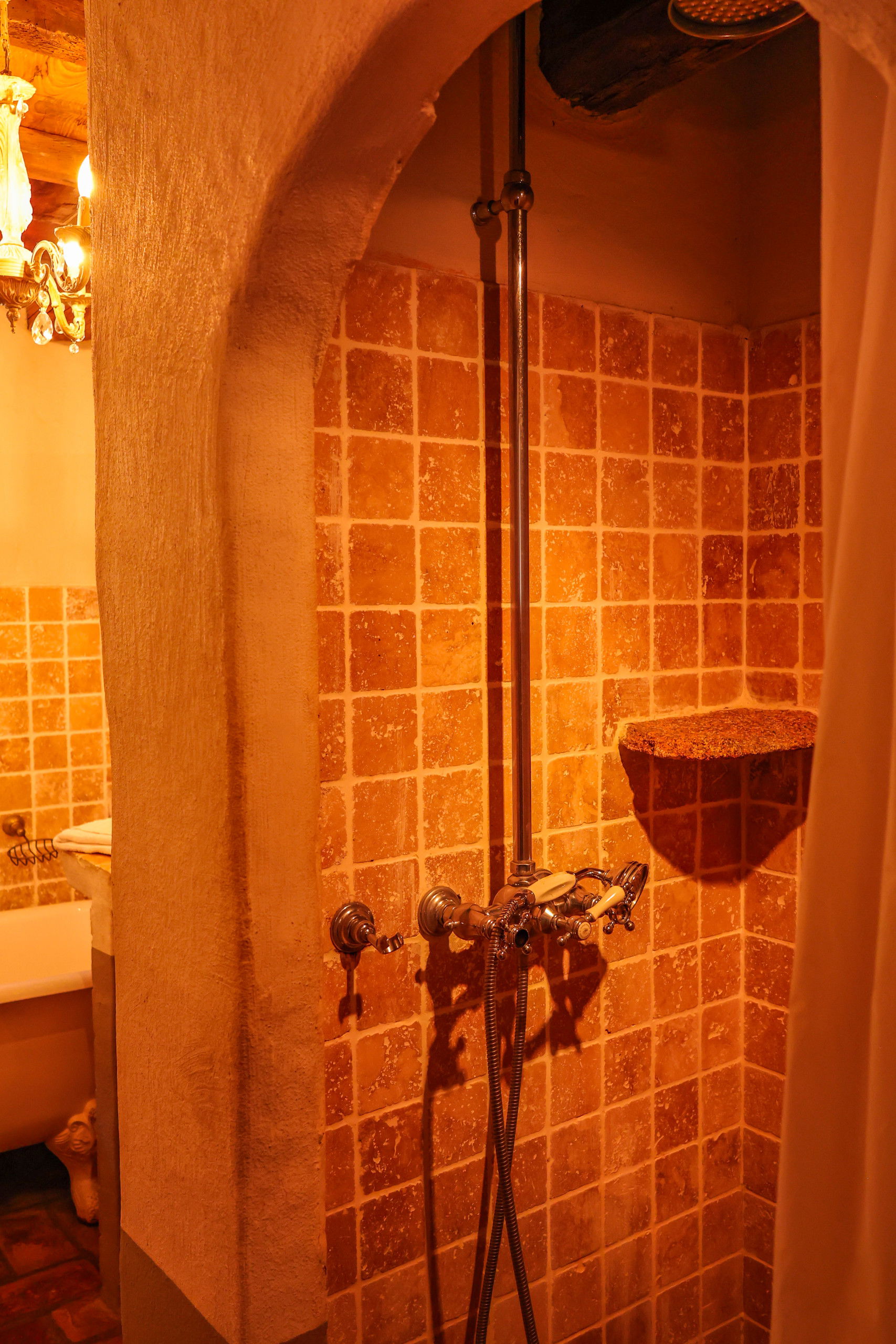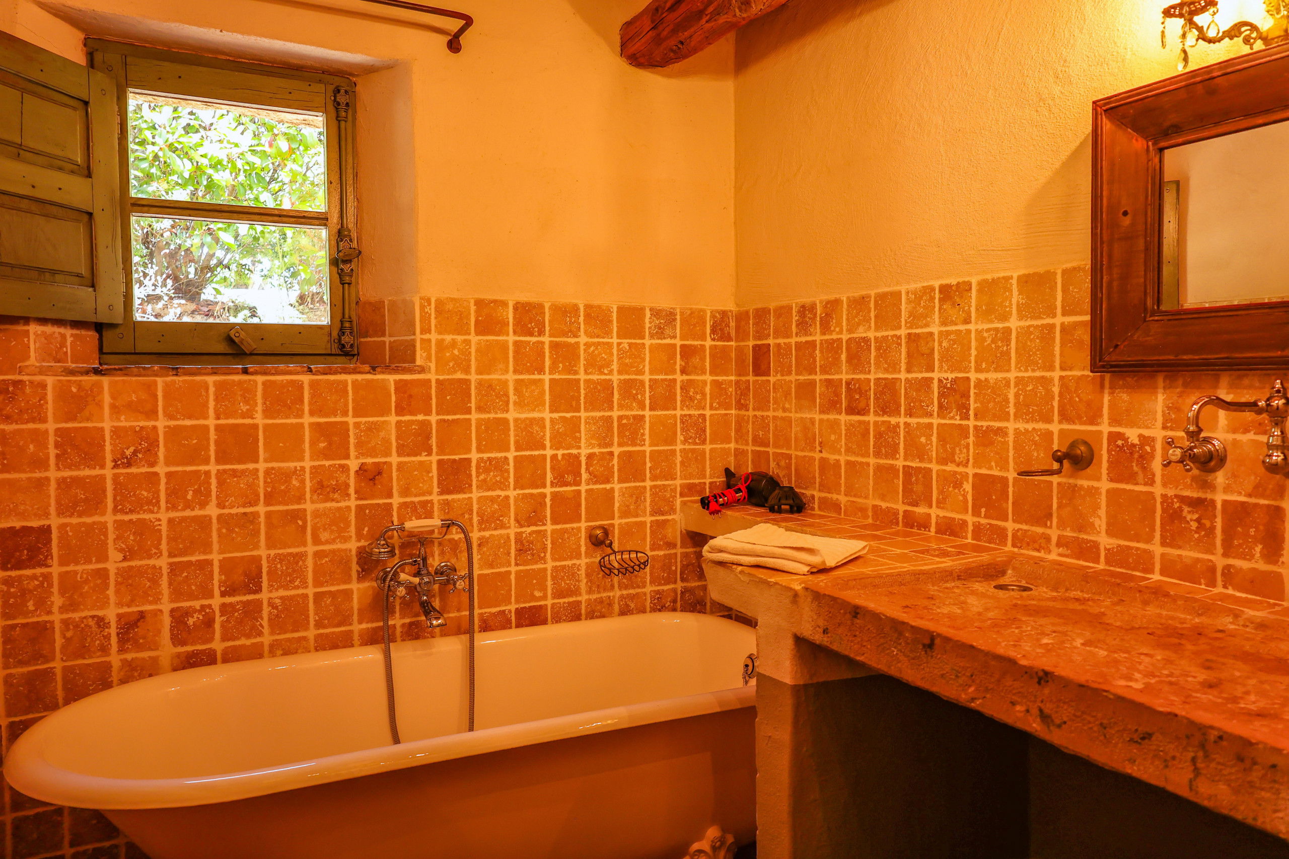 - Une salle de bain avec baignoire et douche à l'Italienne et sèche-cheveux.