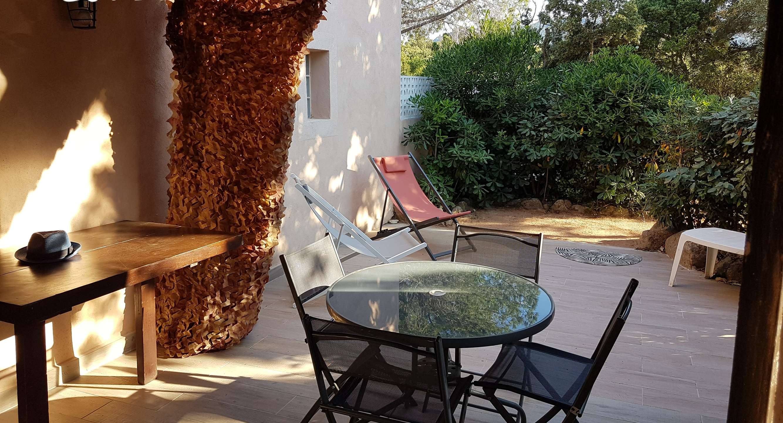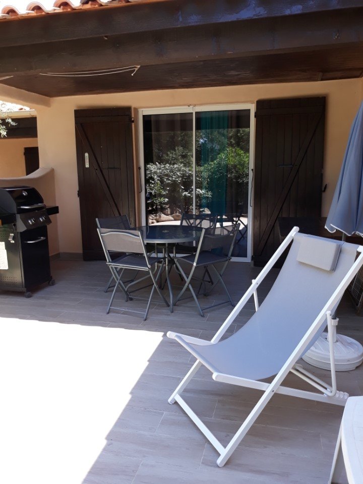 Le plus de cette villa : Une terrasse couverte cachée par une haie avec mobilier de jardin équipée d'un barbecue à gaz. Vous pourrez également bénéficier d'un accès gratuit au terrain de tennis de la résidence. La climatisation se trouve dans la pièce principale.